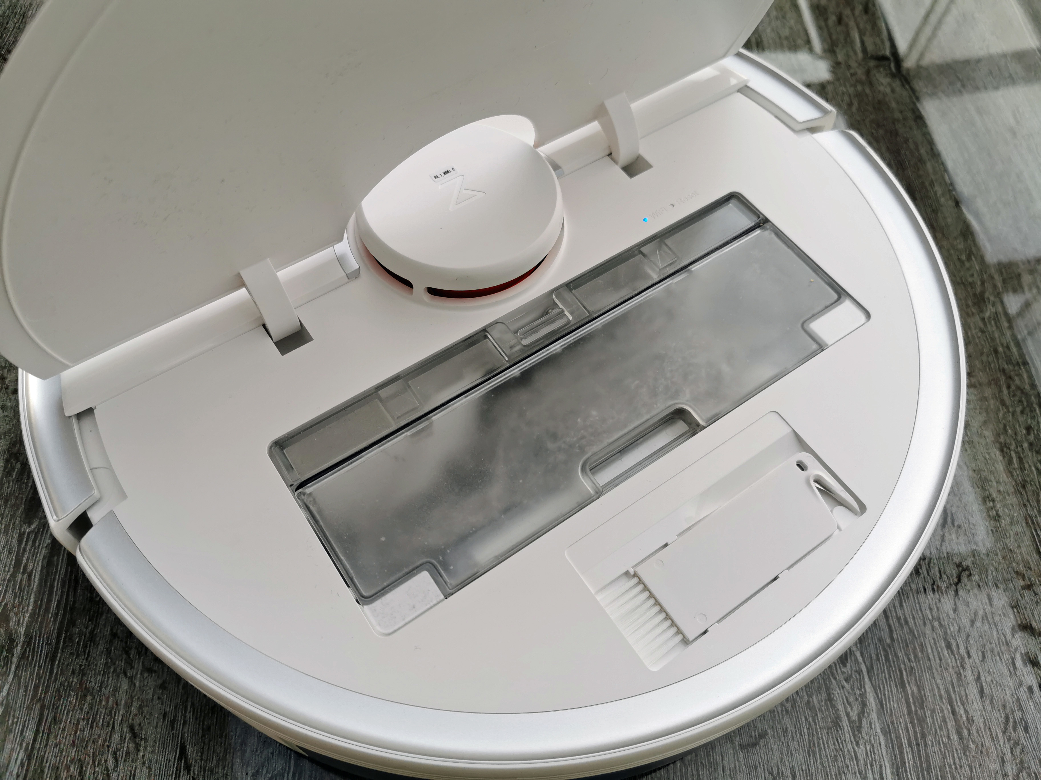 Die glänzende Oberseite des Roboters lässt sich zum Großteil aufklappen und gibt den Blick auf den leicht zu entnehmenden, 460 ml fassenden Schmutzbehälter und ein Reinigungswerkzeug frei. Außerdem sitzt hier ein manueller Reset-Button, der den kompletten Sauger zurücksetzt, sowie eine WLAN-Status-LED. Der Frontbumper, der bei Auffahren auf ein Hindernis zum Schutz von Möbelstücken als letzte Sicherungsebene fungiert, besteht wie der Rest des Gehäuses aus Hartplastik – hier hätten wir uns eine Gummierung gewünscht. Da der Roborock S5 Max aber normalerweise Hindernisse zuverlässig erkennt und nur sehr langsam anfährt, nutzt er den Bumper wirklich nur zur letzten Absicherung. Eine Beschädigung ist daher vermutlich auch bei Weichholzmöbeln nicht zu befürchten. Vorn und auf der rechten Seite des Bumpers sind Sensoren zur Hinderniserkennung im Nahbereich zu sehen.