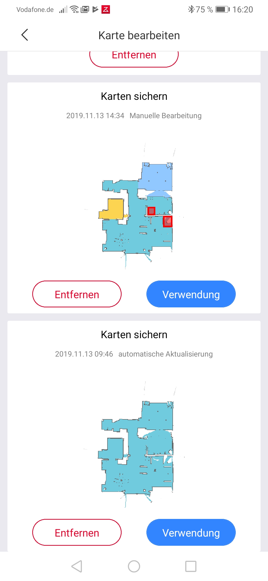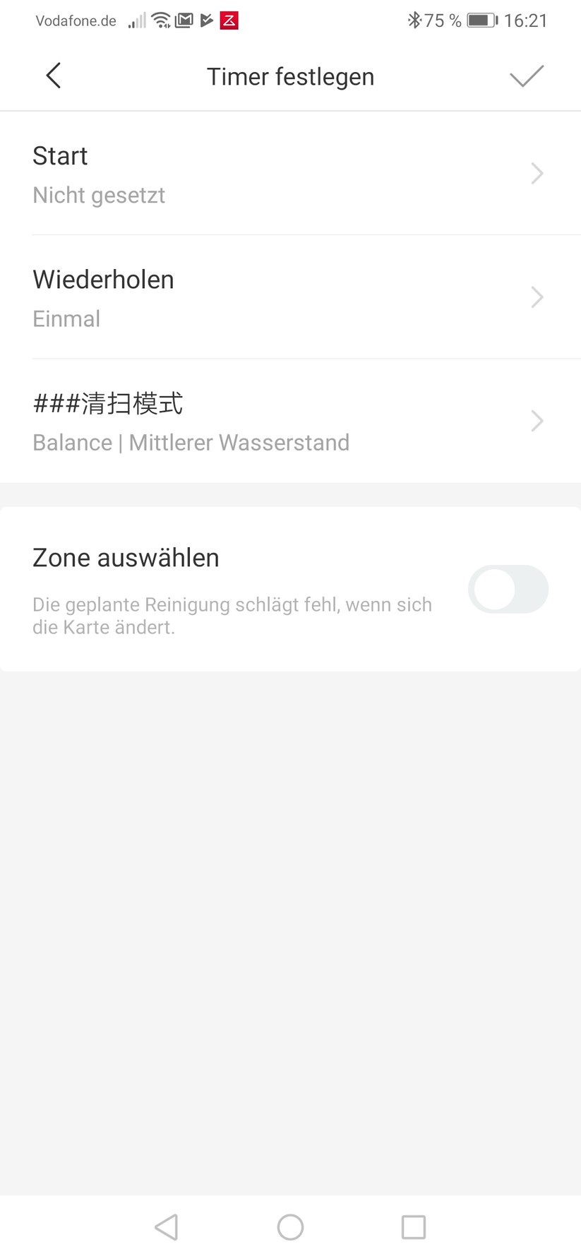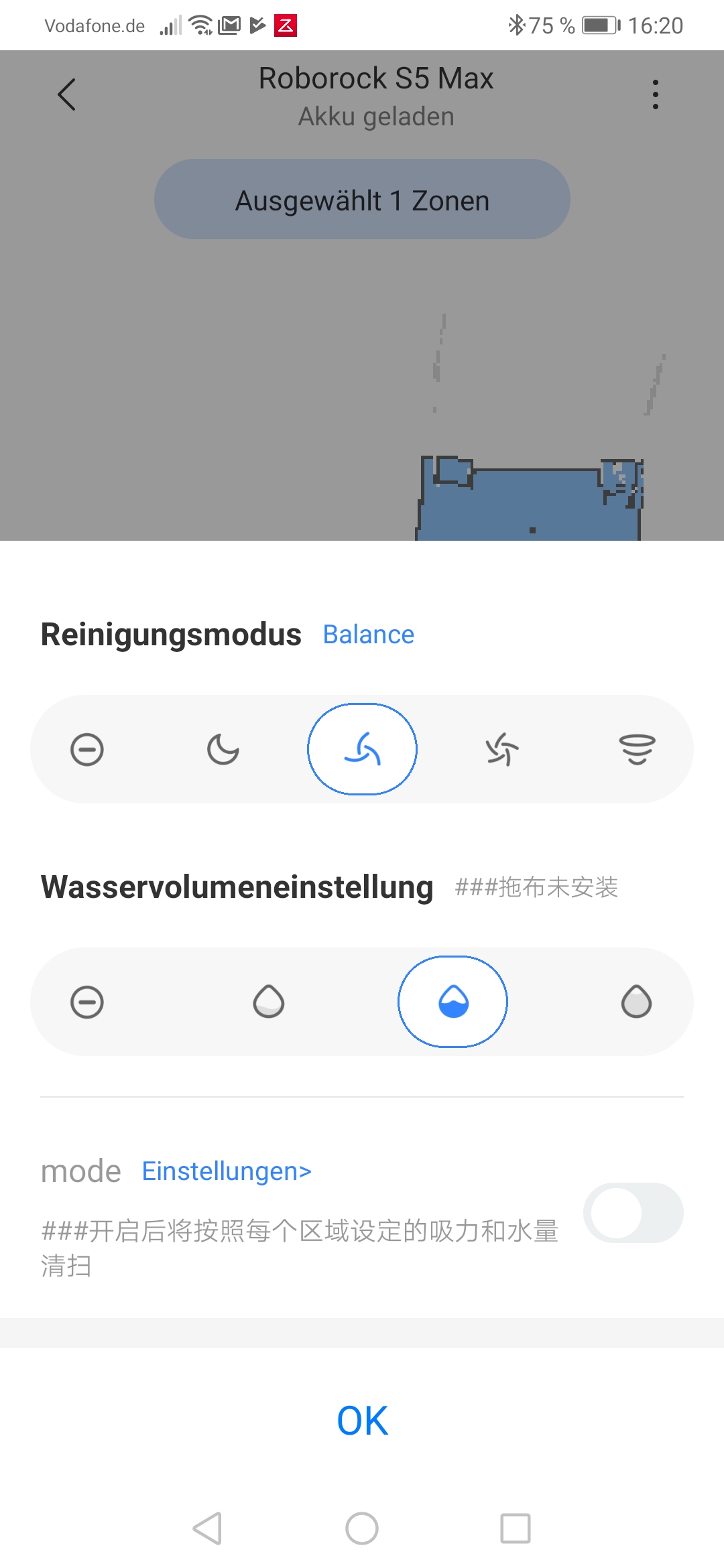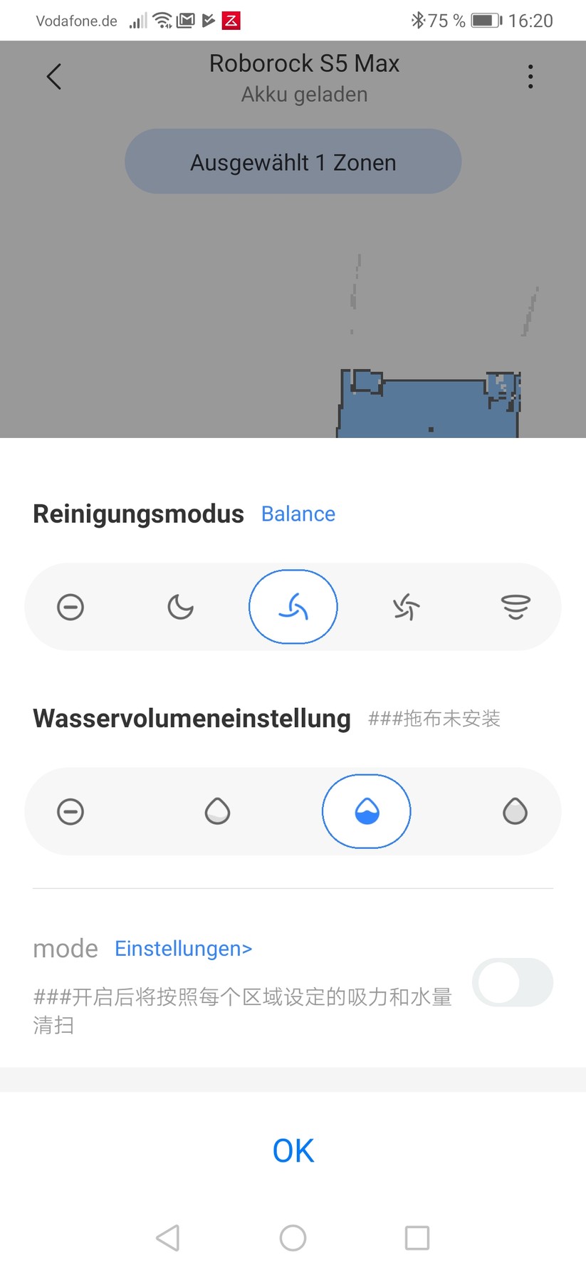 Der Rest der App ist dafür vorbildlich aufgebaut. Der Nutzer darf No-Go-Areas in Form von Grenzlinien, Quadraten und sogar freier Form anlegen, temporäre Zonen einzeichnen, die der Bot ein-, zwei- oder dreimal säubern soll und insgesamt drei Karten Speichern. Dabei handelt es sich um zwei Versionen älterer Reinigungsflächen und eine aktuelle Karte. Schon neu eingerichtete Sperrzonen gelten dabei als neue Karte und überschreiben die älteste Karte – das ist gerade zu Beginn, wo man noch viel herumexperimentiert, suboptimal gelöst. An anderer Stelle hat Xiaomi mehr Hirnschmalz investiert. So darf nicht nur die Saugintensität und – beim S5 Max neu – die Wasserintensität per App eingestellt, sondern beides abhängig von der Reinigungszone gespeichert werden. Dafür wird der Punkt „Mode Einstellungen“ verwendet, der ansonsten in chinesischer Schrift über seine Funktion aufklärt. Das Einstellen unterschiedlicher Reinigungsleistungen funktionierte bei uns ebenfalls nicht mehr, nachdem wir wie oben beschrieben Zonen per Workaround erstellt hatten.