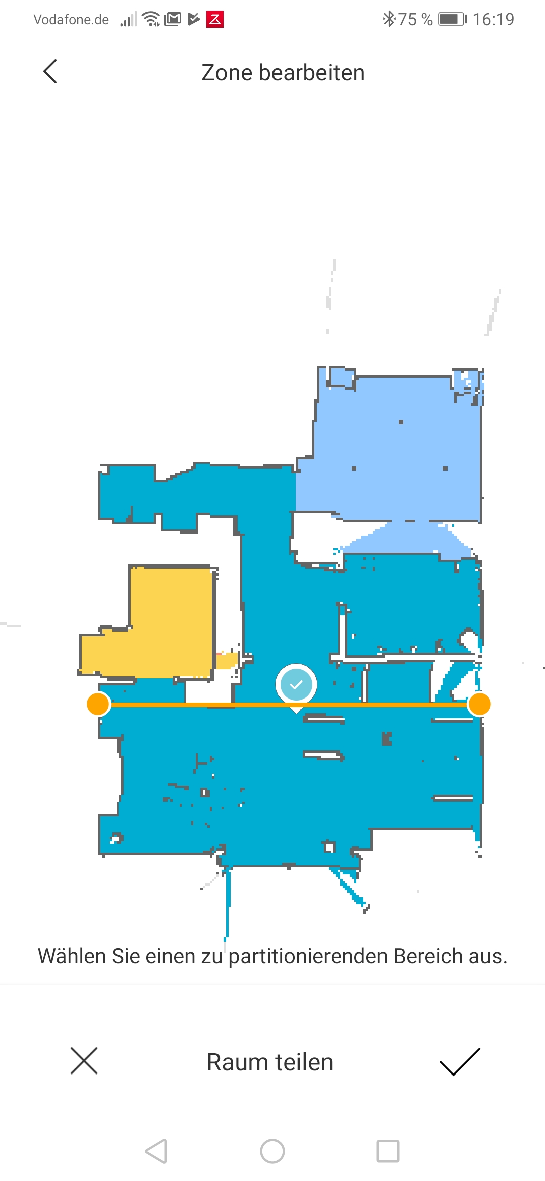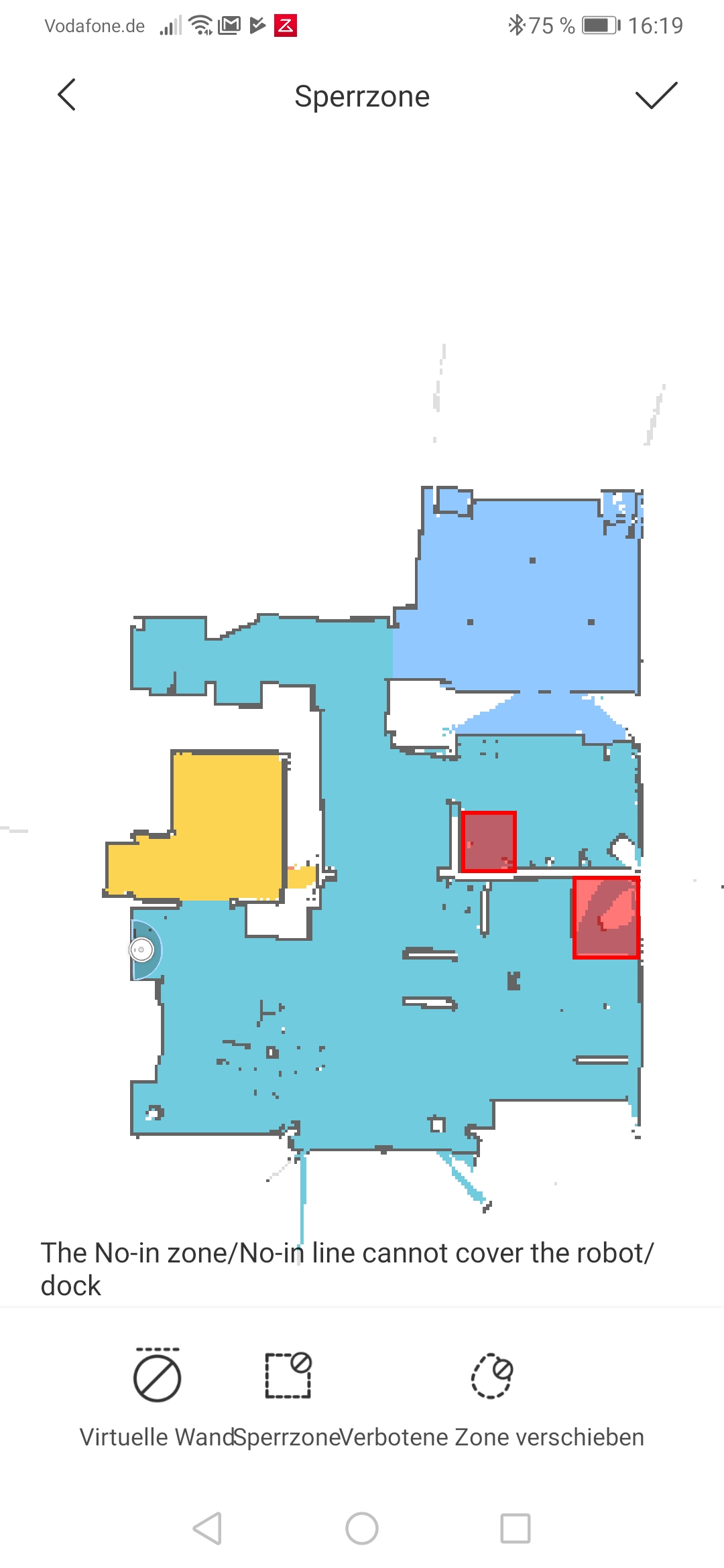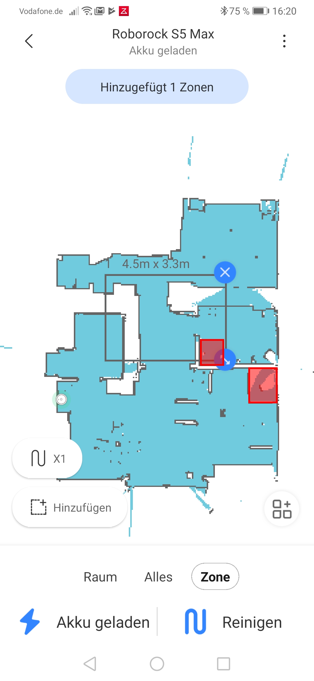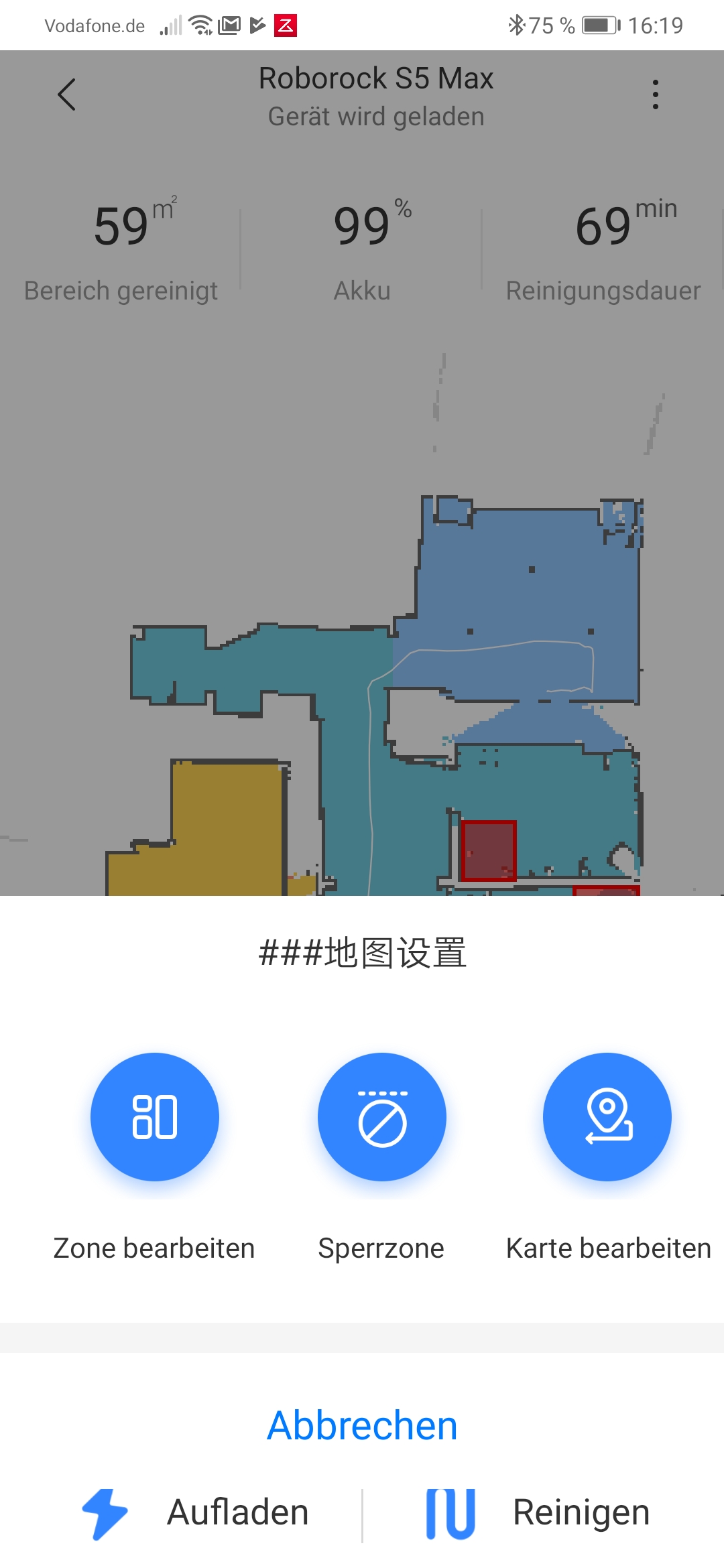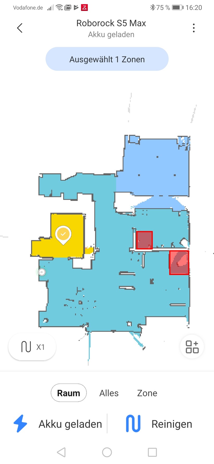 Xiaomi bat uns, den Roboter vorerst mit der Roborock-App zu testen und nicht mit der Mi-Home-App – diese sei „noch nicht ganz startklar“, hieß es. Alles funktioniert allerdings leider auch in der Roborock-App nicht. So finden sich in der deutschen Lokalisierung noch Menüpunkte mit chinesischen Schriftzeichen und es funktioniert noch nicht alles wie gewünscht. Das gilt nicht nur wie zuvor beschrieben für die Sprachbefehle, sondern leider auch für die Raumerkennung. Denn eigentlich sollte der Roborock S5 Max nach dem Erstellen der Karte einzelne Räume definieren oder zumindest eine entsprechende Einteilung erlauben, in unserem Test wurde das mit dem Hinweis, wir mögen bitte die Reinigungszone überprüfen, abgelehnt. Lediglich über einen Umweg, nämlich durch das Aufteilen eines Raumes (bei uns der ganzen Etage) war es bisweilen möglich, mit viel Aufwand einzelne Räume zu erstellen. Komplett funktionierte das aber auch dort nicht und wir konnten nicht alle Bereiche als Raum definieren. Eine mögliche Ursache: Nicht alle Räume waren komplett geschlossen, so wurde etwa im Schlafzimmer ein Spiegelschrank nicht erkannt und entsprechend in der App keine durchgehende Wand gezogen. Dieses Problem haben alle Staubsaugerroboter mit Laser-Navigation: Spiegel und vor allem Glastüren werden nicht erkannt. Beim S5 Max scheint das dazu zu führen, dass ein wichtiges Feature nicht funktioniert. Die entsprechende Funktion ist allerdings in der App auch als Beta gekennzeichnet und dürfte früher oder später per Update überarbeitet werden.