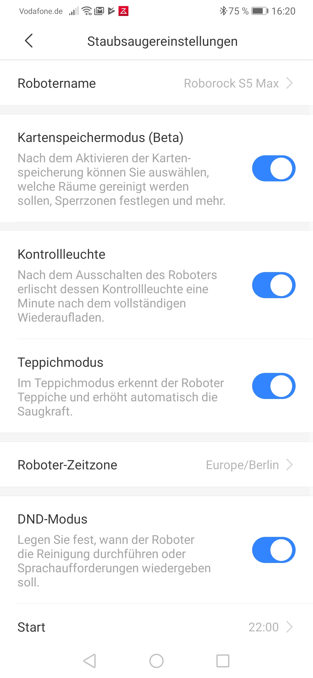 Die weiteren Funktionen sind in der Oberklasse üblich. Darunter fallen das Erstellen von Zeitplänen, nach denen der Roboter automatisch reinigt, automatische Saugkraftanhebung beim Befahren von Teppich und ein definierbares Zeitfenster, in dem der Roboter keinerlei Aktivitäten wie Reinigung oder Sprachbestätigungen von sich geben soll. Letzteres tut der Roboter gern – egal ob Laden, Reinigen, Festfahren oder das Einsetzen des beiliegenden Mopps: Alles wird per (auf Wunsch) deutscher Spracheausgabe dokumentiert. Diese Mitteilsamkeit macht den Roborock S5 Max zumindest ein bisschen menschlich – vor allem dann, wenn man ihn per App sucht und ein fröhliches „hey, hier bin ich!“ ertönt.