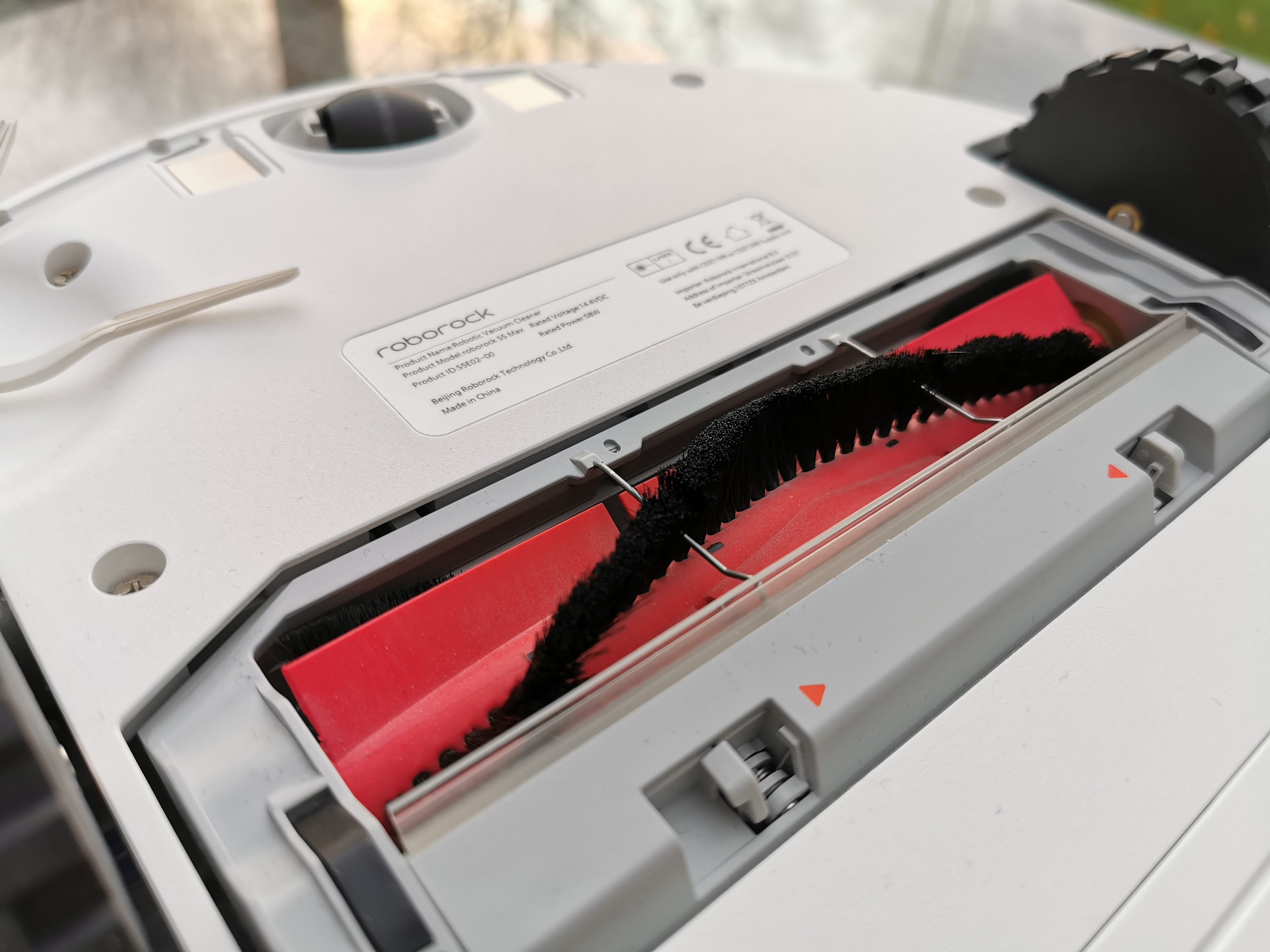 Der hintere, untere Bereich des Saugroboters ist vom großen, rund 290 ml fassenden Wassertank geprägt. Er lässt sich ebenfalls sehr einfach mit nur einem Klick entfernen. Die zentral unter dem Roboter platzierte Hauptbürste ist zu S5 und S6 kompatibel und weist eine Anordnung der Bürstenreihen in Wellenform auf. Das reduziert das Geräusch, wenn die Borsten auf Hartboden treffen. Die vorne rechts angebrachte Seitenbürste besteht wie schon beim Roborock S6 nicht mehr aus einzelnen Kunststoffborsten, sondern aus fünf gummierten Bandpaaren. Das soll vermutlich die Haltbarkeit der Seitenbürste erhöhen, da das jetzt verwendete Material stabiler ist.