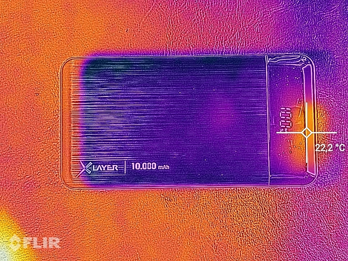 Im Ruhestand verhält sich die Powerbank unauffällig und hat Umgebungstemperatur. Selbst beim Laden erreicht der vordere Bereich des Gehäuses eine Temperatur von nur 22,5 °C.