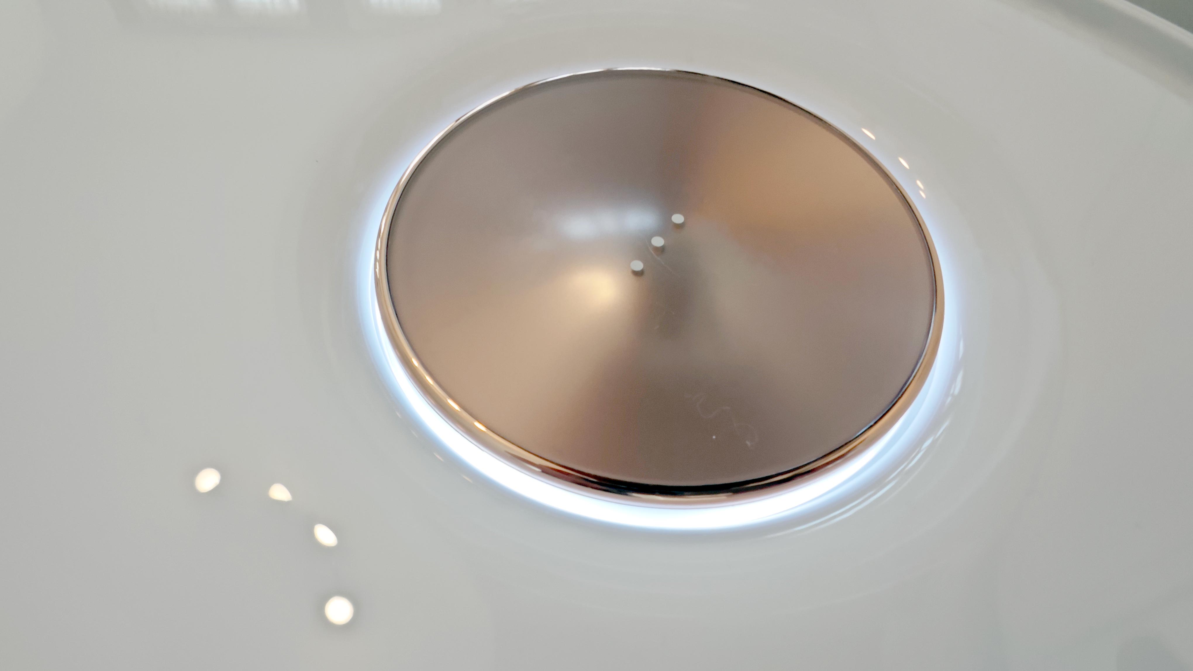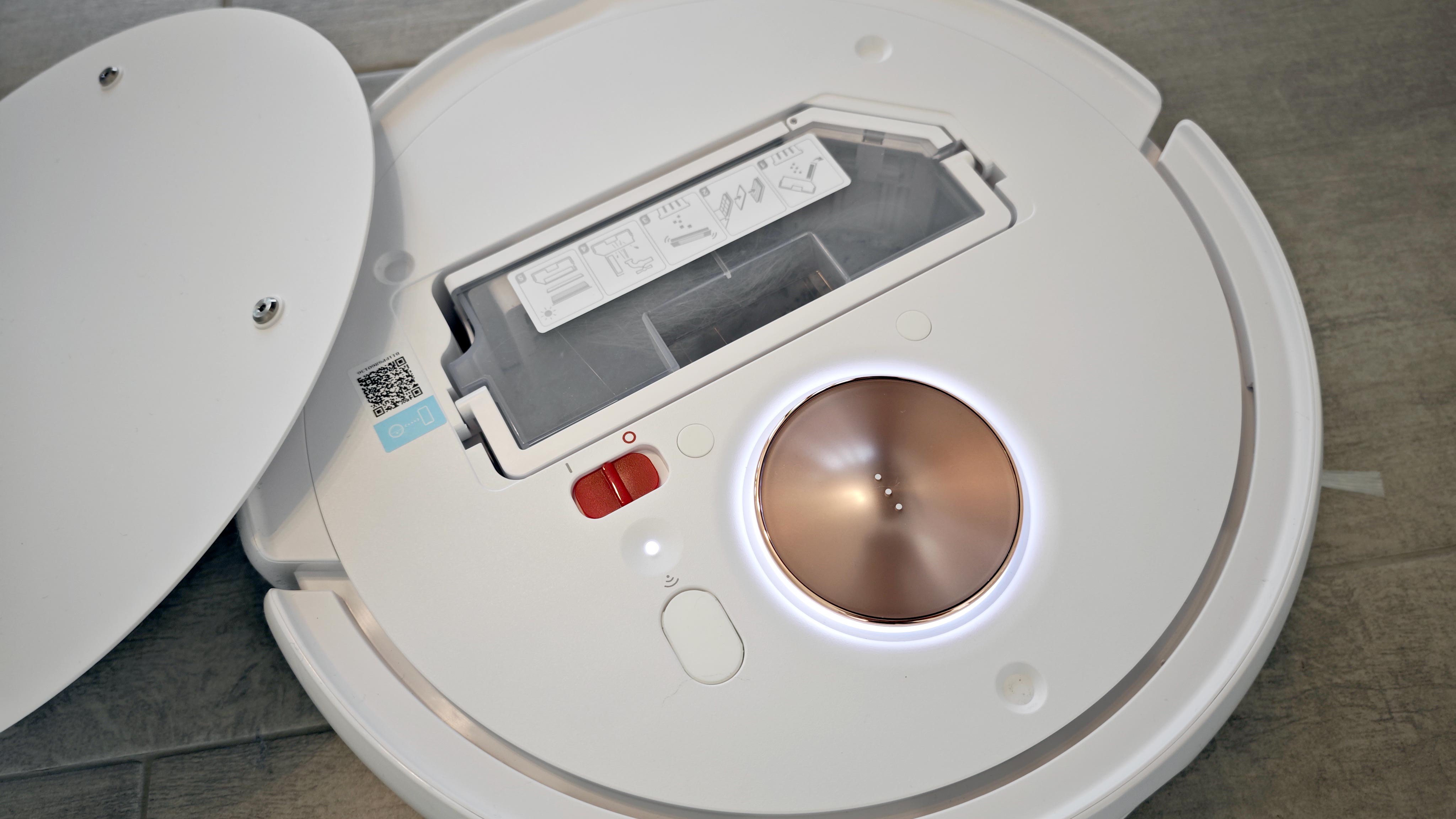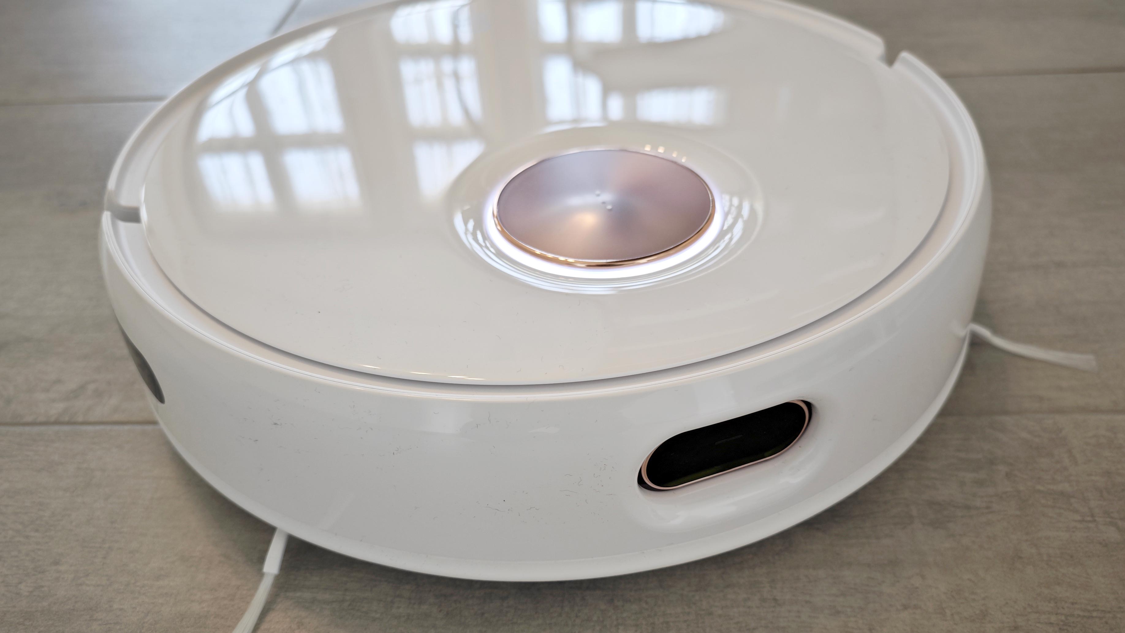 Beim Design macht die neue Yeedi Floor 3 Station einen großen Sprung – bei Roboter und Station. Der neue Roboter wirkt insgesamt eleganter und kommt mit mehr abgerundeten Kanten und bronzefarbenen Elementen. So gibt es auf der Oberseite einen angedeuteten „Laserturm“, der von einem RGB-LED-Streifen eingefasst wird. Einen Laserturm hat der Roboter nicht, daher handelt es sich nur um ein Design-Element, in dessen Mitte eine Sensortaste zum Steuern des Roboters vor Ort installiert ist. Elemente wie der Hauptschalter sind nun ins Innere des Roboters gewandert, sie sind unter der magnetisch gehaltenen und komplett entfernbaren oberen Abdeckung versteckt. Das erinnert an Konzernmutter Ecovacs.