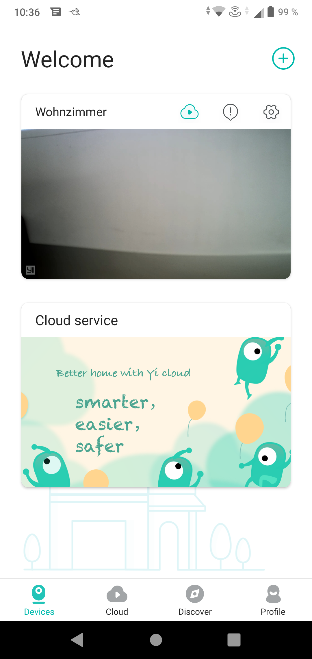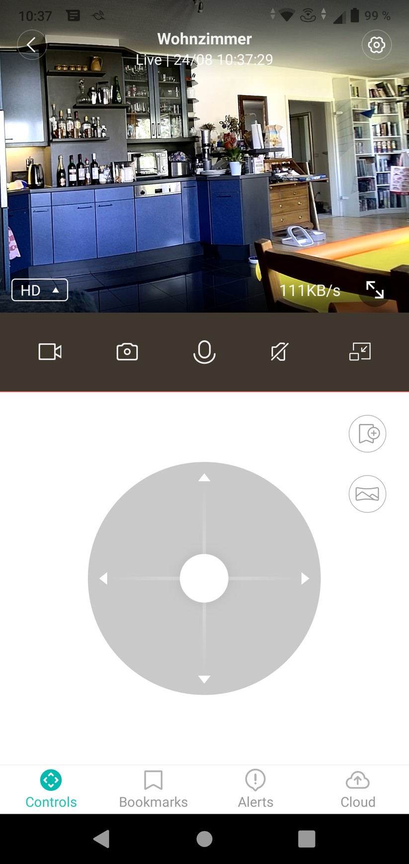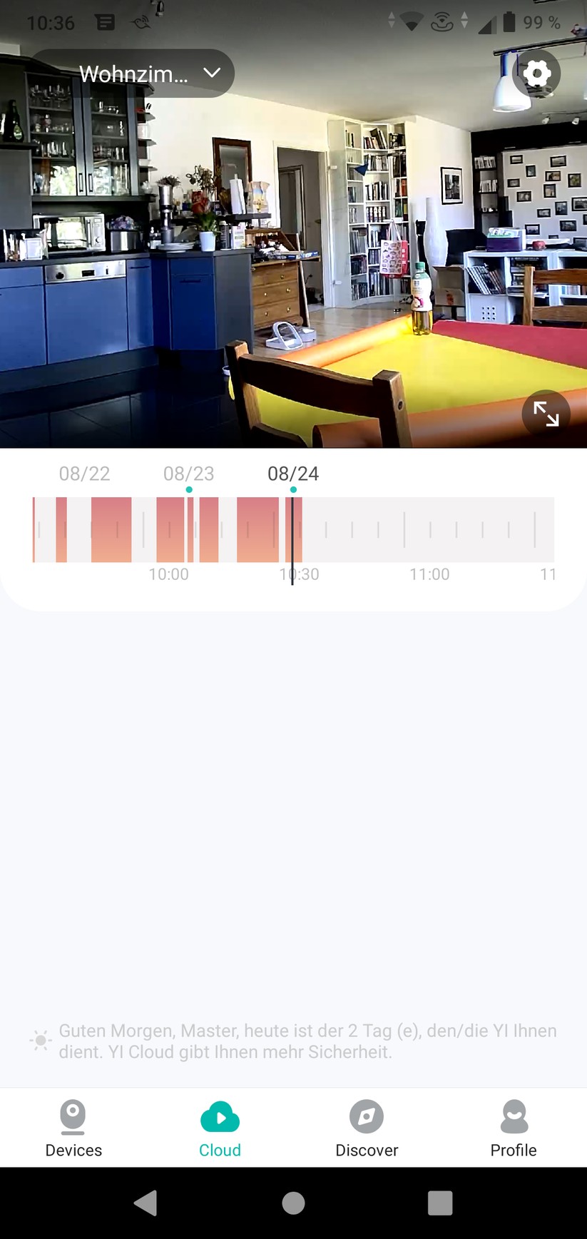 Die YI-Home-App ist einfach und übersichtlich aufgebaut. Auf der Startseite erhält der Nutzer Zugriff auf seine Kameras, Cloud-Aufzeichnungen und sein Nutzerprofil. In letzterem darf sogar noch ein Alarm-Ton eingestellt werden – für eine Funktion wohlgemerkt, die nicht mehr existiert. Die Kamera erlaubt eine zeitlich unbegrenzte Live-Sicht, in der sie motorisch gedreht werden darf. Außerdem sind hier Zwei-Wege-Kommunikation, manuelle Aufnahme von Video und Foto sowie die „Einblendung in anderer App“ möglich. Gemeint ist damit die Einblendung eines Videofensters außerhalb der App, sodass nebenher das Smartphone anderweitig weiterverwendet werden kann.
