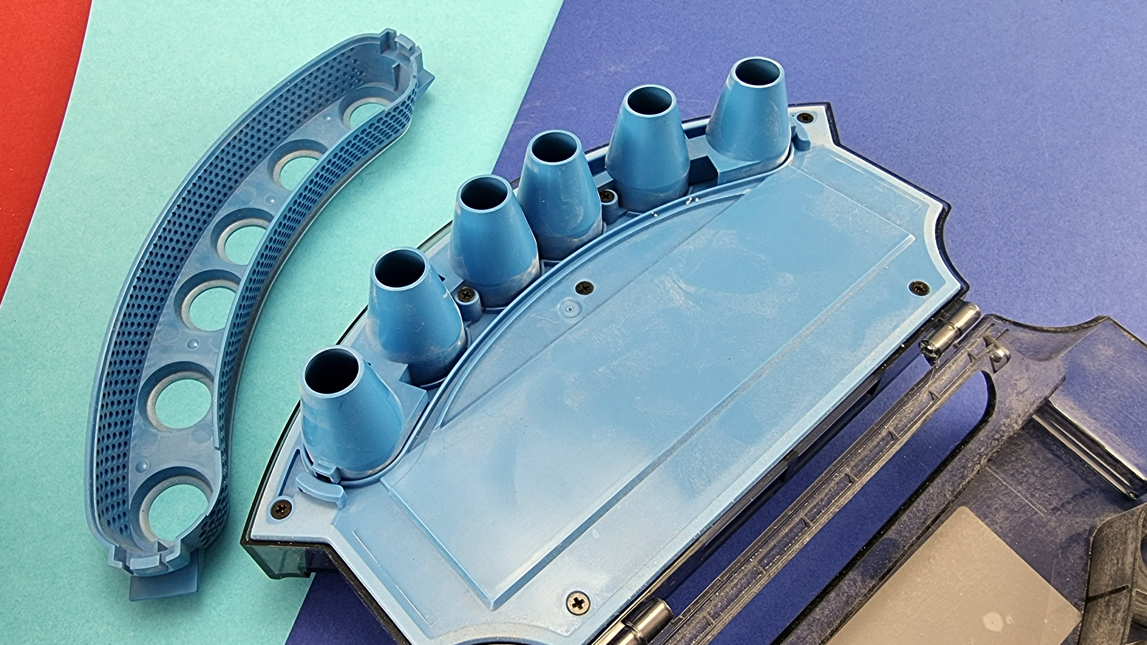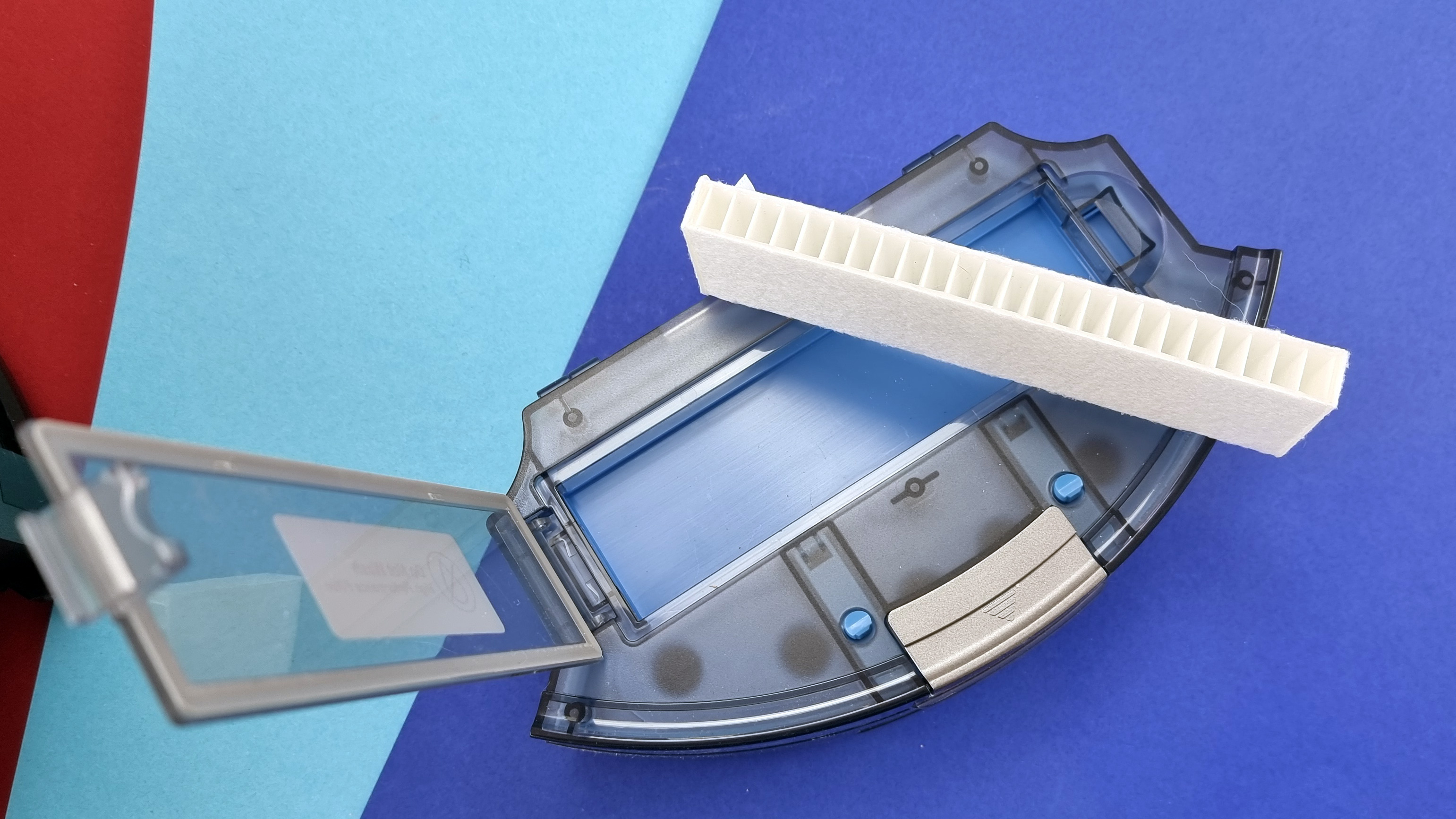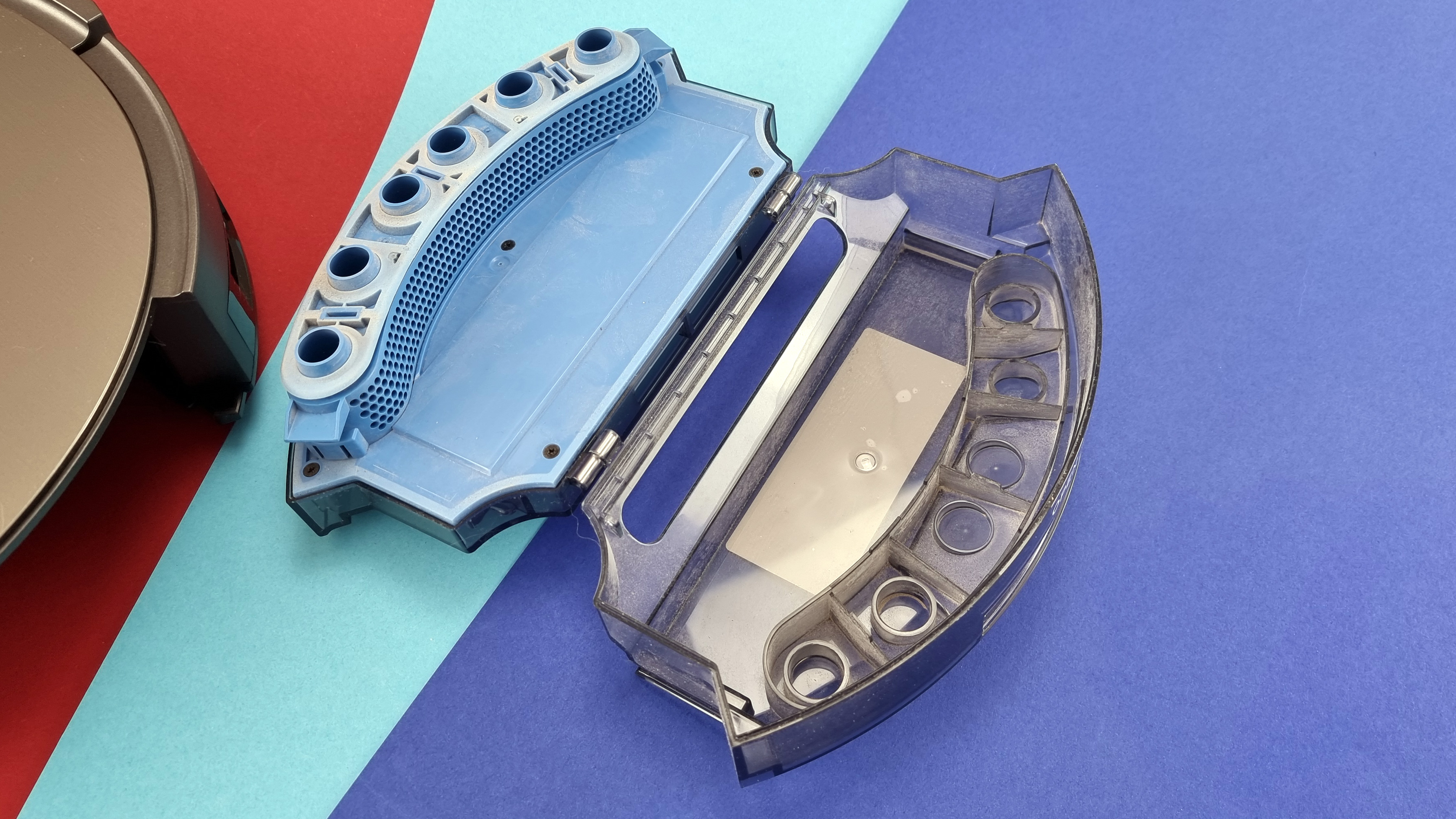 Beim Leeren des Staubbehälters zeigt sich: Der zellulare Aufbau funktioniert. Im Bereich mit den Trichtern sammeln sich keine Wollmäuse oder Haare, hier bleibt also Platz für Staub und Sand. Das Entleeren funktioniert zudem vorbildlich: Einfach aufklappen und über dem Mülleimer ausleeren. Da es keine überstehenden Kanten gibt, geht mit etwas Vorsicht dabei nichts daneben.