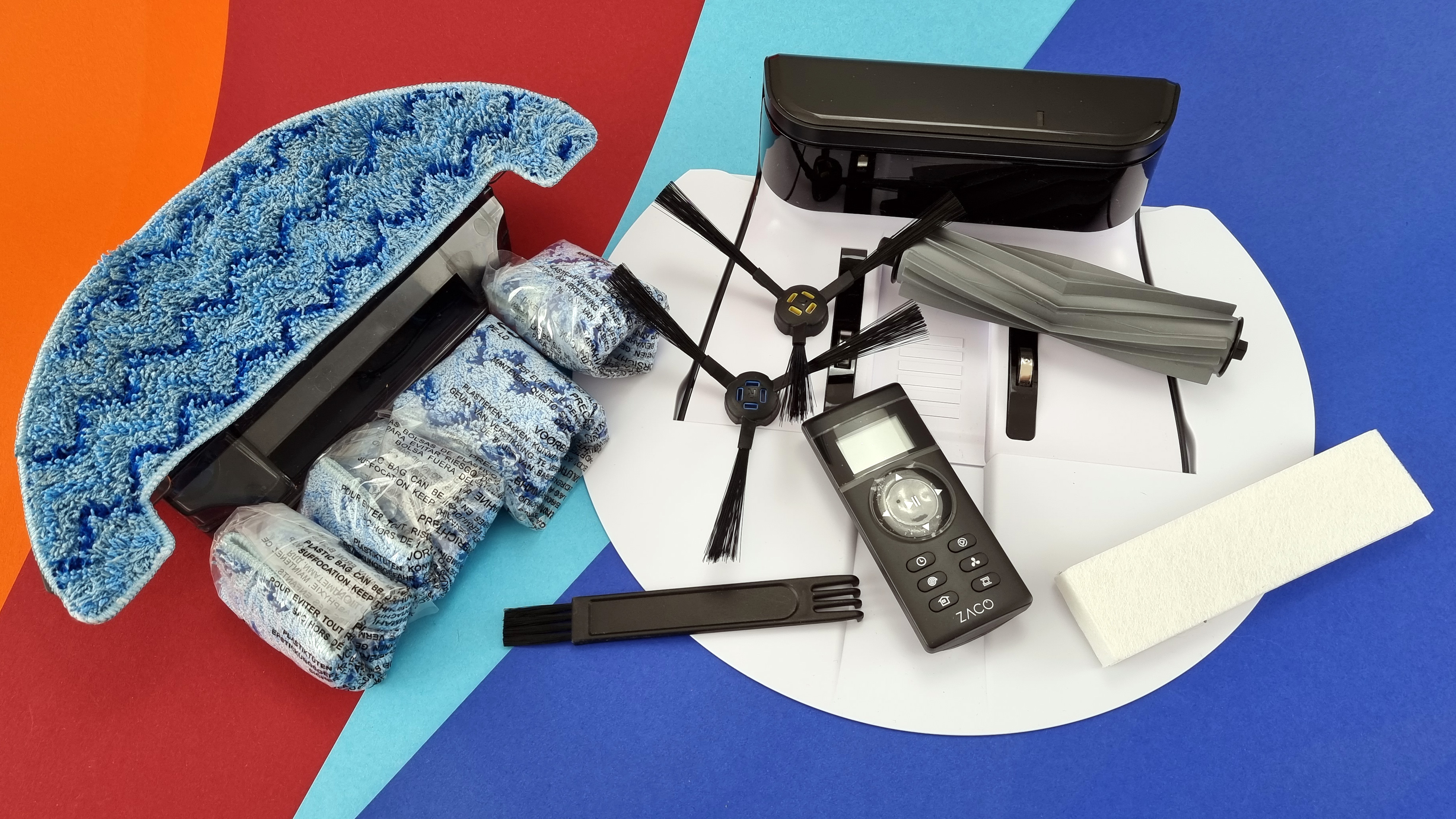 Im Vergleich zu Anbietern wie Roborock, die immer weniger Zubehör in den Lieferumfang ihrer Geräte wie etwa dem ansonsten sehr guten Roborock S7 (Testbericht) packen, ist Zaco regelrecht spendabel. Neben den Mindestzutaten wie Ladestation und Netzteil zum Laden findet der Käufer des Zaco A10 eine Fernbedienung, zwei Zusatz-Seitenbürsten, eine zusätzliche Hartbodenhauptbürste aus Gummilamellen, einen Wischaufsatz mit Wechseltuch sowie vier weiteren Wechseltücher, Ersatzstaubfilter, Säuberungswerkzeug und Bedienanleitung in Papierform.
