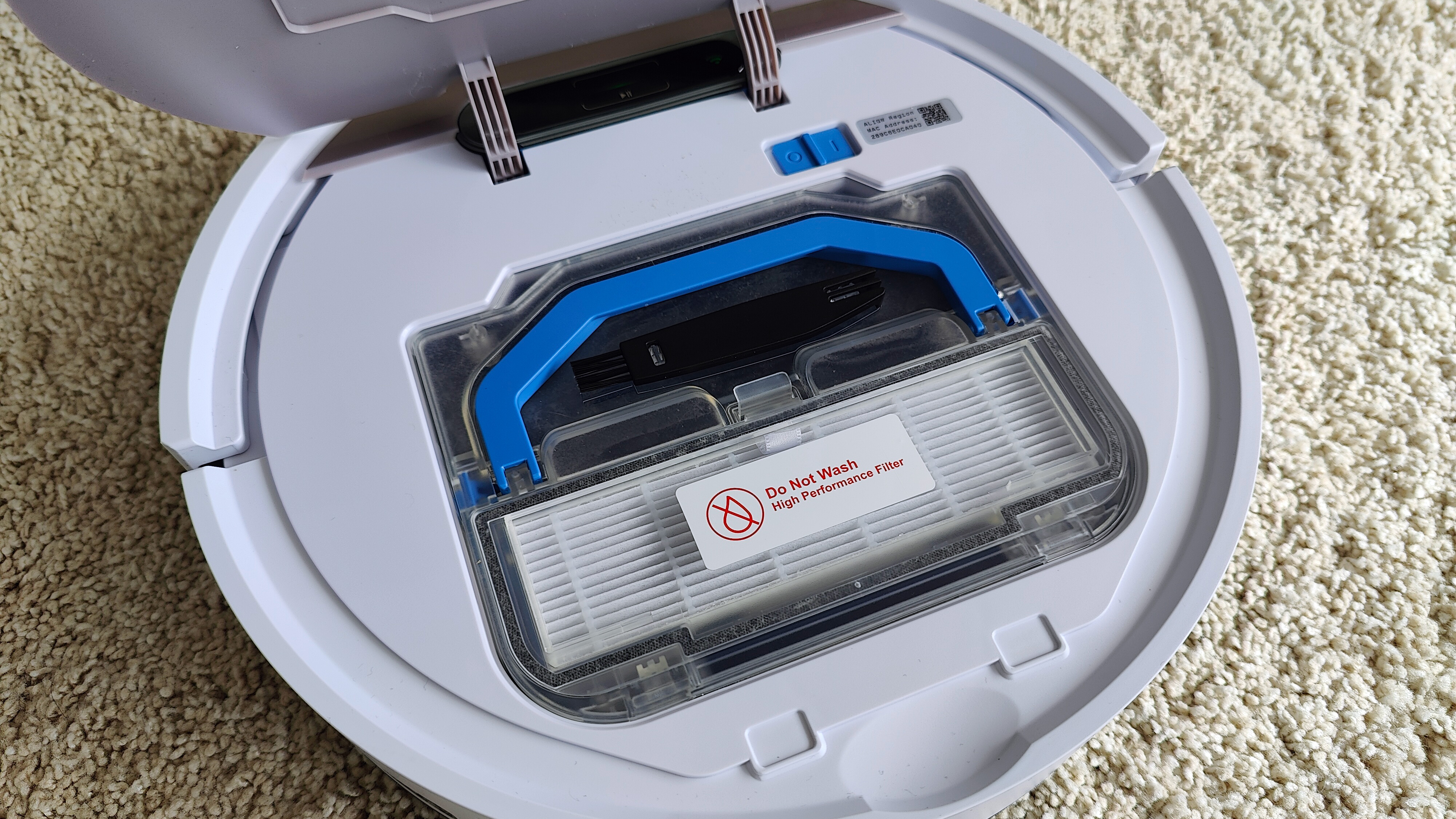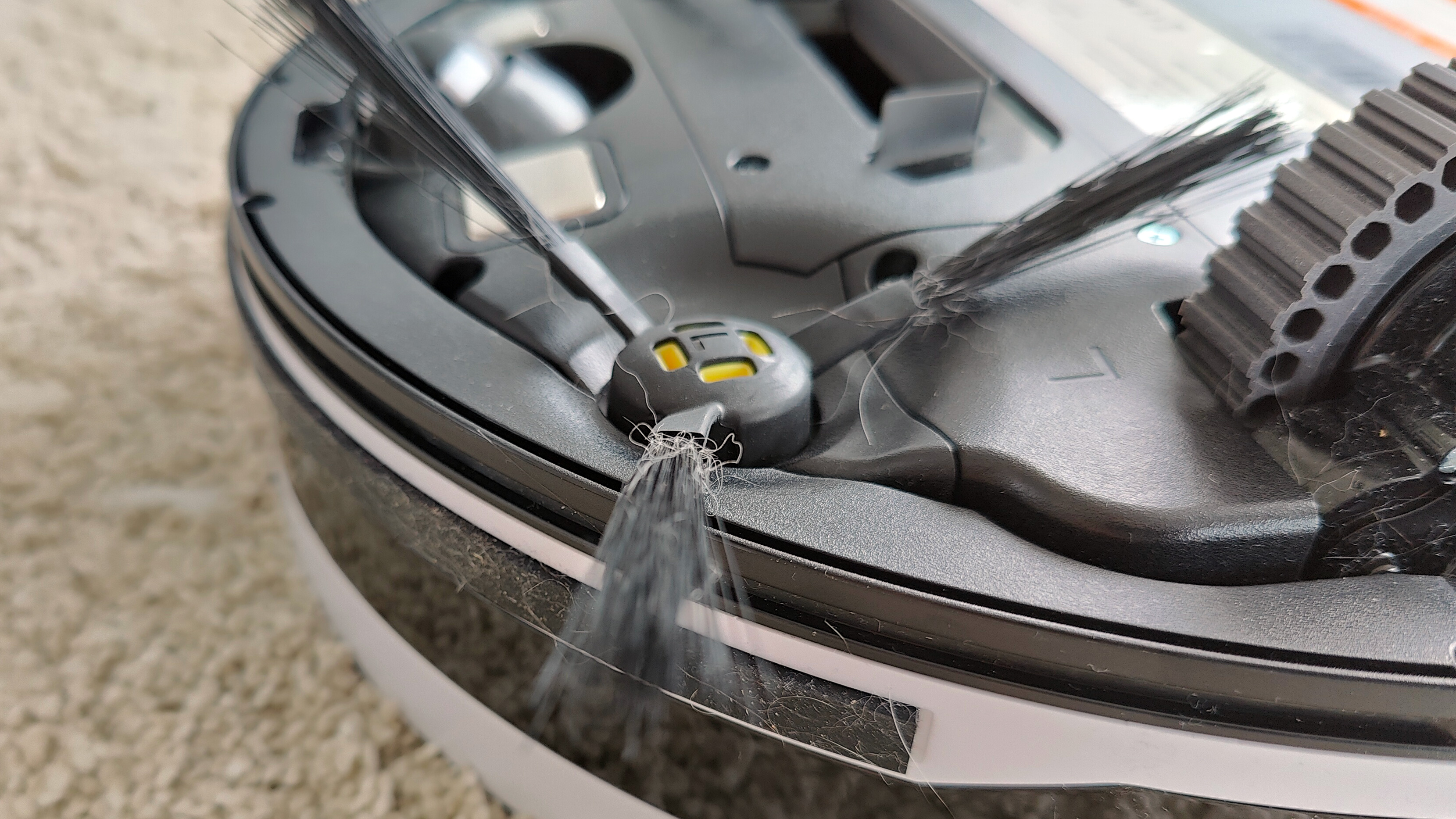 Zwei Seitenbürsten sollen in Betrieb Schmutz aus Ecken und von Rändern unter den Sauger schieben. Dort fehlt wie bereits angedeutet die typische Hauptbürste, stattdessen ragen seitlich und hinter der Saugöffnung Gummilippen bis zum Boden, um keinen Schmutz übrigzulassen. Drei Absturzsensoren sollen genau das verhindern: Abstürze von Treppen oder anderen Vorsprüngen.