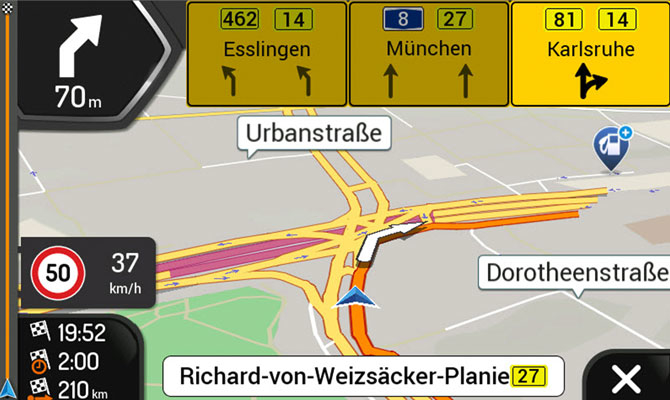 Die Navi-Funktion muss separat für rund 130 Euro erworben werden. Dafür erhält der Käufer eine microSD mit dem aktuellen Kartenmaterial, Updates sind ein Jahr lang kostenlos. Die Karte verschwindet unter einer als Bedienknopf getarnten Blende rechts unten neben dem Touchscreen. Die Navifunktion bietet sehr viele Einstellungsmöglichkeiten. Dazu gehören zahlreiche Stimmen mit und ohne Nennung von Straßennamen, anpassbarer 2D- und 3D-Darstellung, Geschwindigkeitswarnung, POIs und vieles mehr.