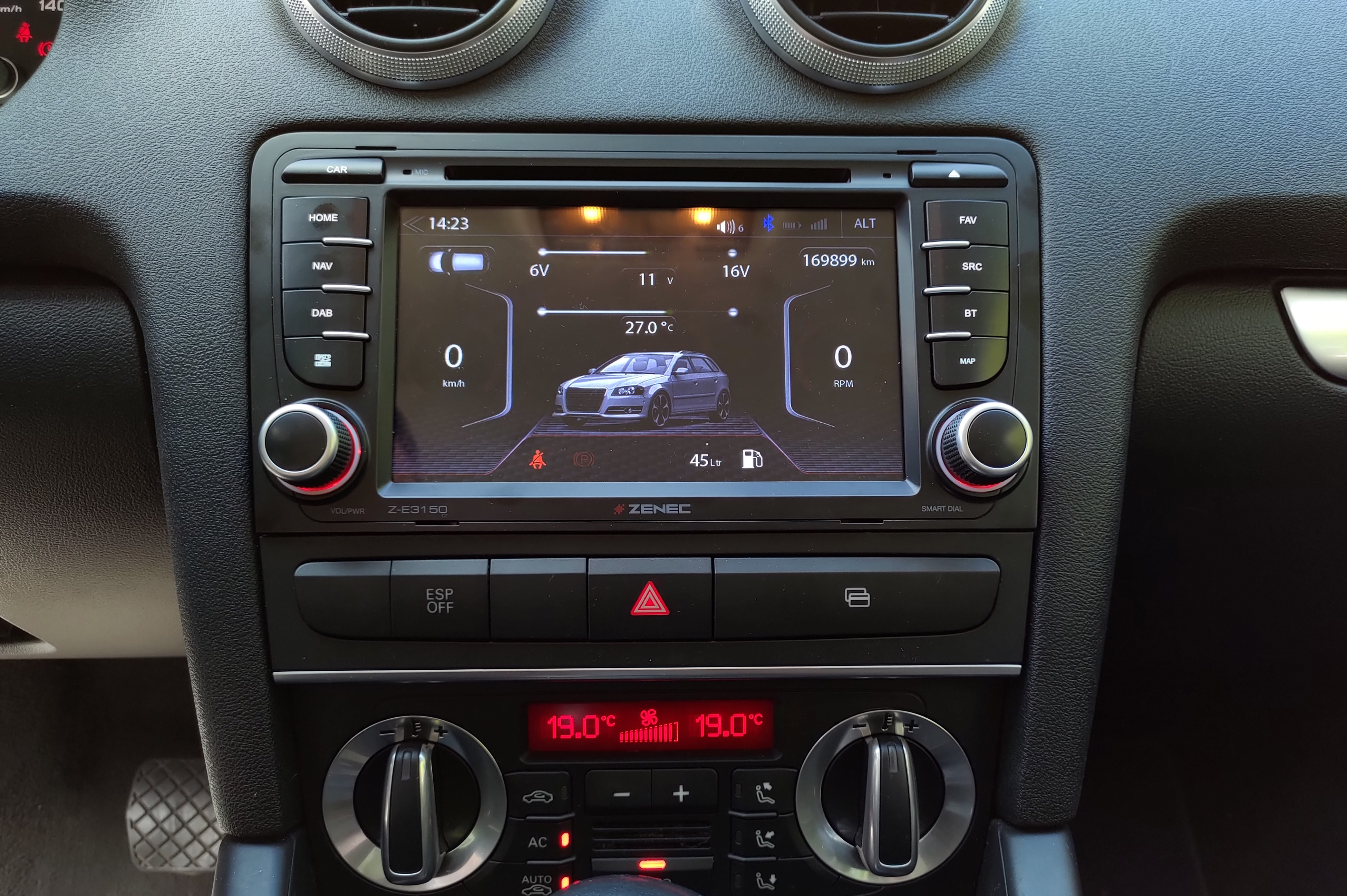 Optisch fügt sich das Zenec Z-E3150 tatsächlich nahtlos in das Design des Fahrzeugs ein. Die Anordnung der Tasten und Drehknöpfe ist zwar anders als beim Original, Optik und Haptik der Bedienelemente mit ihren Chrom-Applikationen sind aber perfekt umgesetzt. Sie können wahlweise rot oder weiß beleuchtet werden. Der Zenec-Naviceiver mit seiner Mischung aus Hardware-Tasten und Touchscreen-Bedienung passt exakt zum A3.