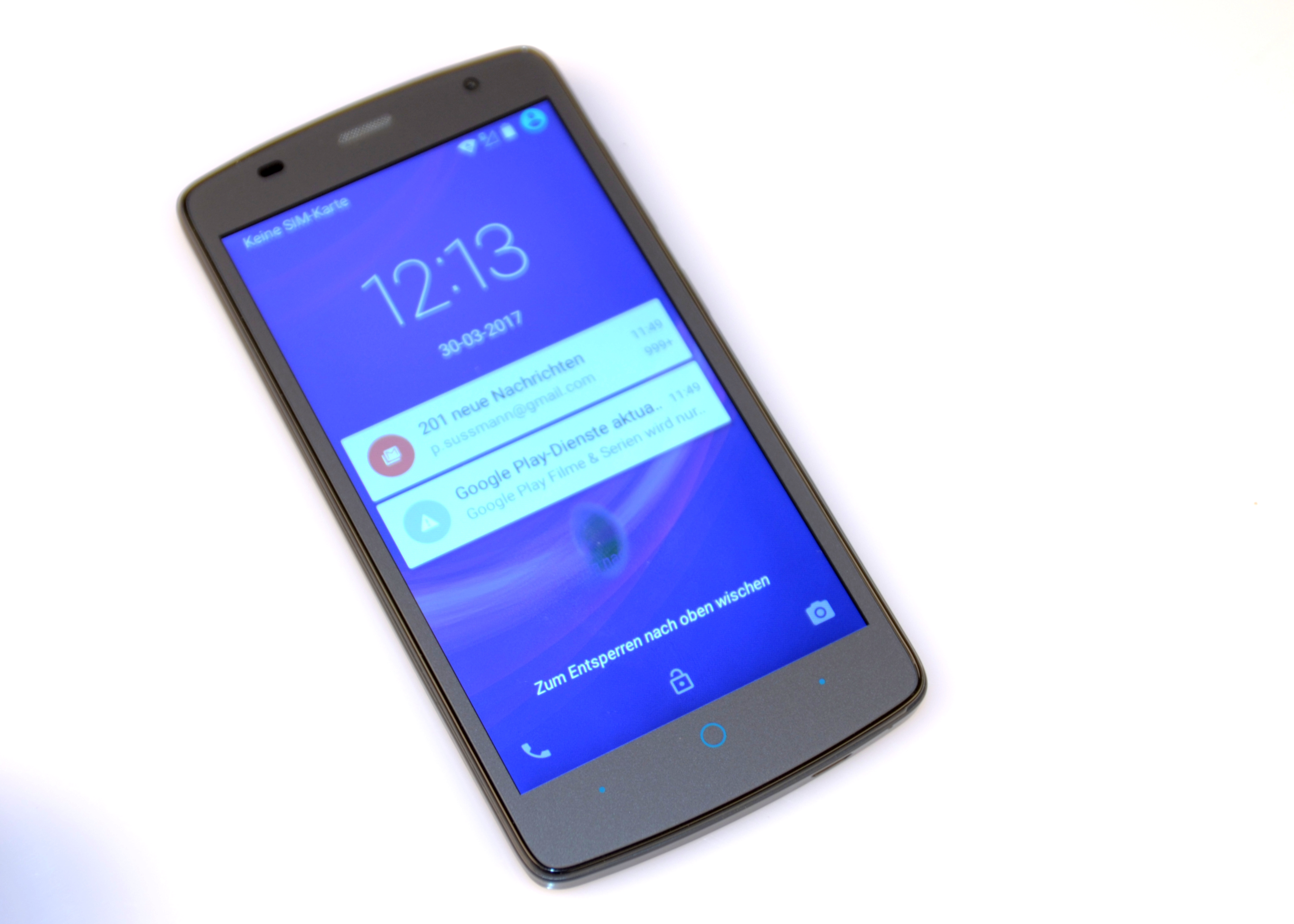 Das Gewicht mit 142 Gramm ist für ein 5-Zoll-Gerät in Ordnung. Es liegt gut in der Hand und fühlt sich, trotz jeder Menge Kunststoff, nicht billig an. Obwohl es einen recht stabilen Eindruck macht: Ein fester Druck auf den Bildschirm führt sofort zu kurzfristigen Verfärbungen – das sollte bei aktuellen Geräten eigentlich nicht mehr passieren.