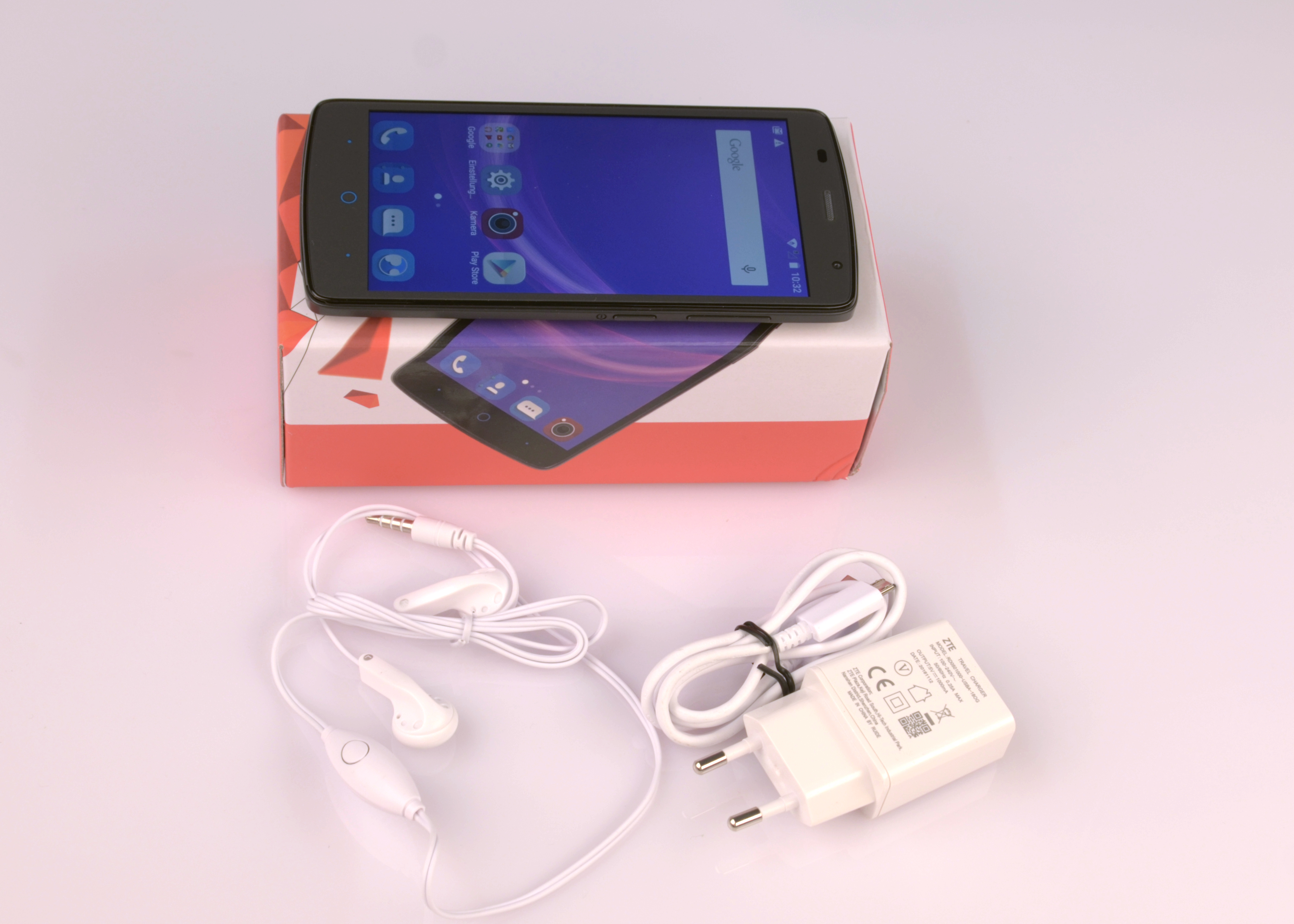 Das Smartphone kommt immerhin in einer ordentlichen Verpackung bei uns an. Das Zubehör besteht aus Micro-USB-Ladekabel, Netzteil und einfachem In-Ear-Headset. Viele Markengeräte kommen mittlerweile ohne Netzteil und Headset, was daran liegt, dass USB-Netzteile in den meisten Haushalten vorhanden sind und die Qualität der mitgelieferten Kopfhörer meist wirklich schlecht ist. Das Gerät selbst sieht recht unspektakulär aus, macht aber keinen schlechten Eindruck. Der Rückendeckel ist komplett aus Kunststoff und zieht sich über die Seitenränder bis hoch zum Display. Sehr positiv: der Rand ragt sogar ein kleines Stück über das Display hinaus, so dass das Blade nicht direkt auf dem Display aufliegt, wenn es mit dem Bildschirm nach unten zeigt. Das schützt vor Kratzern.