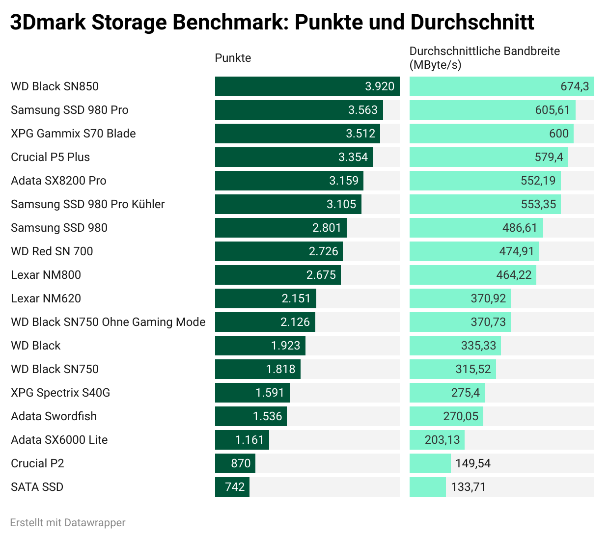Für die Platzierung der Speicher verwenden wir die Gesamtpunktzahl, die uns der 3Dmark auswirft. Das ist ein guter Richtwert, wobei es vorkommt, dass bestimmte Speicher in einzelnen Aufgaben schneller sind als eine eigentlich besser platzierte. Das betrifft etwa das Thema „Spiel aufzeichnen“ und ist daher für Streamer interessant. Wir schreiben die Stärken (und Schwächen) zu jeder NVMe-SSD dazu und tragen die Einzelwerte in eine Tabelle ein. Zum Vergleich haben wir eine SATA-SSD in den Test mit aufgenommen.