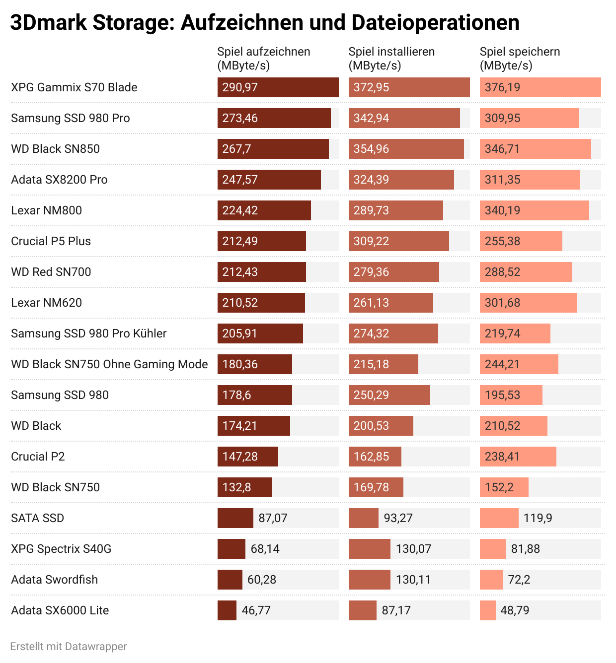 Unter dem Markennamen XPG liefert der Hersteller Adata seine Gaming- und Hochleistungs-Hardware aus. Entsprechend ist es wenig verwunderlich, dass es die XPG Gammix S70 Blade unter die Top 3 schafft. Mit 290,97 MByte/s war es sogar die schnellste NVMe-SSD beim Aufzeichnen von Spielen und wäre unser Tipp für Streamer. Auch beim Installieren und Speichern von Spielen macht sie einen guten Job – ist dann aber beim Laden langsamer. XPG legt der Gammix S70 Blade einen Heat Spreader bei.