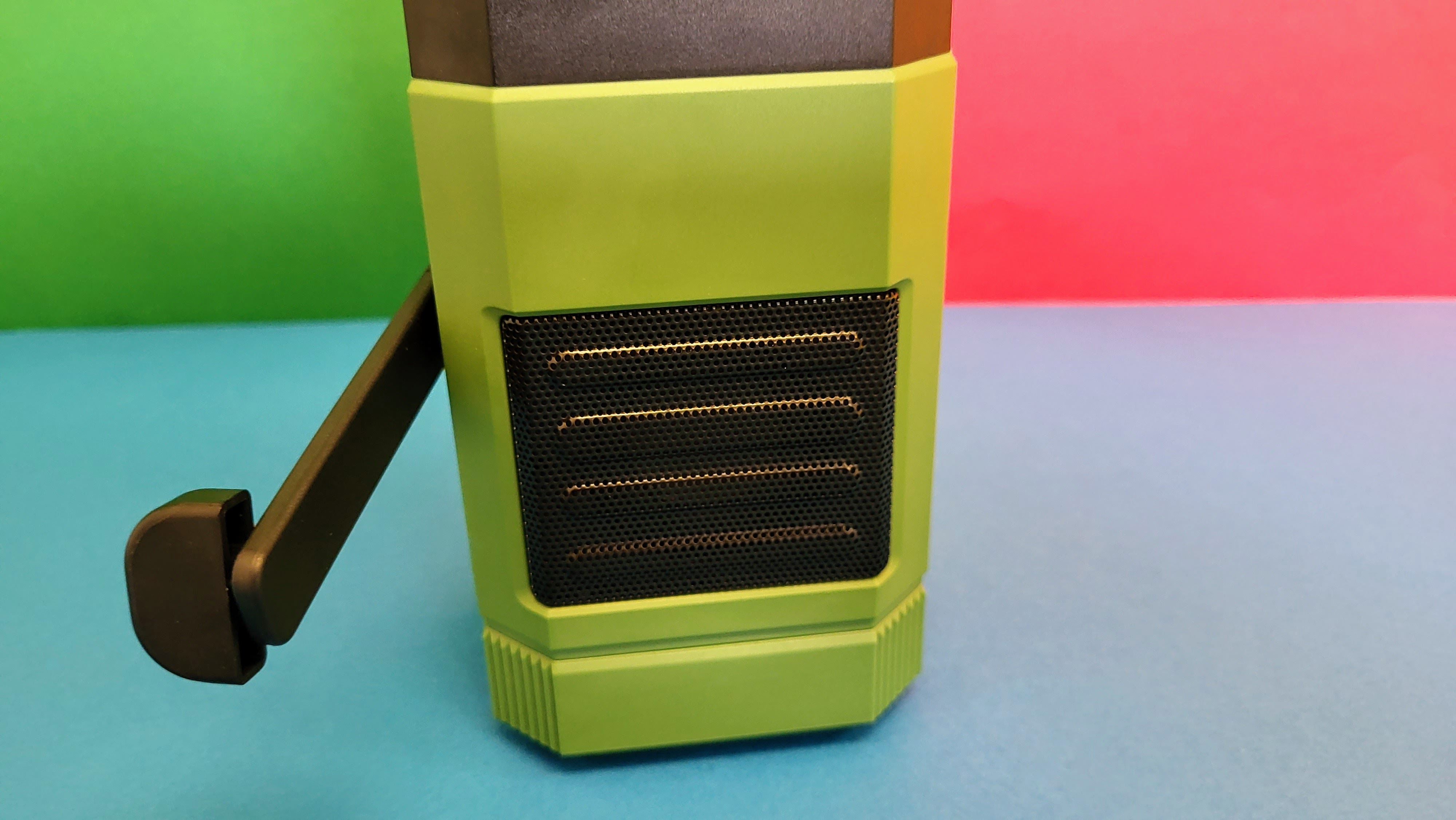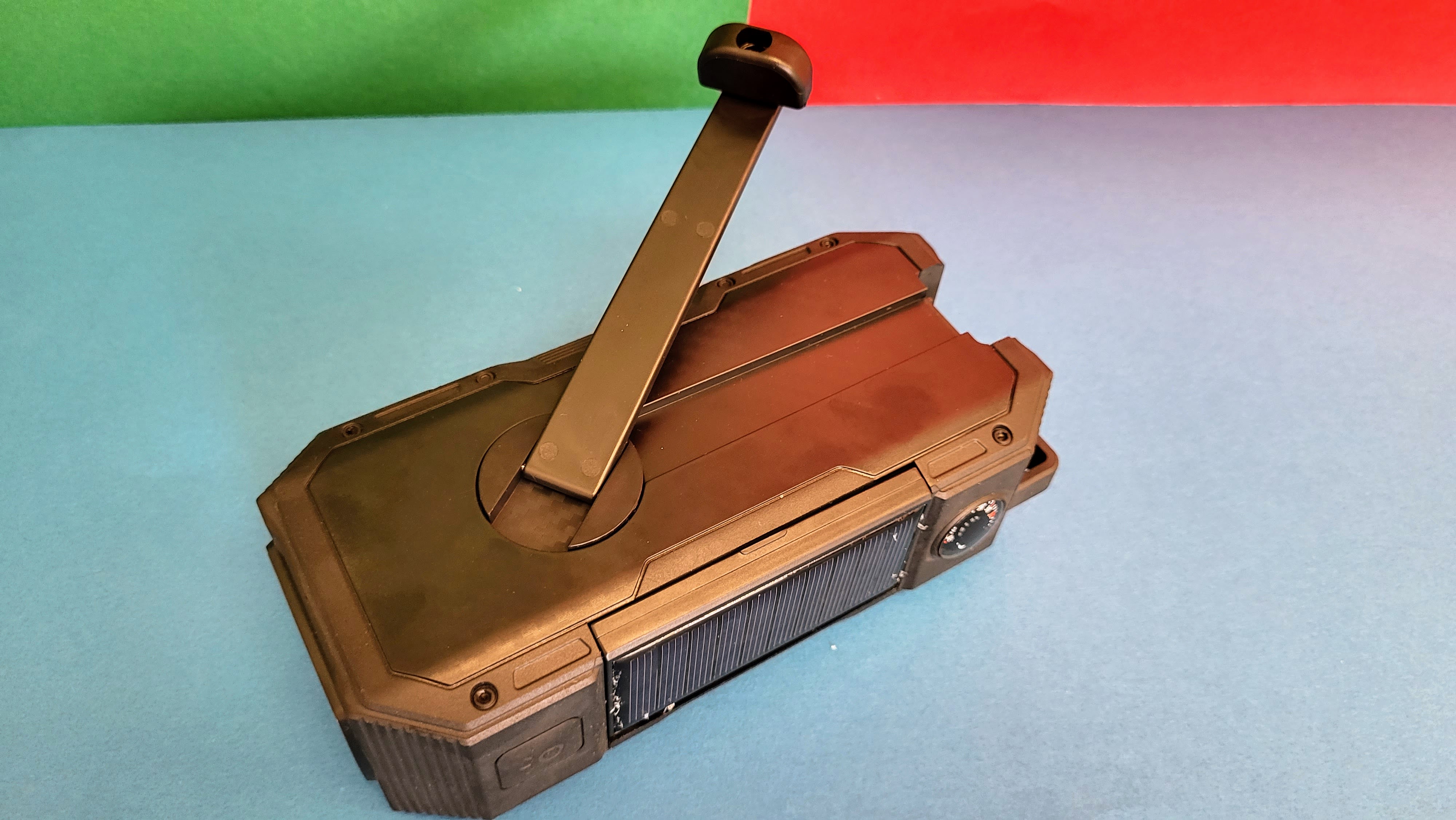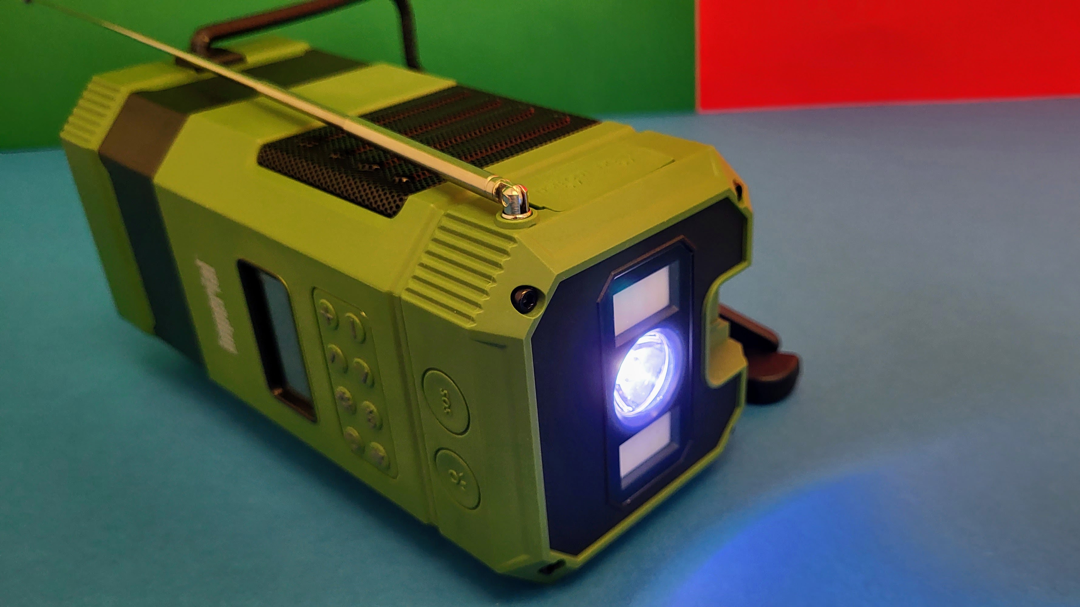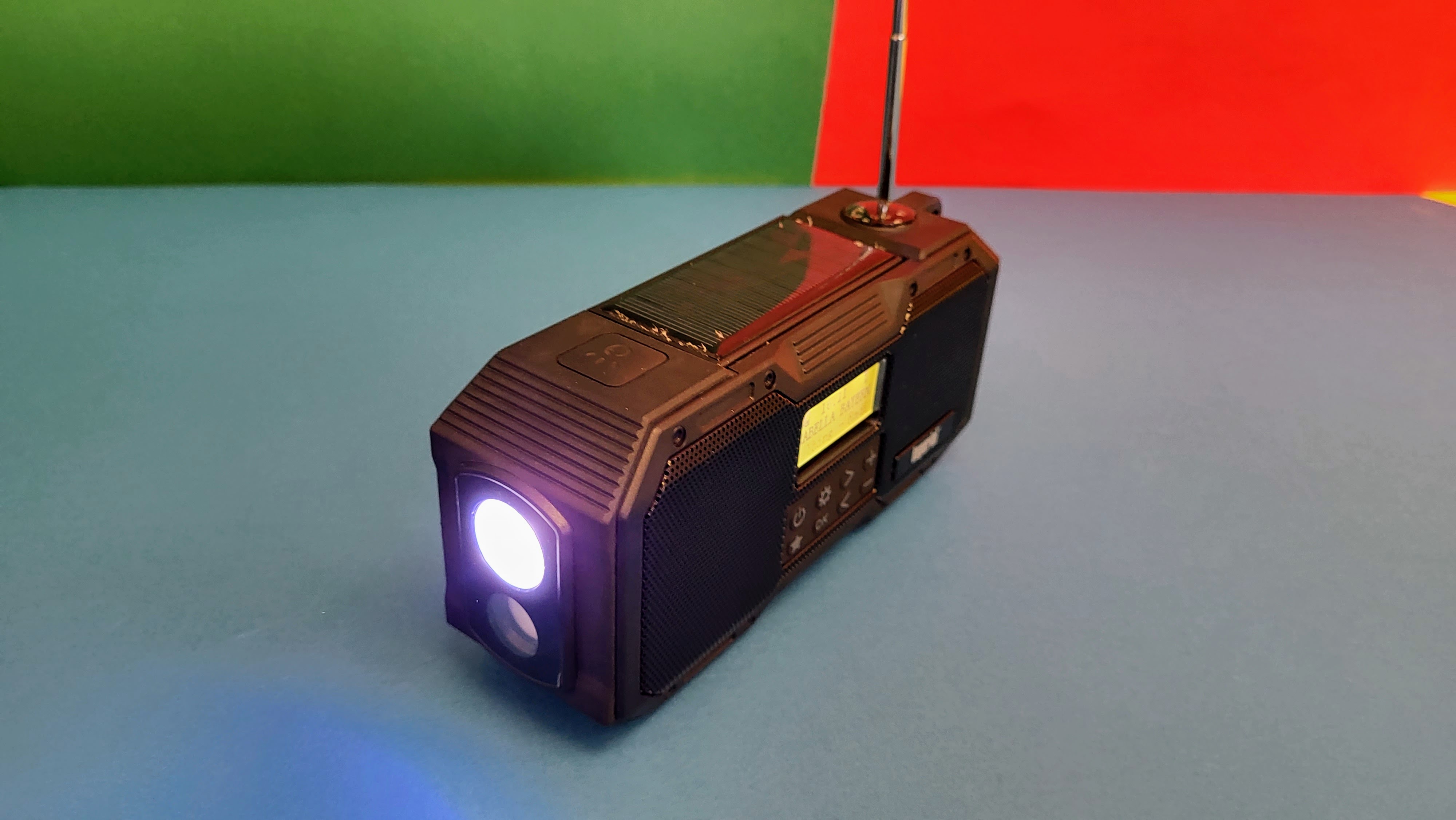 Der integrierte 10-W-Lautsprecher bietet einen guten Klang. Der feste eingebaute Lithium-Polymer-Akku mit 4000 mAh lädt bei Bedarf auch elektronische Geräte wie ein Handy auf. Im Fall eines Stromausfalls oder leeren Akkus kann man es mit der eingebauten Solarzelle oder Kurbel wieder aufladen, wobei die Kurbel die beste aus dem Testfeld ist. Das liegt vorwiegend daran, dass sie ausreichend lang ist.