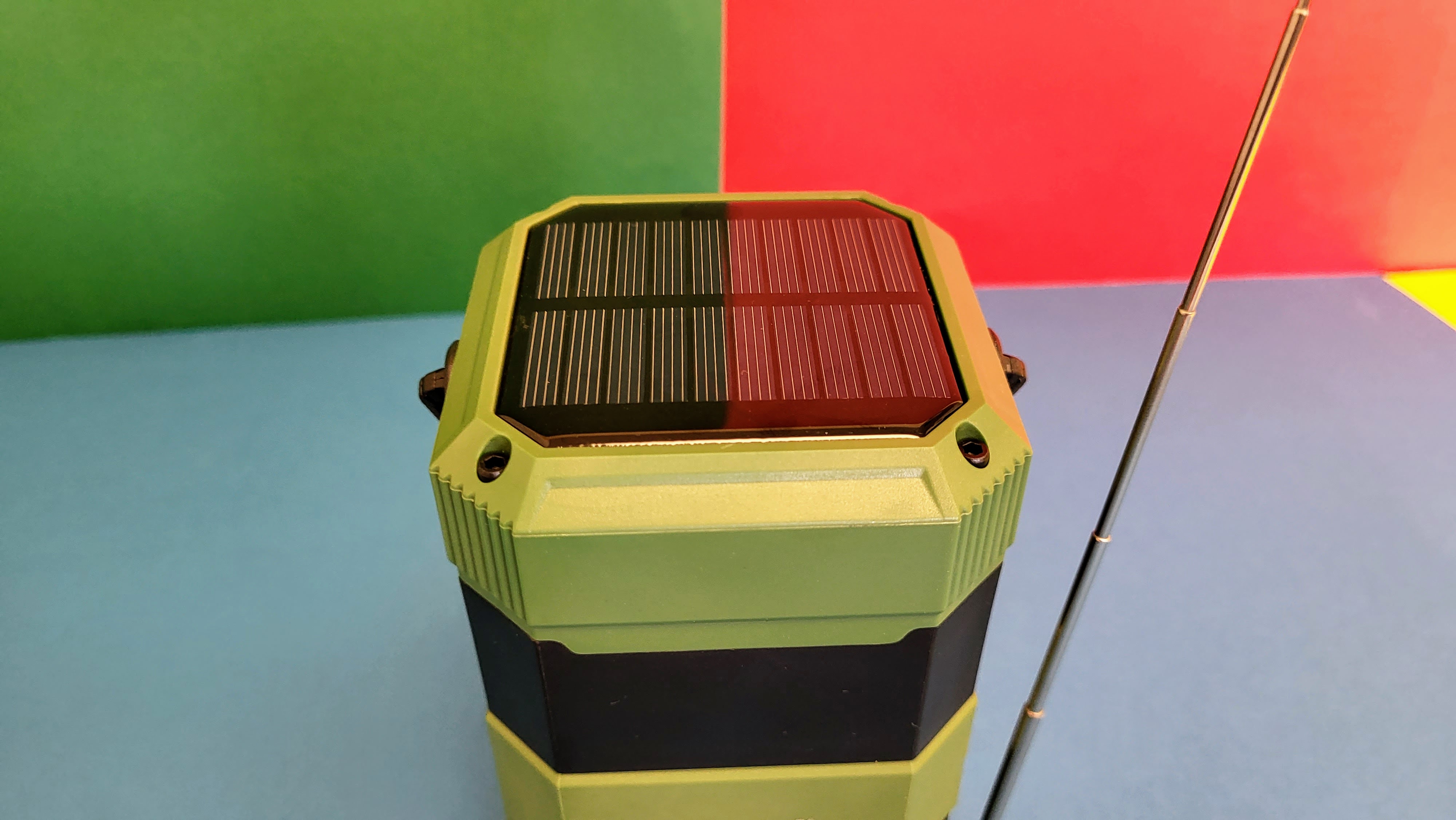 Zieht man damit den oberen Teil des Radios heraus, kommt eine „Laterne“ zum Vorschein, die direkt aufleuchtet. Drückt man den SOS-Button für längere Zeit, geht ein schriller Alarmton los, die beiden LEDs der Taschenlampen leuchten dann in Rot und Blau auf. Ein Solarpanel liegt auf der Oberseite des Gehäuses und ist deutlich größer als bei den anderen Geräten. Ein vollständiges Aufladen dürfte hier aber viele Stunden dauern.