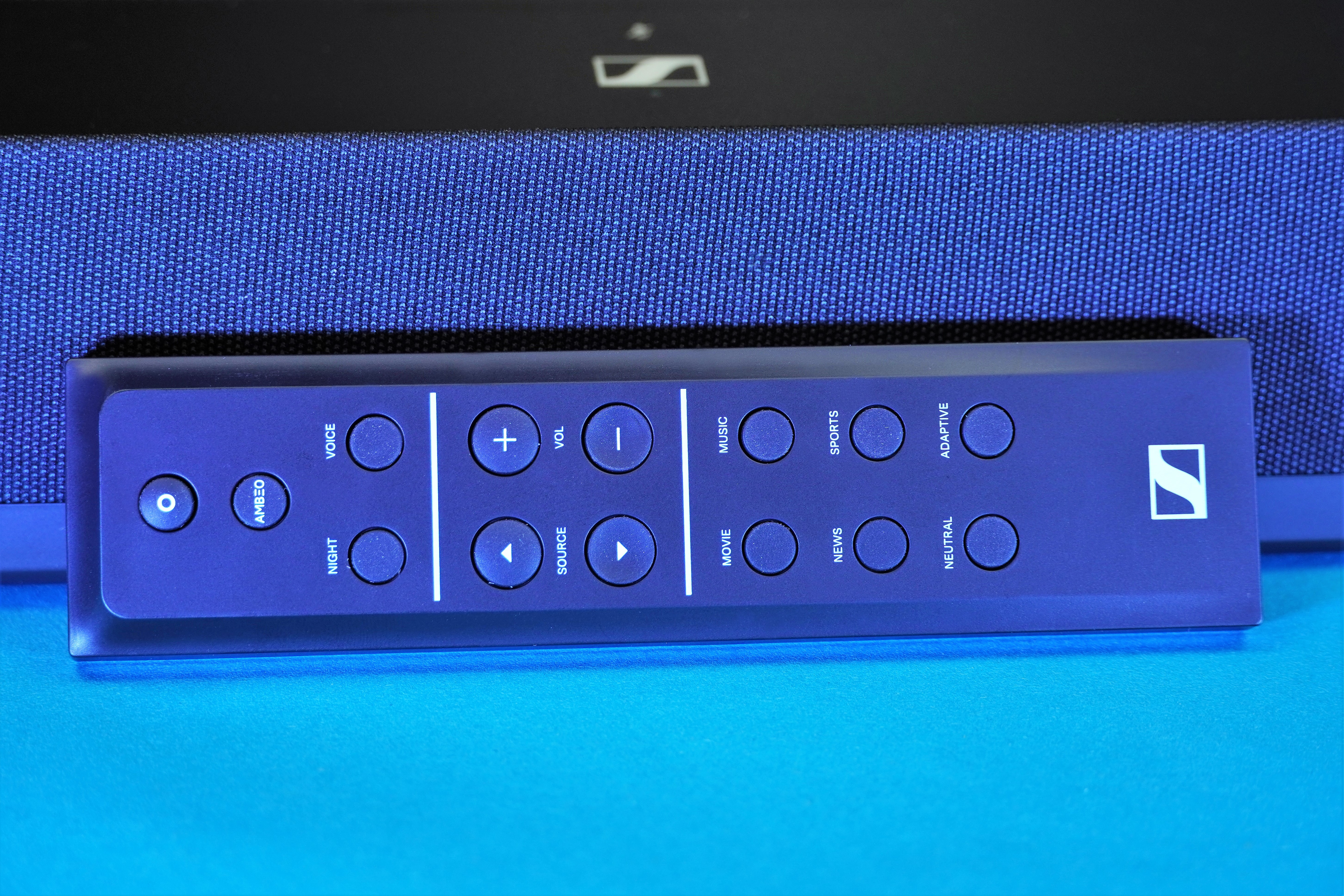 Ebenfalls unproblematisch gelingt die Bedienung über den mitgelieferten schwarzen Steuerstab. Dieser ist schwer, liegt gut in der Hand, die 14 Tasten sind übersichtlich angeordnet, neigen jedoch dazu, leicht zu verfusseln. Hier wäre eine Polyurethan-Beschichtung wünschenswert, die Sony beispielsweise bei seinen höherwertigen TV-Fernbedienungen verwendet. Quelle, Lautstärke und Modi ändert man auch über den Sennheiser-Steuerstab sehr intuitiv. Dies klappt zudem über fünf drucksensitive Tasten auf dem Gehäuse. Ein Leuchtstreifen auf der Soundbar informiert durch wechselnde Farben über die gerade aktive Quelle und die Lautstärke-Intensität.