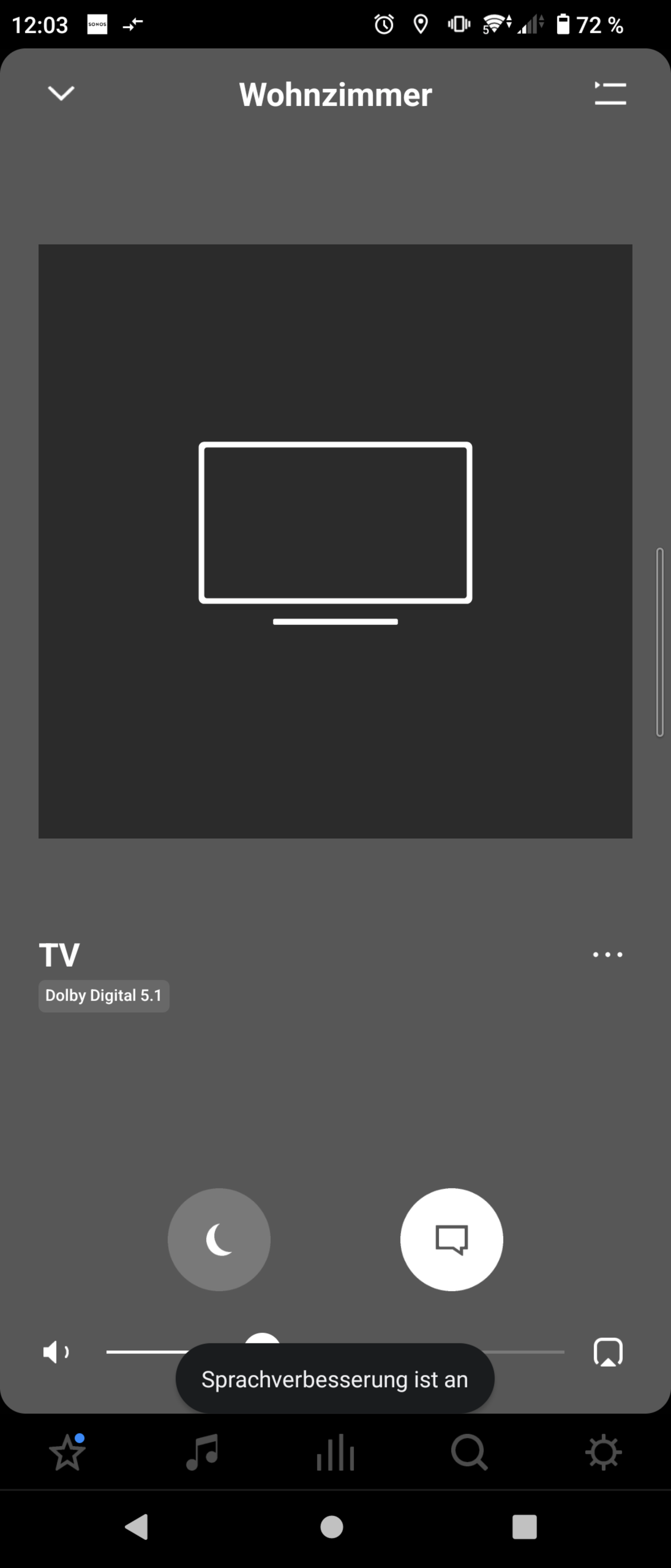 Anschließend ist die Soundbar betriebsfertig und lässt sich vollständig über die App steuern. Anpassen kann man die Lautstärke, zudem besteht Zugriff auf sämtliche Quellen und Anschlüsse, auf mögliche Center- und Subwoofer-Setups – falls entsprechende Geräte angeschlossen sind – sowie Soundmodi, das Nacht-Setup und die Sprachverbesserung.