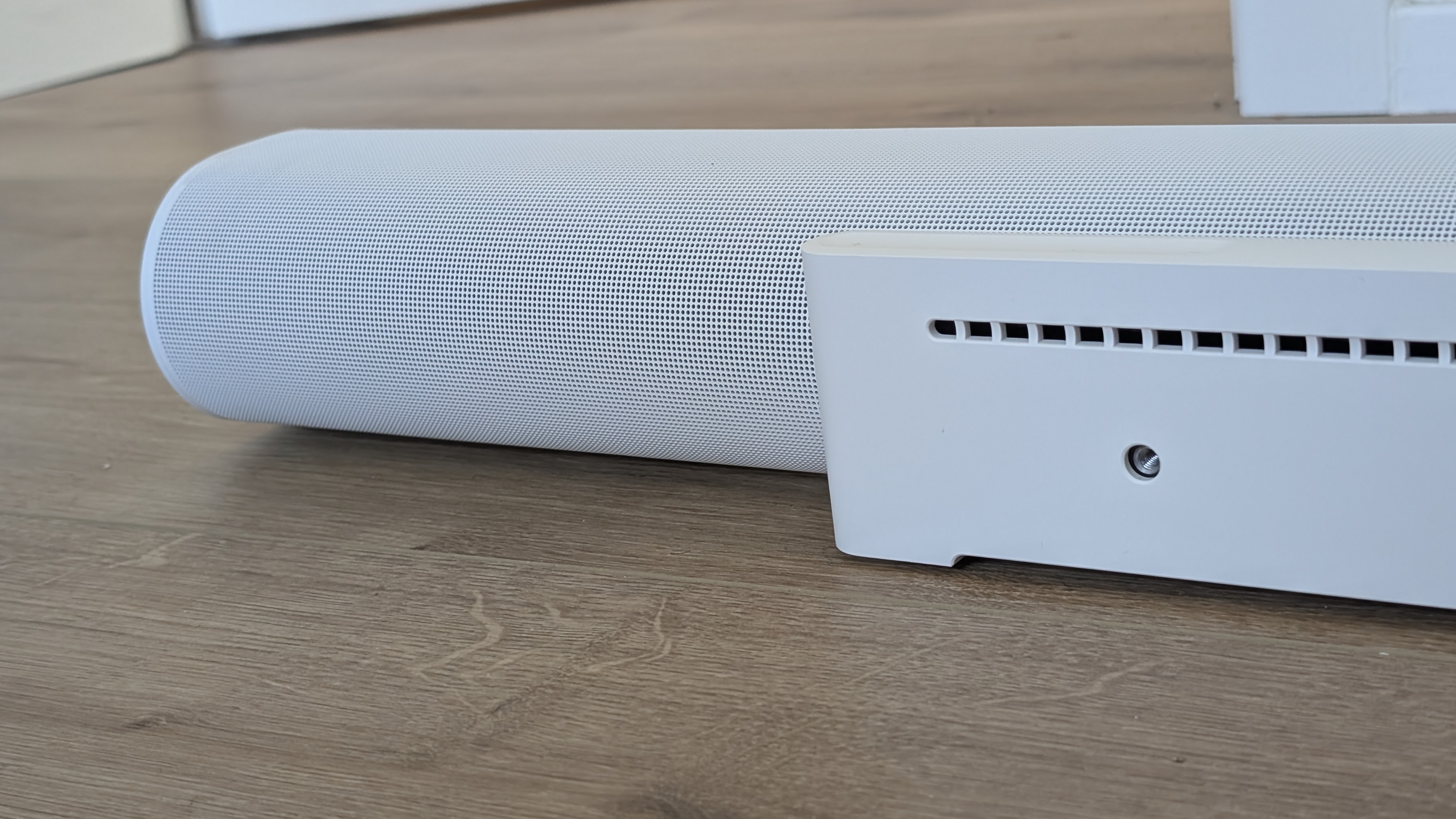 Die Verarbeitung ist sehr gut, die Soundbar ist in grau-schwarzen Akustikstoff gehüllt. Gummifüße schützen empfindliche Oberflächen, Aufhängungen für die Wandmontage sind bereits in der Rückseite integriert. Die Front ziert eine Status-LED, oben sitzt ein Annäherungssensor, der Tasten einblendet, sobald man sich mit der Hand nähert. Alle Kanten der Box sind schön abgerundet, sodass sich diese angenehm anfühlen.