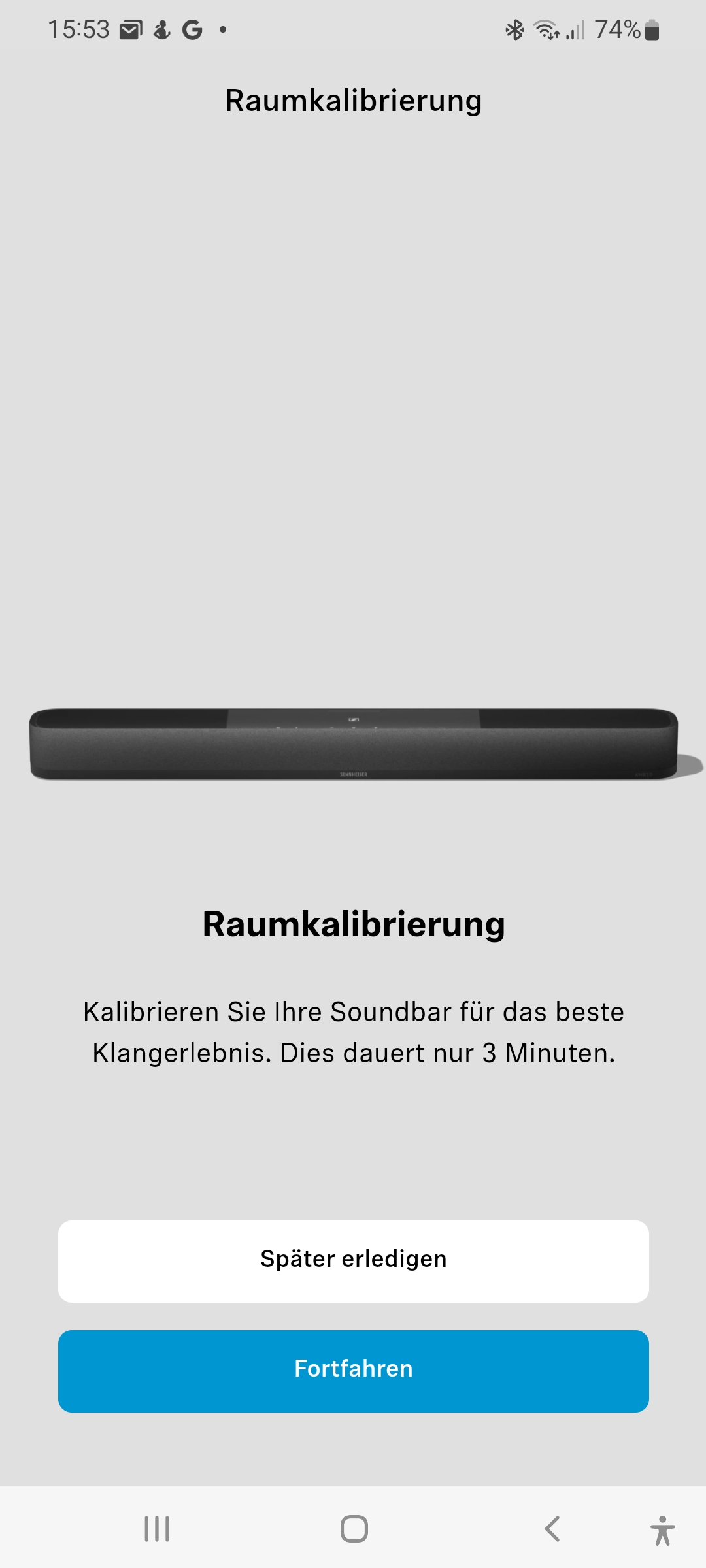 Im ersten Schritt muss man den Lautsprecher einrichten. Dazu ist die kostenlos für iOS und Android erhältliche App „Sennheiser Smart Control“ erforderlich. Nachdem man die Bluetooth-Freigabe erteilt hat, wird die Soundbar nach wenigen Sekunden automatisch gefunden. Jetzt wird der Lautsprecher noch ins heimische WLAN eingebunden – das komplette Setup ist super unkompliziert und blitzschnell auch von absoluten Laien erledigt. Die App sucht nach frischer Firmware und installiert diese umgehend. Um sich optimal auf die häusliche Umgebung anzupassen, in der die Ambeo steht, führt diese eine rund dreiminütige Raumkalibrierung durch. In dieser Zeit spielt sie verschiedene Testtöne ab, um beispielsweise herauszufinden, ob sich in der Nähe des Lautsprechers reflektierende Oberflächen oder schallschluckende Materialien befinden.