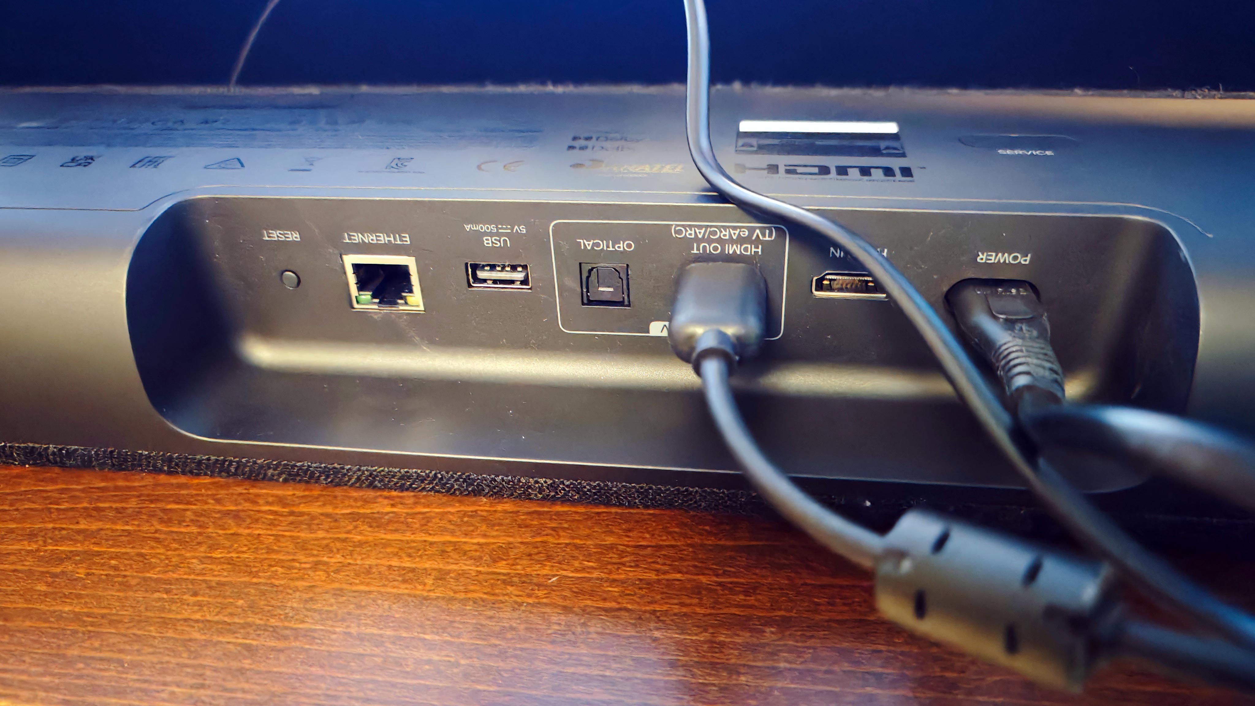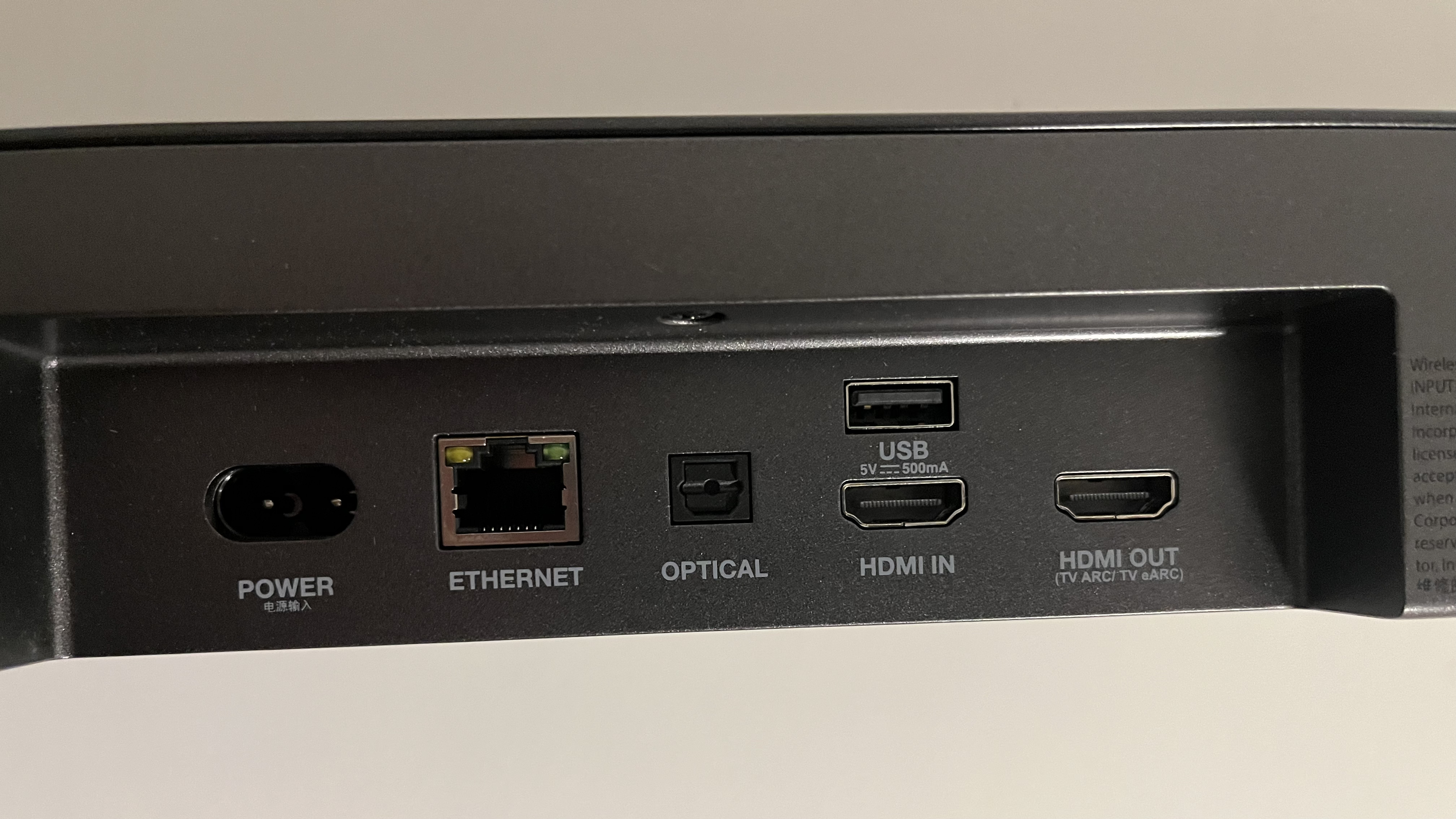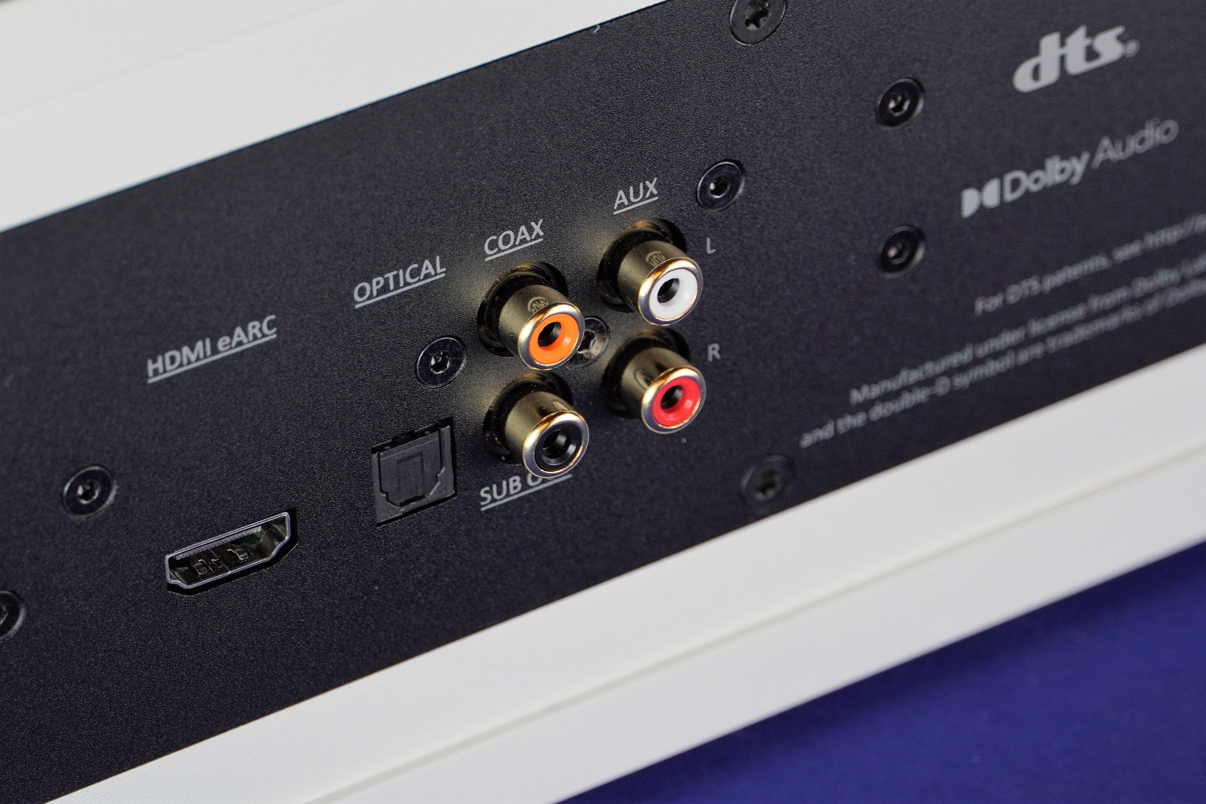 An Anschlüssen bietet die Soundbar einen HDMI-Ein und -Ausgang mit eARC-Unterstützung (Enhanced Audio Return Channel) sowie eine Toslink-Buchse für ein optisches Kabel. Dank eARC lässt sich die Lautstärke der Soundbar im Alltag über die Fernbedienung des Fernsehers steuern, sodass die Fernbedienung der Soundbar eigentlich gar nicht mehr gebraucht wird. Analoge Eingänge fehlen, was für Nutzer älterer Fernseher oder Beamer ein Nachteil sein könnte. Die HDMI-Ports unterstützen 4K/60p, HDCP 2.3, HDR10+, Dolby Vision und HDR, was sie zukunftssicher macht.
