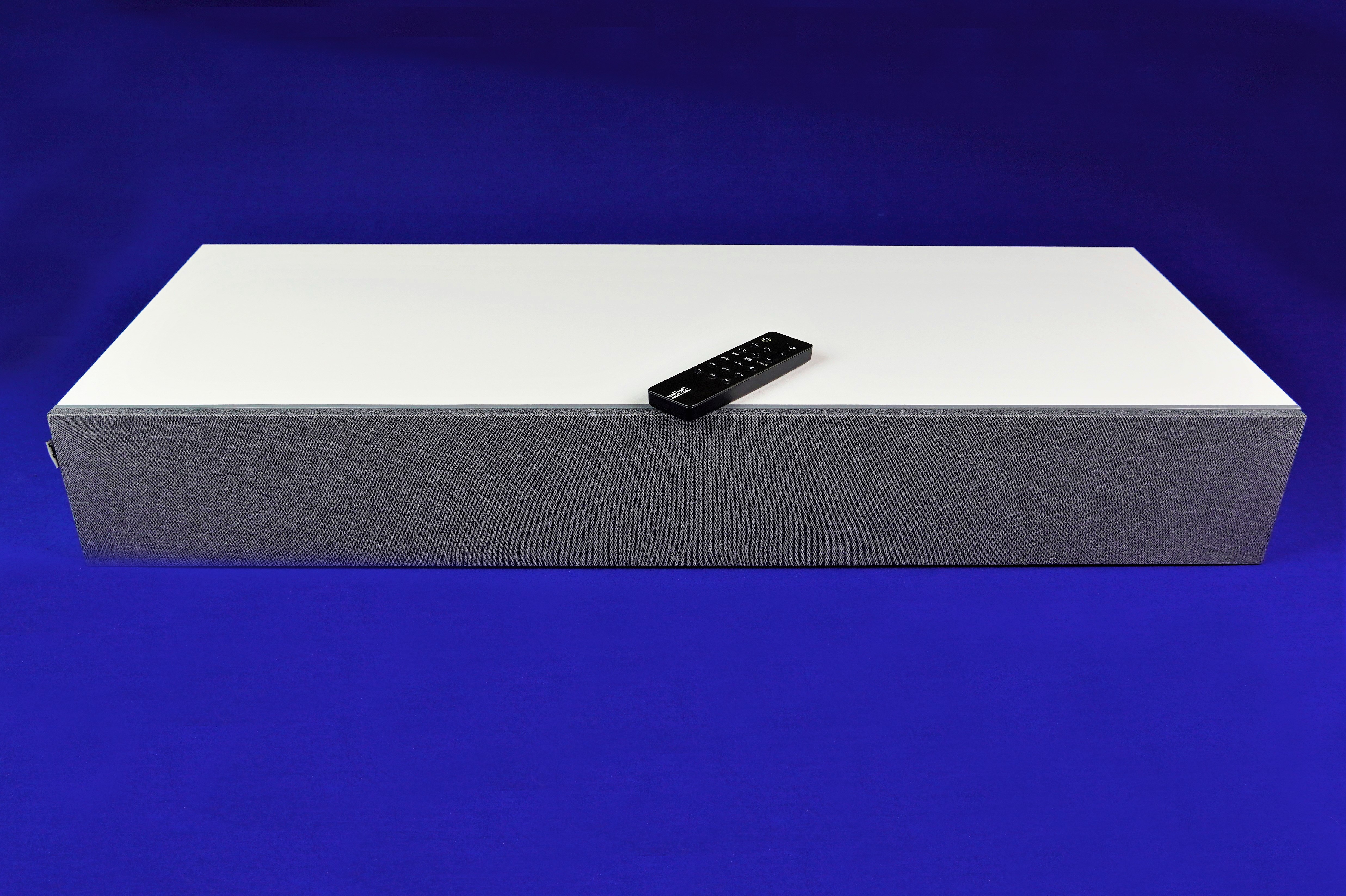 Schwarz/Graphit und Weiß/Eisgrau sind die beiden Farbkombinationen, in denen die Nubert-Soundbar zu haben ist. Ihr Gewicht von 15,2 Kilo ist ein erstes Indiz dafür, dass der Hersteller auf ein hochwertiges Innenleben mit vernünftigen Komponenten setzt. Mit 86 x 34 x 12,9 Zentimeter ist die Nuboxx AS-425 max ein ausgewachsener Schallwandler, der Flachbildfernseher mit einem Maximalgewicht von 50 Kilogramm trägt. Das massive und verwindungssteife Gehäuse besteht aus 19 Millimeter starken mitteldichten Faserplatten. Während der Korpus mit einer Dekorfolie überzogen ist, wurde die Schallwand seidenmatt lackiert. Die Frontabdeckung aus grauem Akustikstoff hält magnetisch. Insgesamt ist die Soundbar ordentlich verarbeitet. Wer auf mehr Schick steht und sich beispielsweise gebrochene Kanten wünscht, muss preislich in ein höheres Regal greifen.