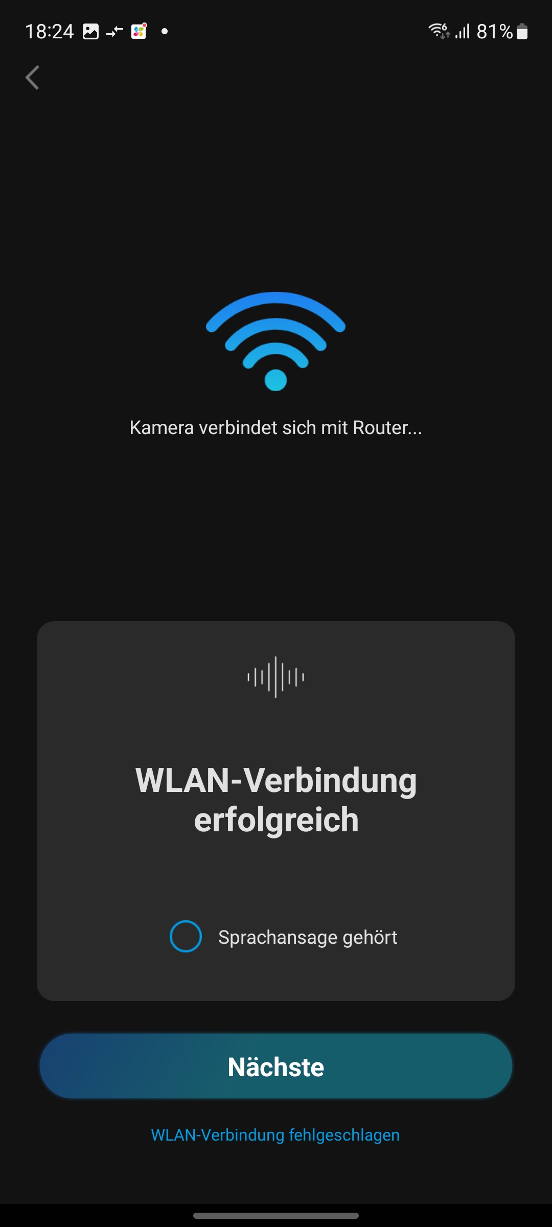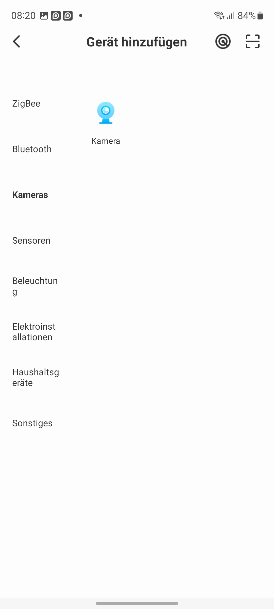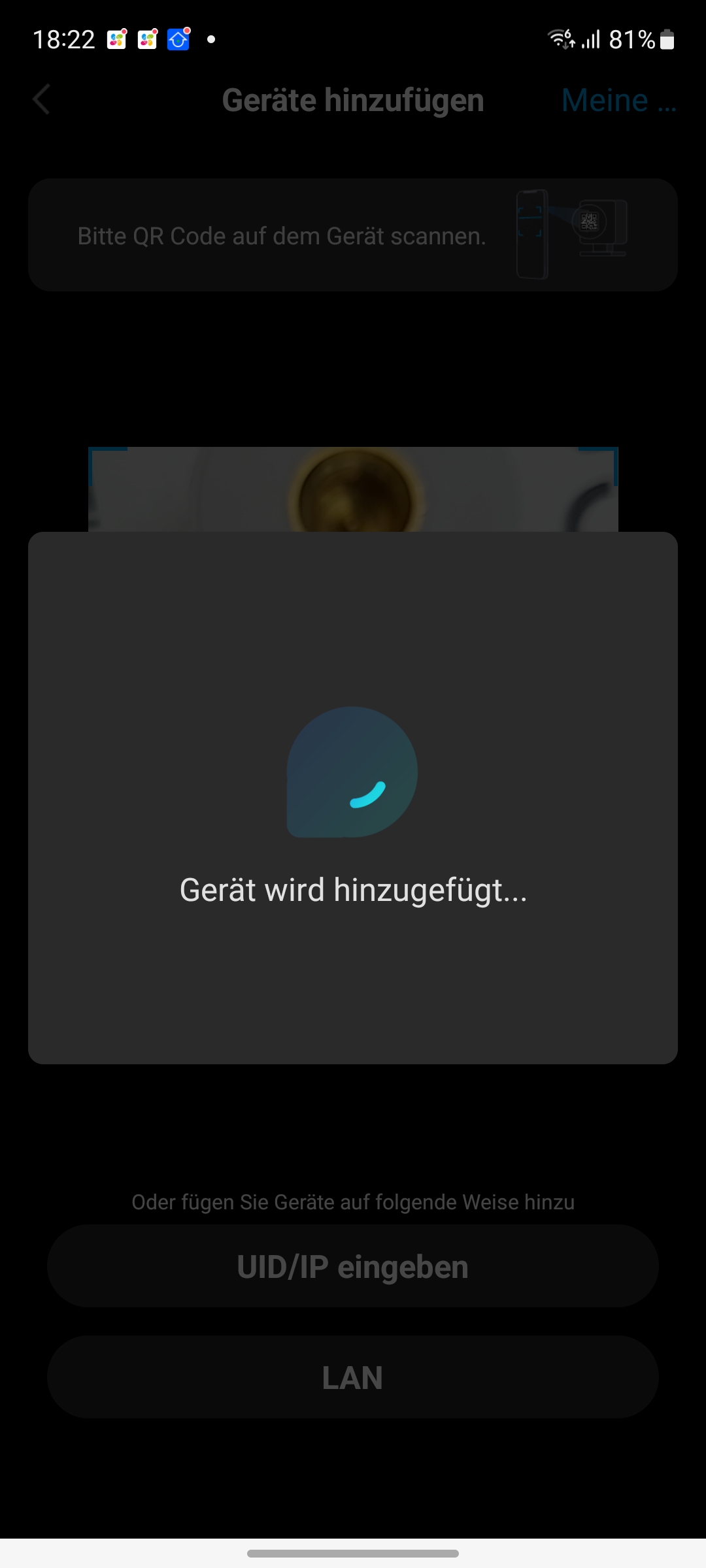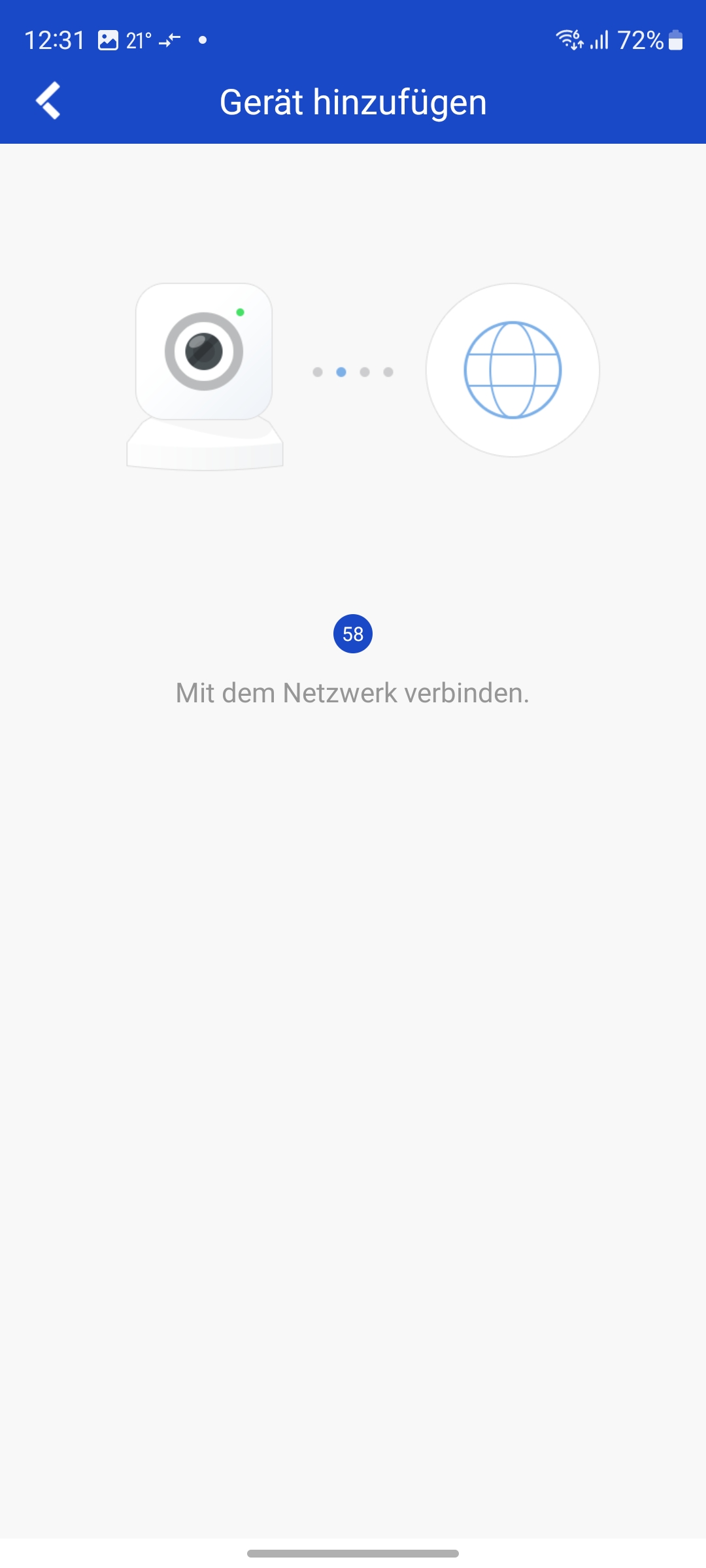 Nach dem Anschluss an die Stromversorgung startet die Kamera im Kopplungsmodus, was durch eine blinkende Statusleuchte neben dem Objektiv signalisiert wird. Jetzt ruft man eine der Tuya-Apps auf und beginnt mit dem Hinzufügen der Kamera über das Plus-Zeichen rechts oben und wählt Sicherheitskamera (Wi-Fi). Anschließend wählt man das betreffende WLAN aus und gibt das Passwort ein. Dann generiert die App einen QR-Code, den man im Abstand von 10 bis 15 Zentimeter vor die Linse hält. Sobald die Kamera den QR-Code erkannt hat, ertönt ein Signal und die Verbindungsaufnahme zum WLAN erfolgt. Die Kamera wird in der Folge als ZX-5346 in der App angezeigt (siehe auch Bildergalerie).