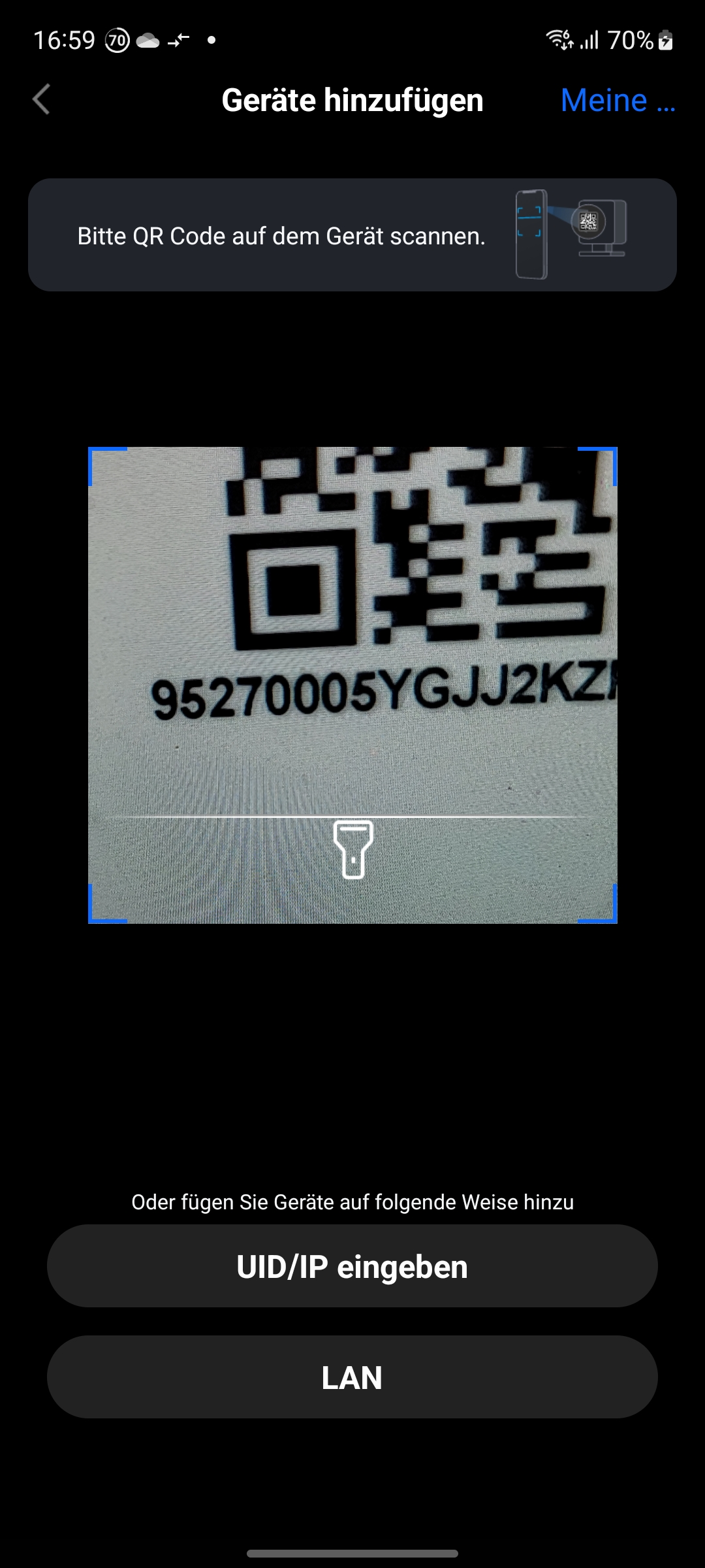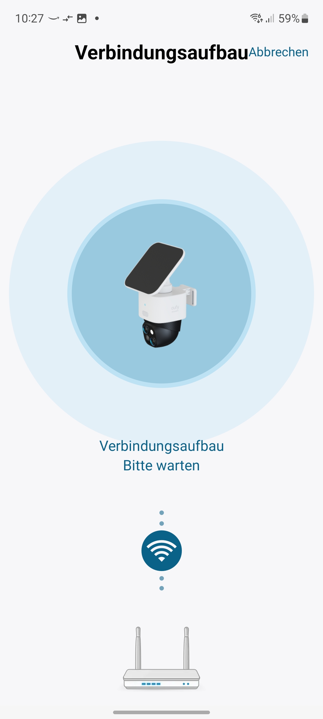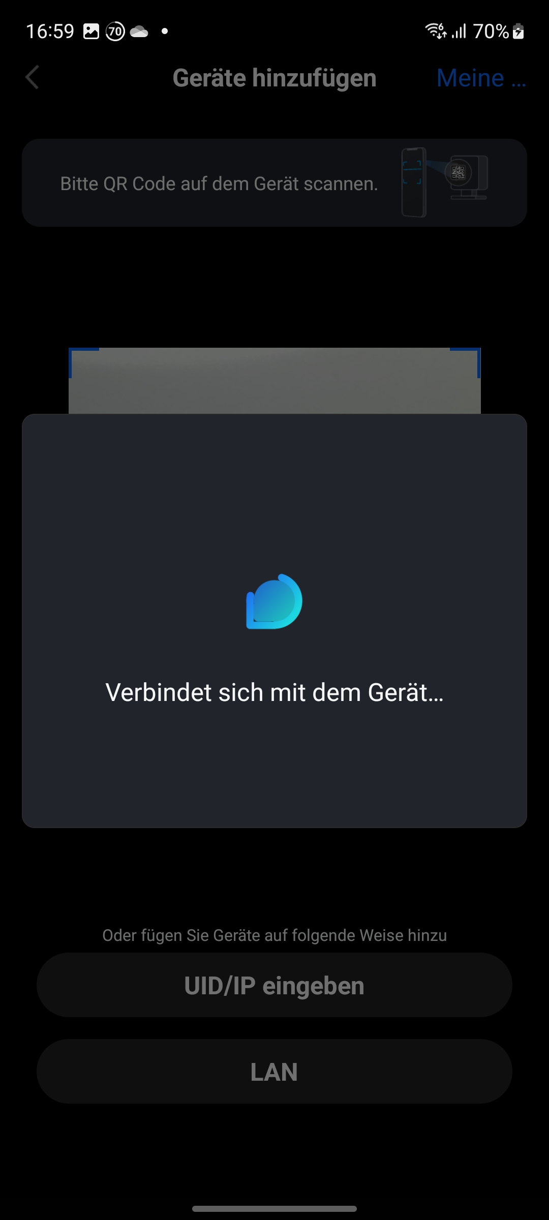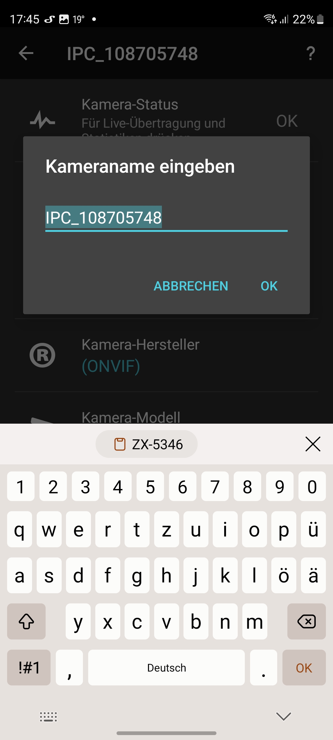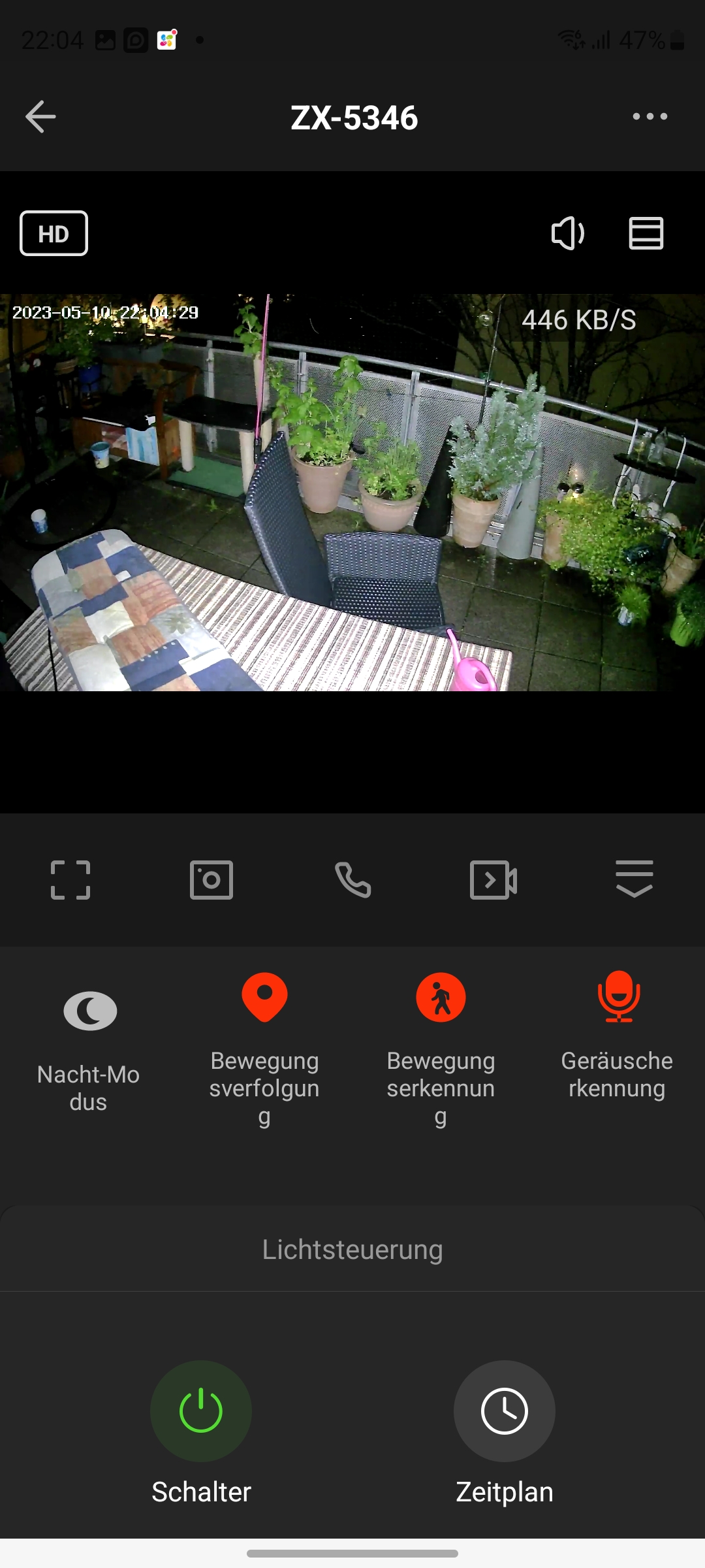 Nach dem Anschluss an die Stromversorgung startet die Kamera im Kopplungsmodus, was durch eine blinkende Statusleuchte neben dem Objektiv signalisiert wird. Jetzt ruft man eine der Tuya-Apps auf und beginnt mit dem Hinzufügen der Kamera über das Plus-Zeichen rechts oben und wählt Sicherheitskamera (Wi-Fi). Anschließend wählt man das betreffende WLAN aus und gibt das Passwort ein. Dann generiert die App einen QR-Code, den man im Abstand von 10 bis 15 Zentimeter vor die Linse hält. Sobald die Kamera den QR-Code erkannt hat, ertönt ein Signal und die Verbindungsaufnahme zum WLAN erfolgt. Die Kamera wird in der Folge als ZX-5346 in der App angezeigt (siehe auch Bildergalerie).