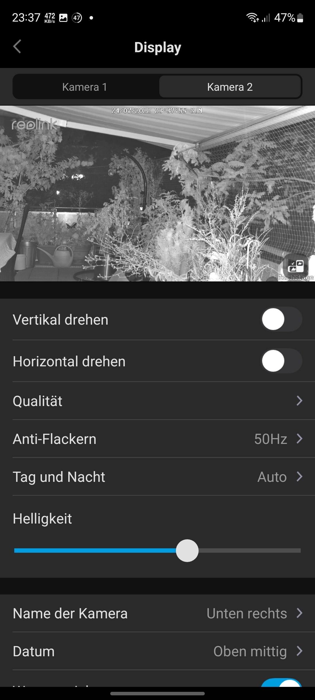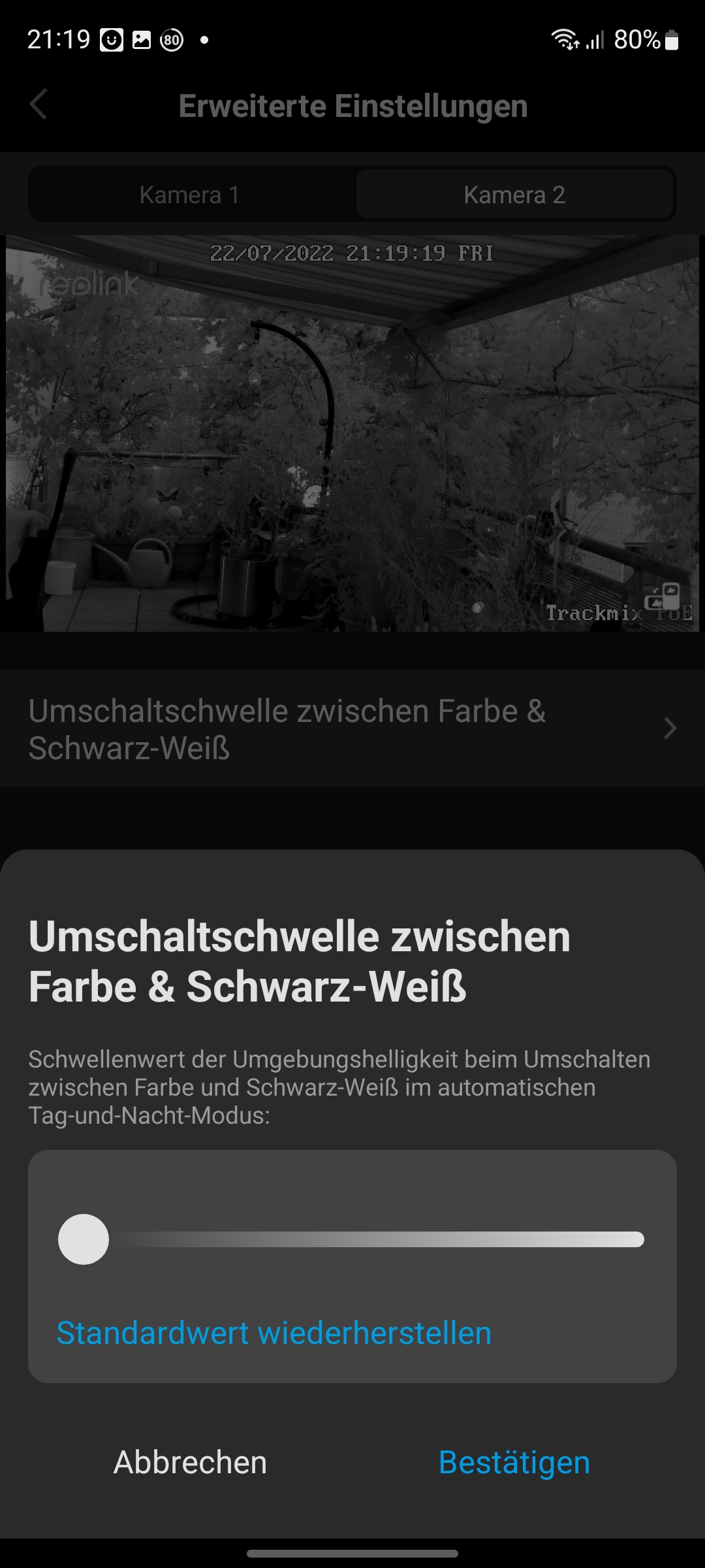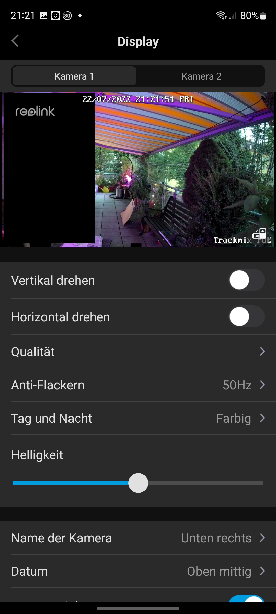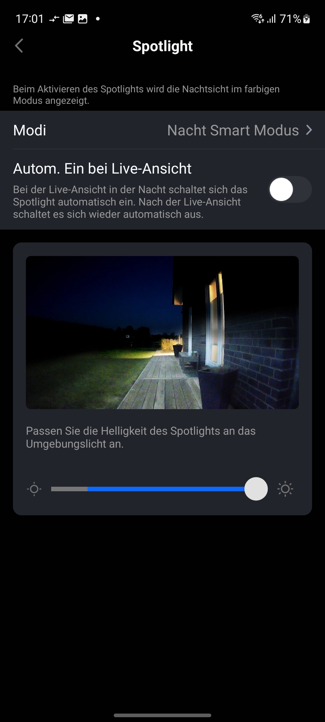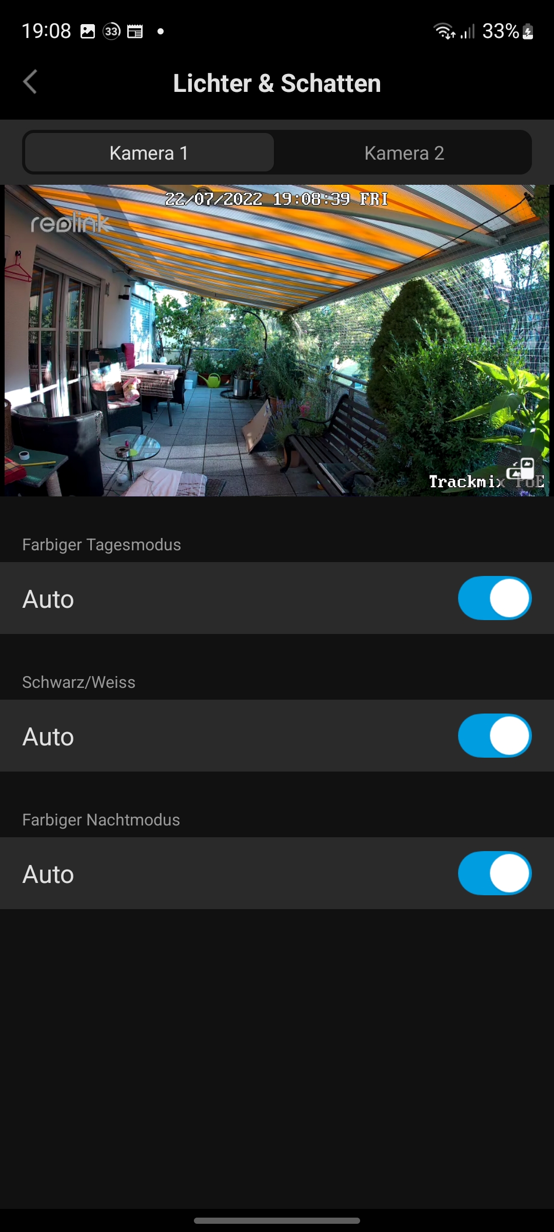 Dank 8-Megapixel-Auflösung liefert die Reolink Trackmix PoE detailreiche und scharfe Bilder. Nachts leuchten die 450 Lumen starken LEDs das Bild gut aus. Wie andere Reolink-Kameras neigt auch die Trackmix PoE bei einem hohen Dynamikumfang dazu, helle Bereiche etwas überzubelichten. Hier wäre die Unterstützung für bildverbessernde Qualitäts-Features wie Wide Dynamic Range (WDR), Backlight Compensation (BLC) und Highlight Compensation (HLC), wie sie etwa die Annke 4G LTE (Testbericht) bietet, sicher sinnvoll, um noch eine etwas bessere Bildqualität zu erreichen. Insgesamt ist die Bildqualität aber gut und man kann sie über Einstellungen - Display - Lichter & Schatten noch bezüglich Helligkeit und Kontrast optimieren.