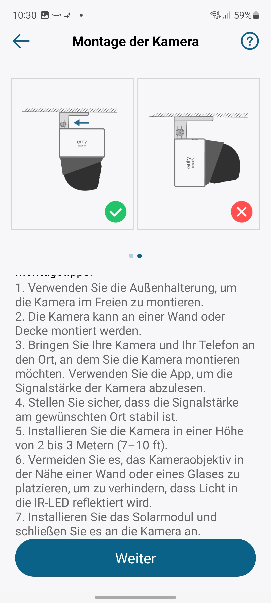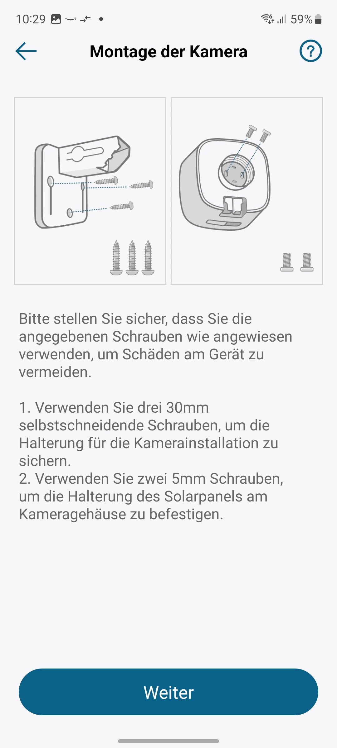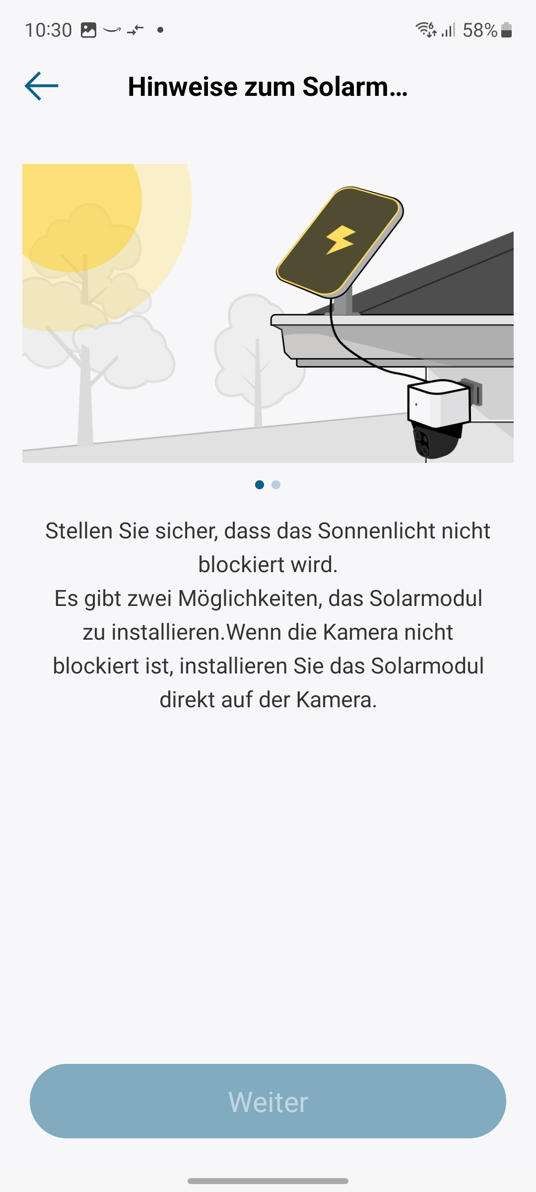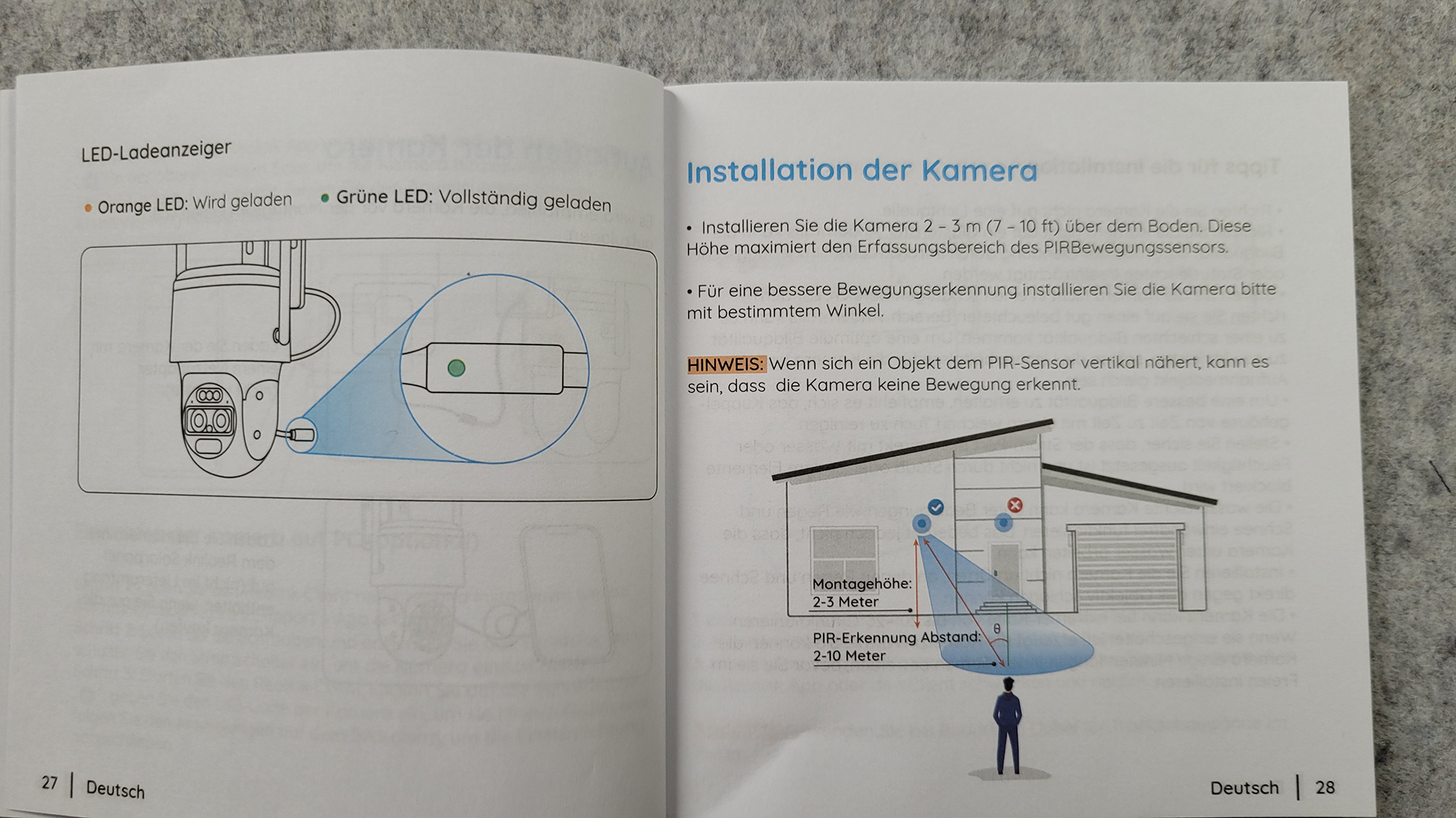 Im Lieferumfang sind für die Montage nötige Halterungen, Schrauben und Dübel sowie eine Bohrschablone enthalten. Die englischsprachige Kurzanleitung bietet detaillierte Informationen zur Montage inklusive Befestigung des Solarpanels. Informationen zur Montage in deutscher Sprache gibt es online und auch detailliert in der App.