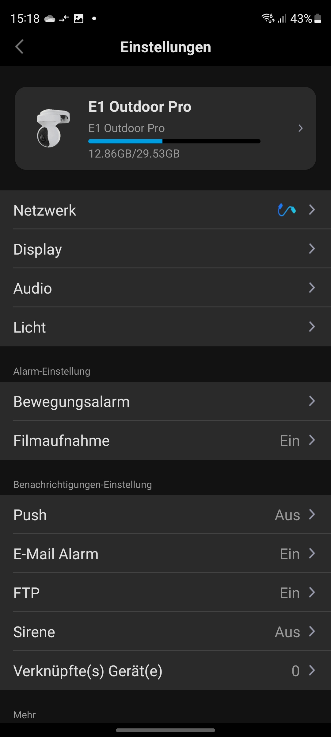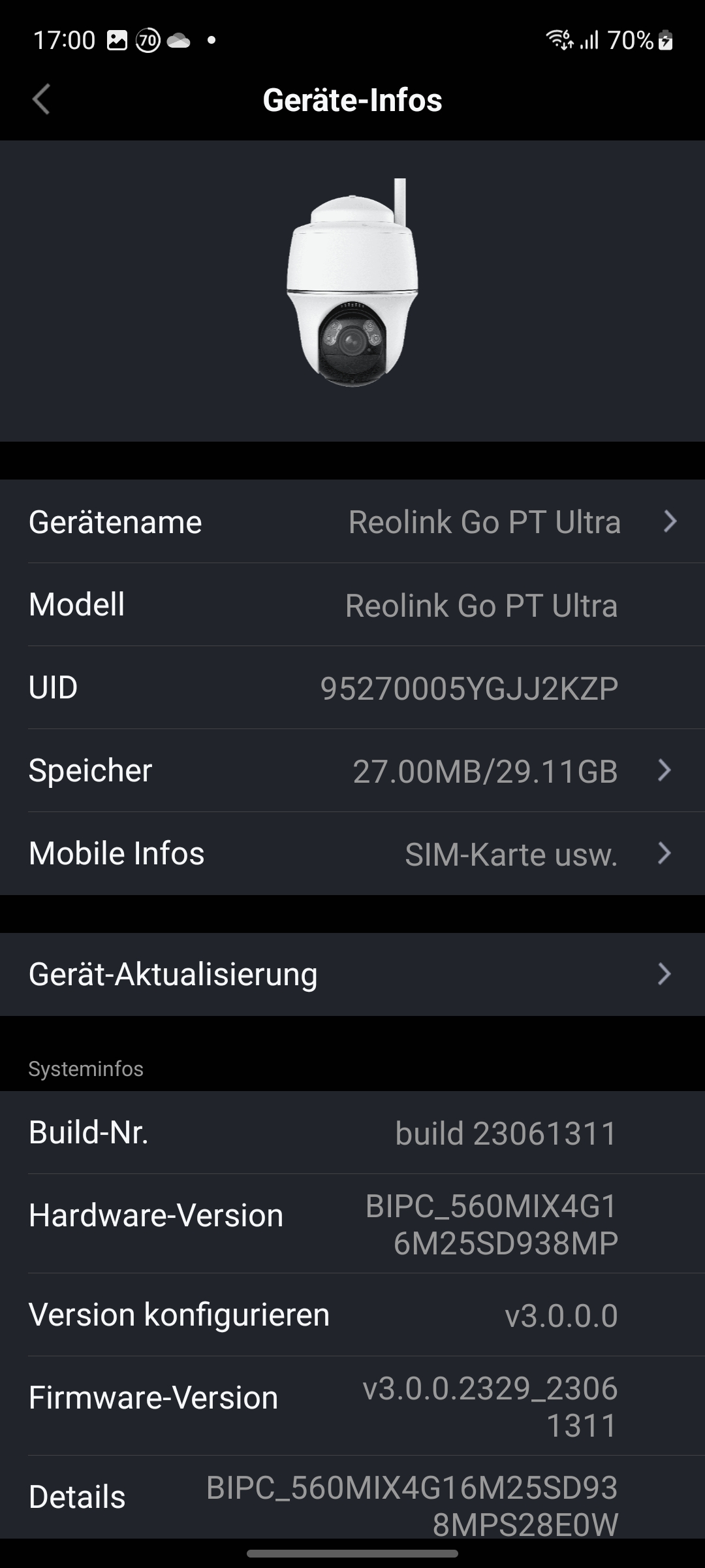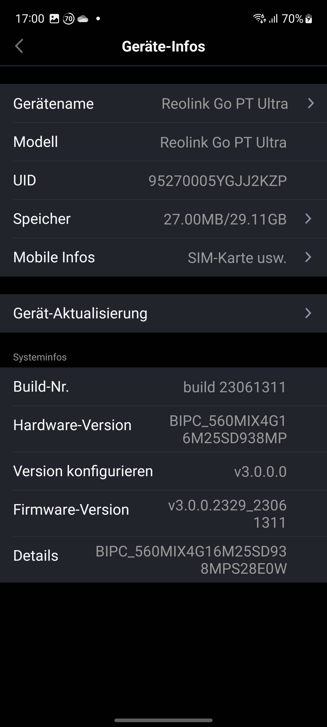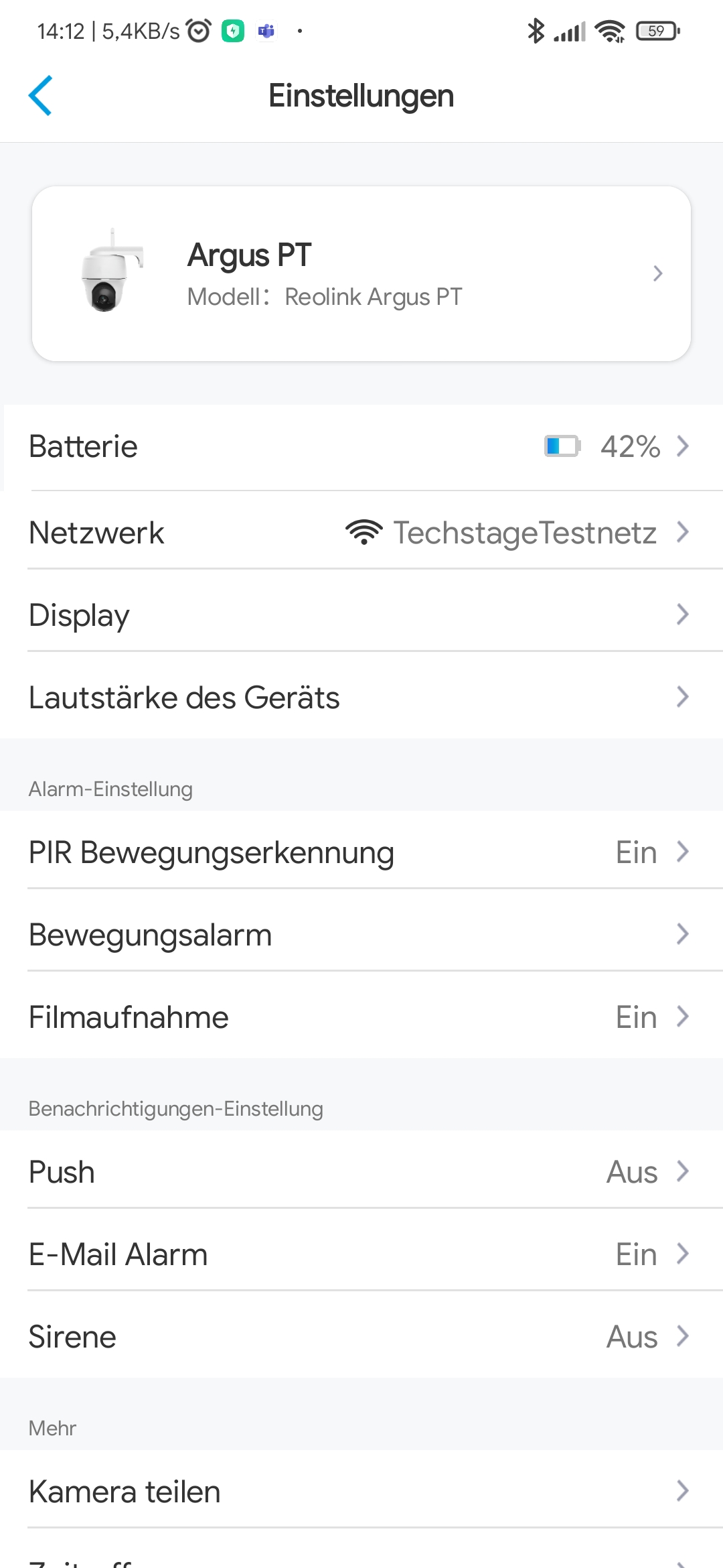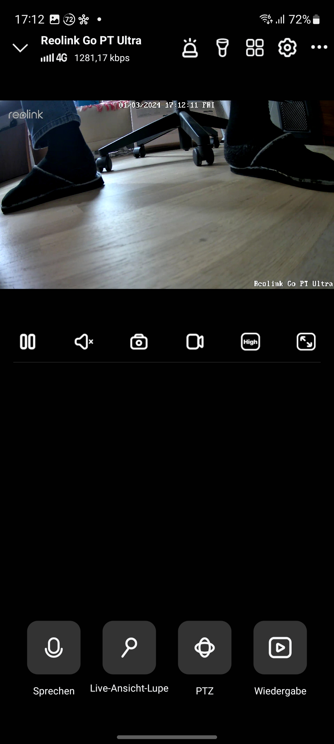 Die Datennutzung der Reolink Go PT Ultra hängt von der eingestellten Bitrate und Auflösung bei der Live-Ansicht ab. Eine Stunde Live-Übertragung im 4K-Modus (Klar) mit der Standard-Bitrate von 3 MBit/s benötigt etwa 1,3 GByte Daten. Im Flüssig-Modus (Low) mit der Standard-Bitrate 672 kbps sind nach 3,5 Stunden 1 GByte Daten verbraucht. Schade ist, dass die App selbst keine Informationen zur Datennutzung bietet.