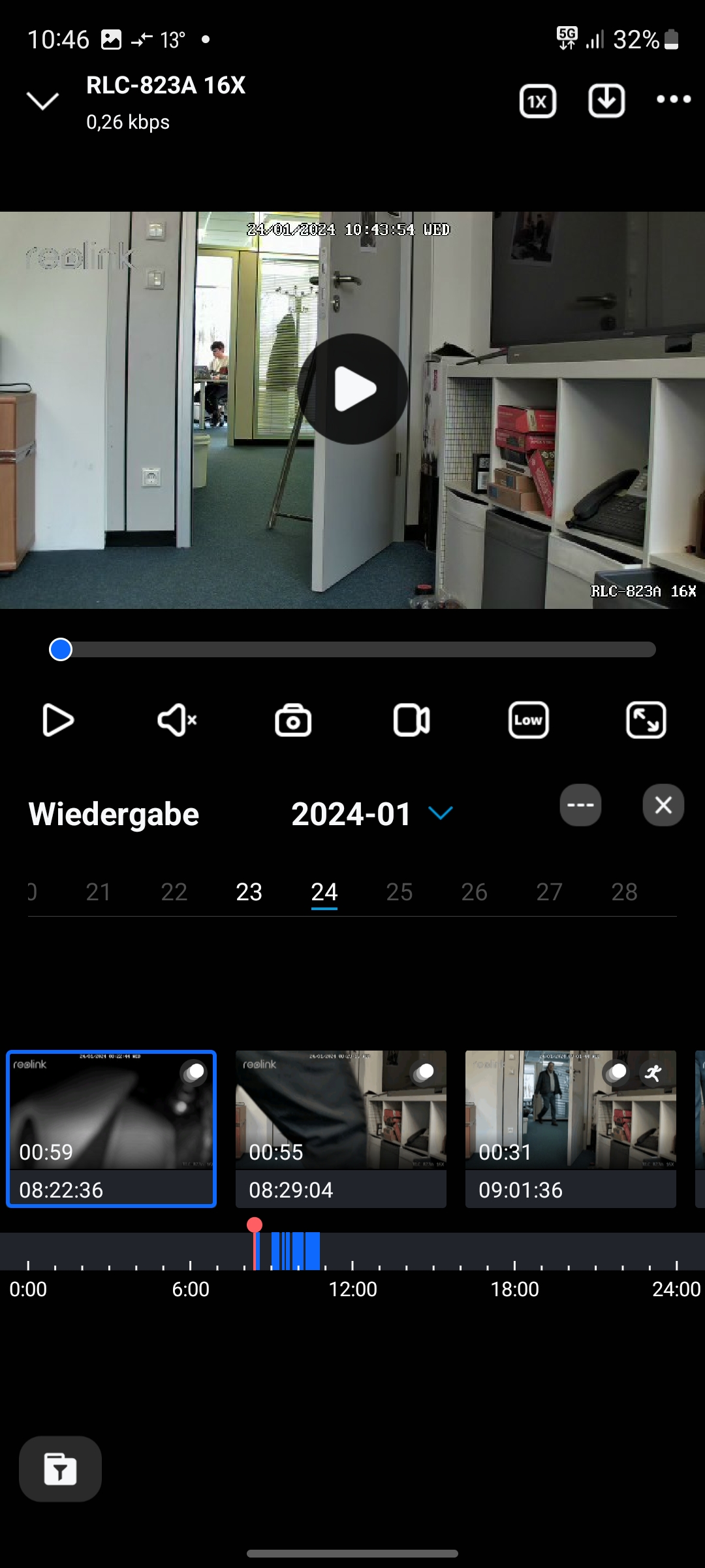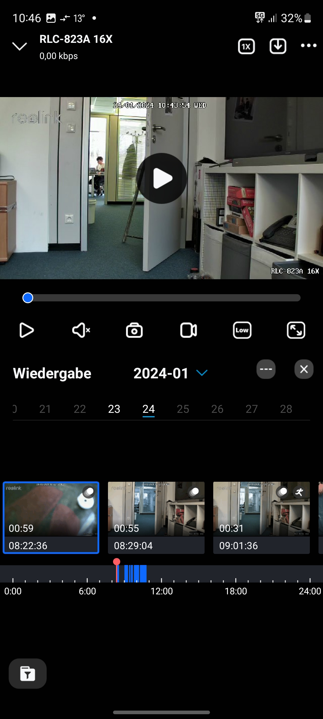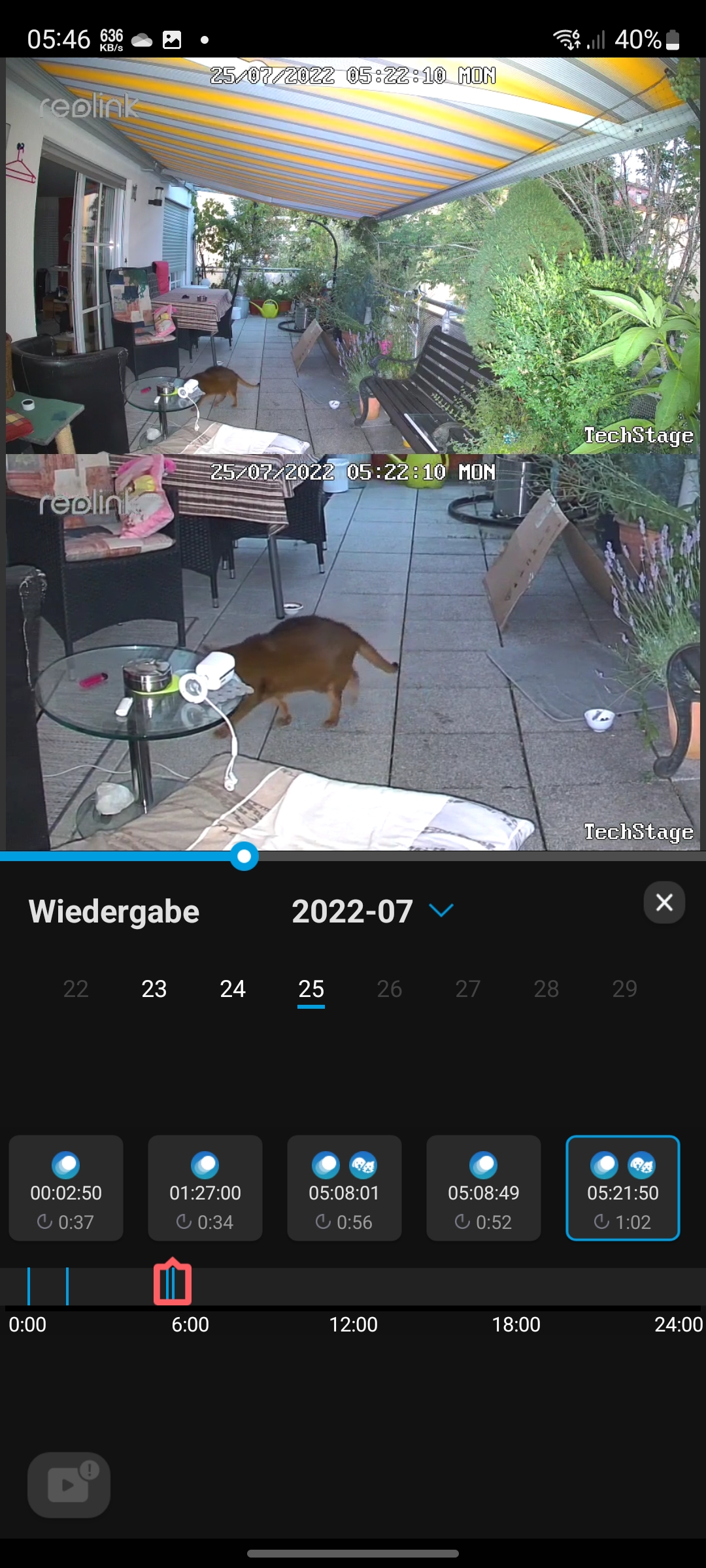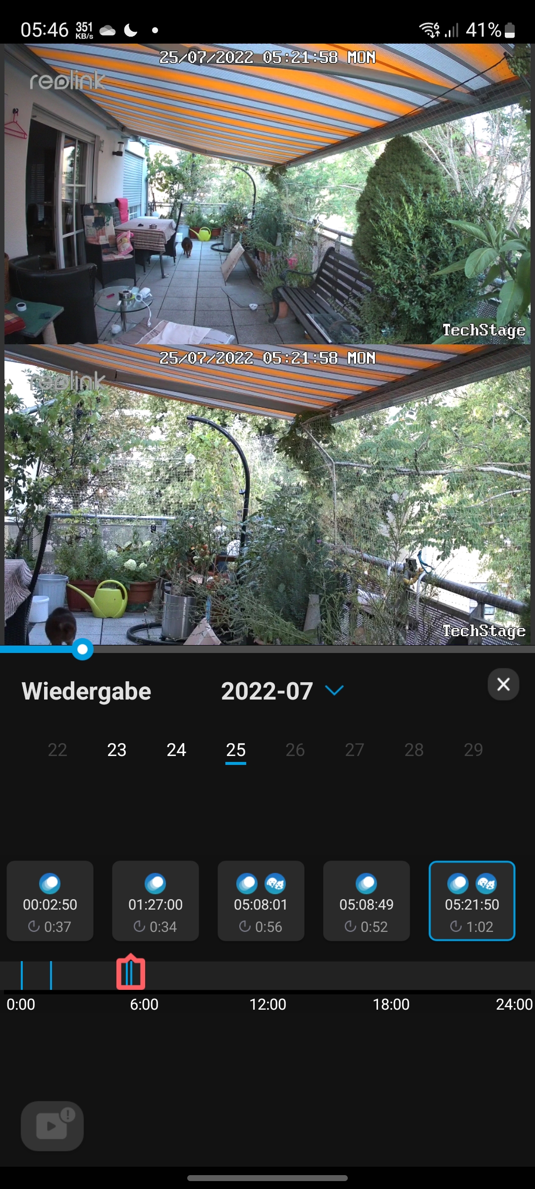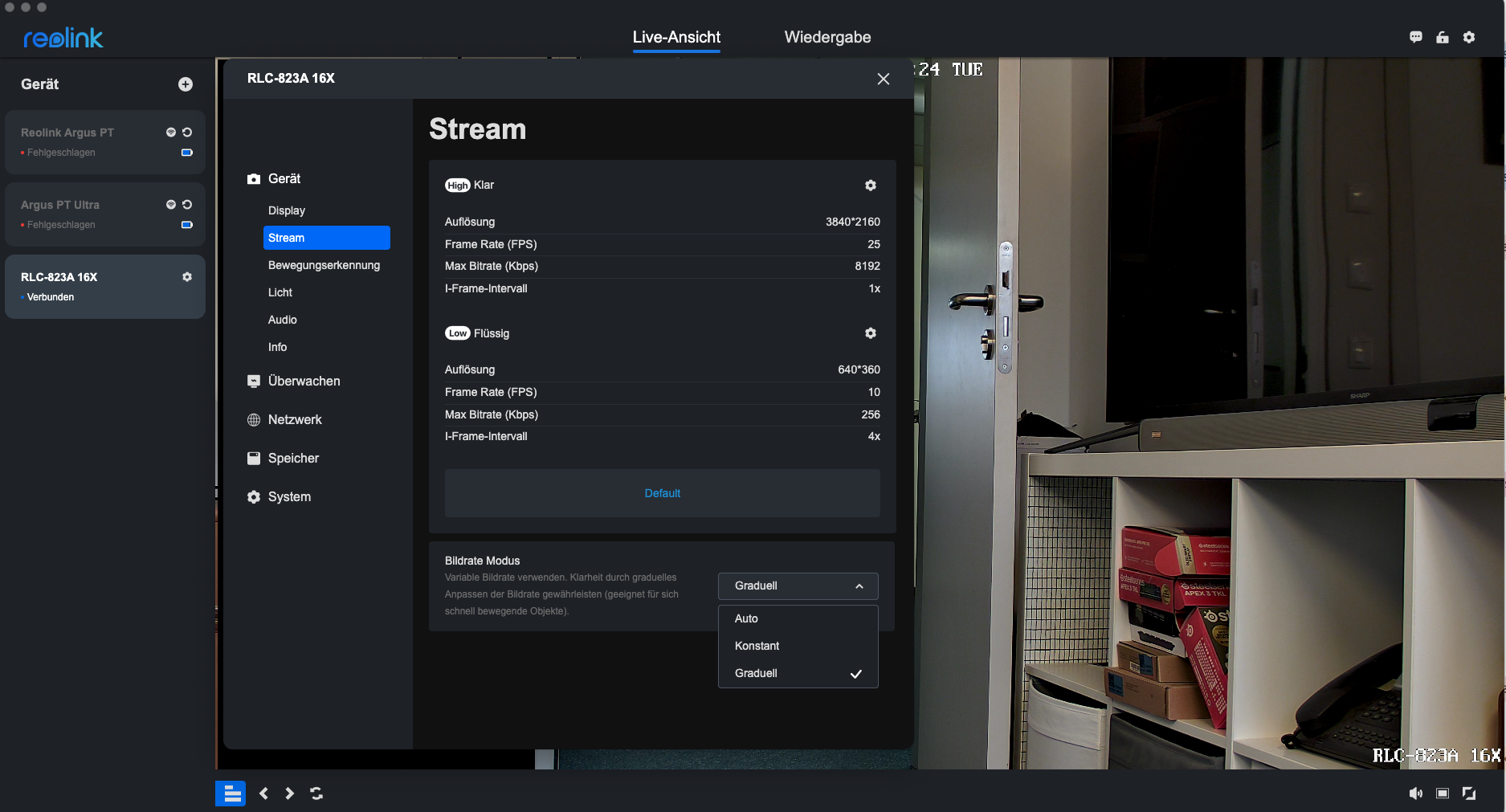 Die Datennutzung der Reolink Go PT Ultra hängt von der eingestellten Bitrate und Auflösung bei der Live-Ansicht ab. Eine Stunde Live-Übertragung im 4K-Modus (Klar) mit der Standard-Bitrate von 3 MBit/s benötigt etwa 1,3 GByte Daten. Im Flüssig-Modus (Low) mit der Standard-Bitrate 672 kbps sind nach 3,5 Stunden 1 GByte Daten verbraucht. Schade ist, dass die App selbst keine Informationen zur Datennutzung bietet.