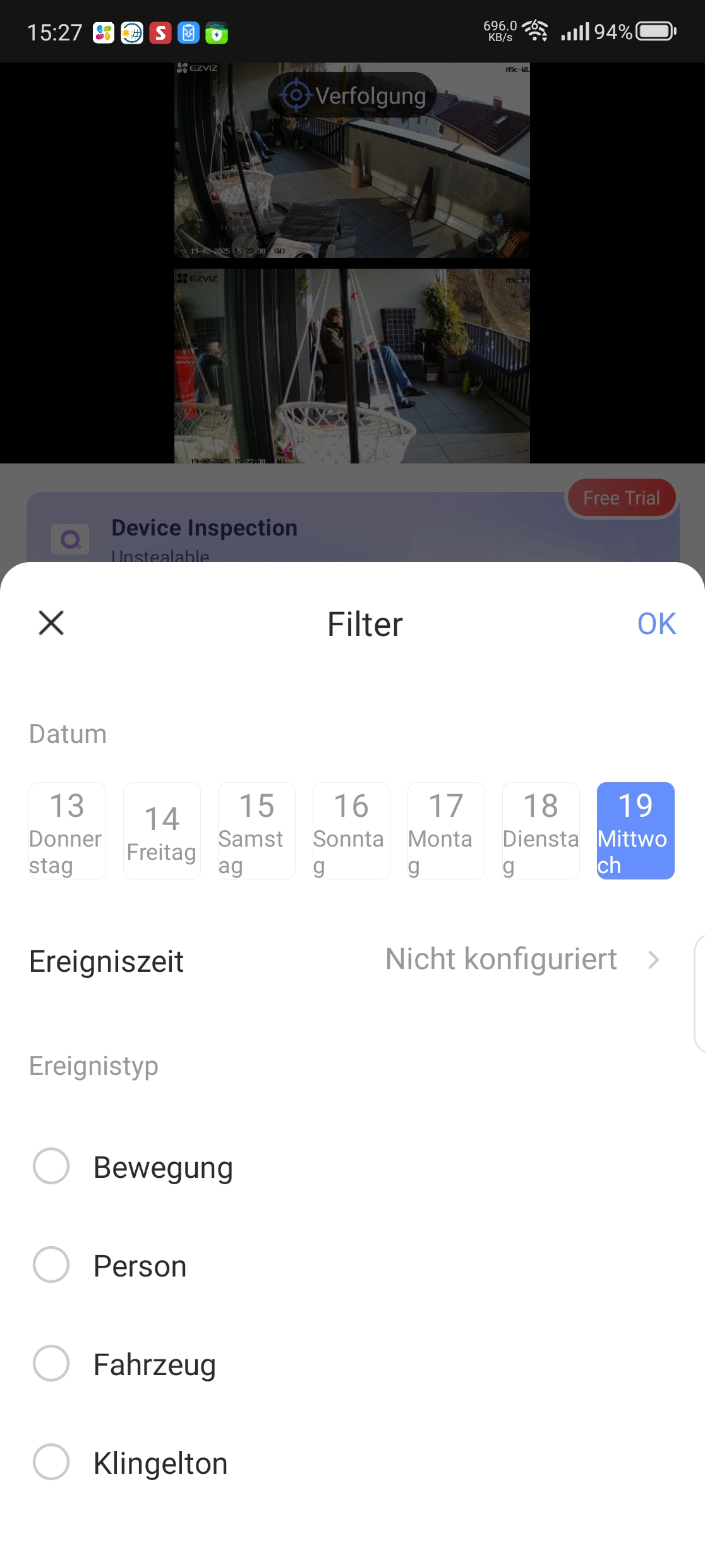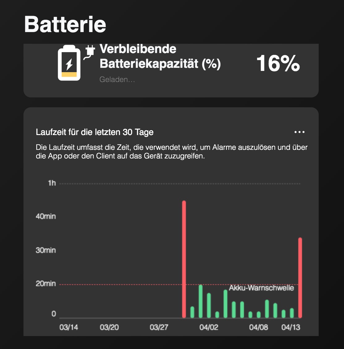 Darunter zeigt die App Daten zur Erkennungsstatistik unterteilt nach Arbeitstagen, Ereignisse und Aufzeichnungen. Innerhalb von drei Tagen bei wenig Sonnenschein hat sich der Akkustand von 100 auf 95 Prozent bei 255 Ereignissen und 202 Aufzeichnungen reduziert. Das ist ein guter Wert.