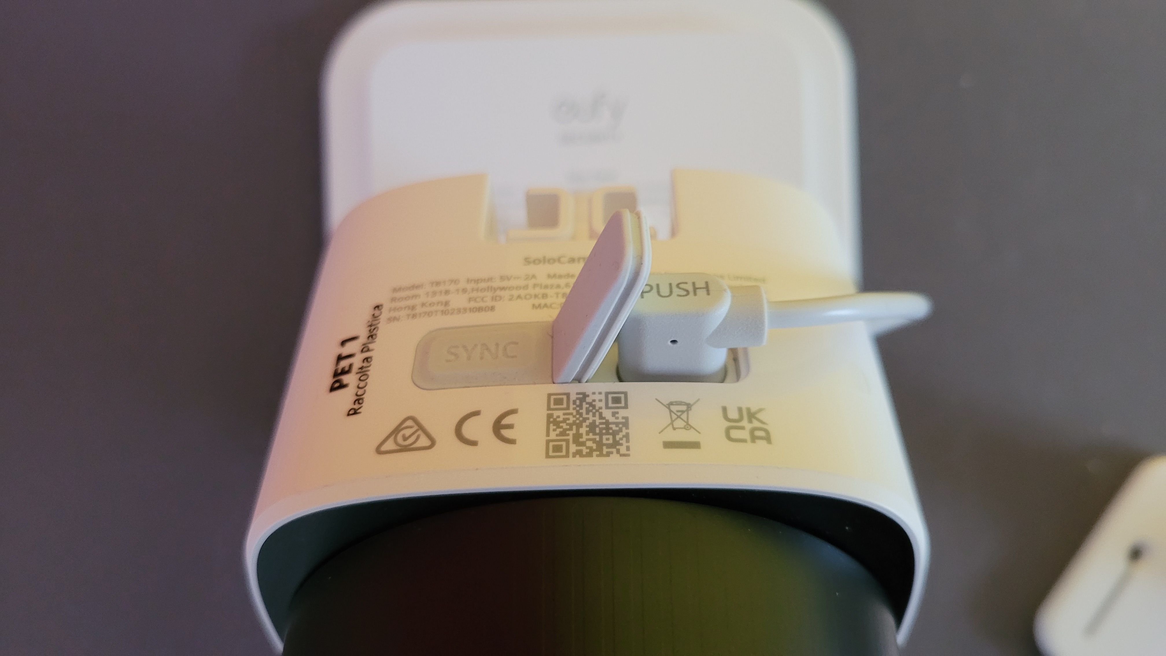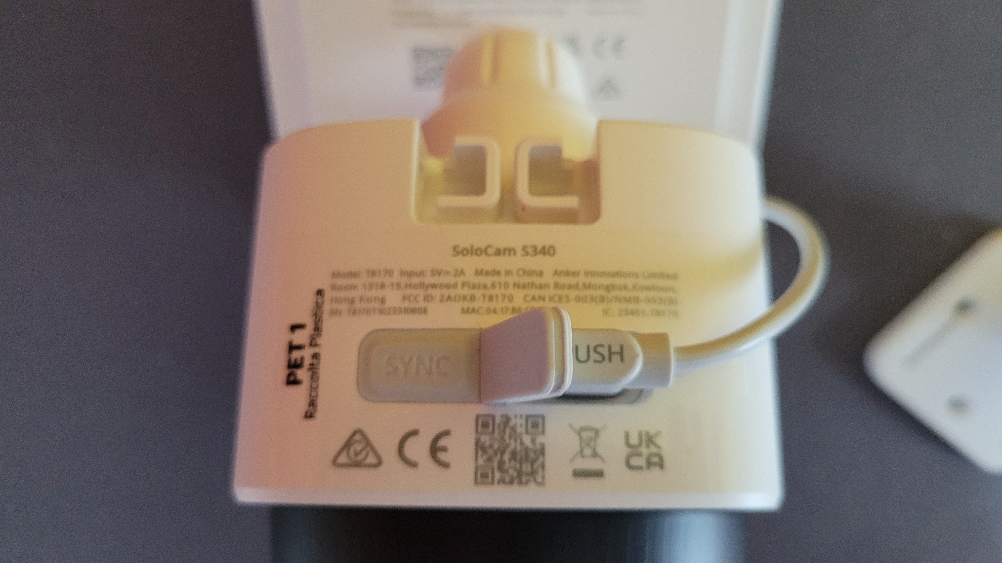 Die knapp 690 Gramm schwere Eufy Solocam S340 (mit Solarpanel) kann man an der Decke oder an der Wand montieren. Sie hinterlässt trotz des Plastikgehäuses optisch und haptisch einen ausgezeichneten Eindruck. Der Durchmesser des an den Ecken abgerundeten Kameragehäuses beträgt etwa 10 Zentimeter, die Höhe beträgt, wenn das Objektiv nach unten zeigt, circa 13 Zentimeter. Noch einmal 10 Zentimeter kommen hinzu, wenn das Solarpanel auf der Oberseite der Kamera montiert ist. Es lässt sich übrigens optimal nach der Sonne ausrichten. Alternativ kann man das Panel auch an einem anderen Ort als die Kamera installieren, wenn diese etwa im Schatten montiert ist. Ist letzteres der Fall, kommt das mitgelieferte 3-Meter-USB-C-Verlängerungskabel zum Einsatz. An den Verbindungsstellen bietet es wetterfeste Anschlüsse. Die Solocam S340 ist nach IP65 staubdicht und vor Strahlwasser geschützt. Wettereinflüsse sollten ihr also nichts ausmachen. Laut Hersteller ist sie im Temperaturbereich zwischen –20 und 50 Grad Celsius einsatzbereit.