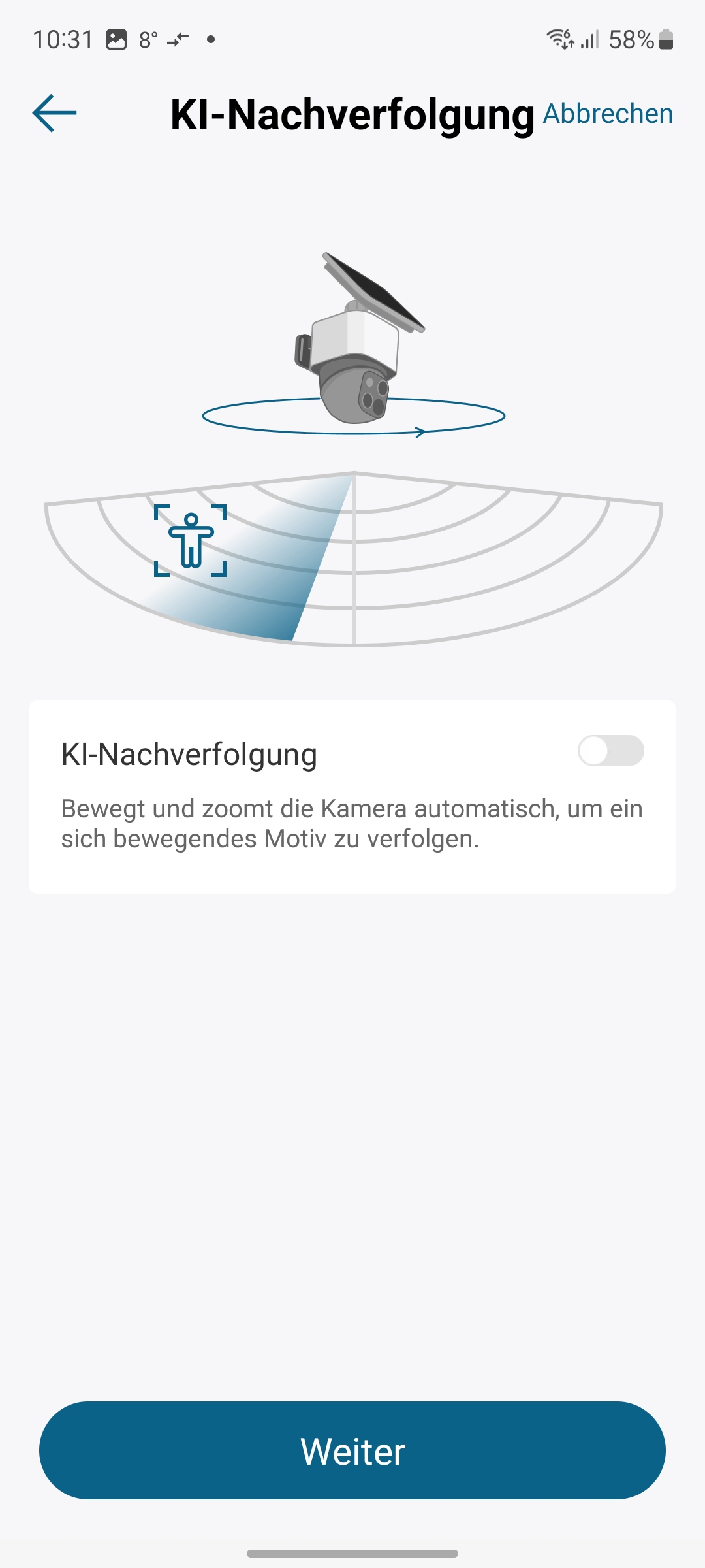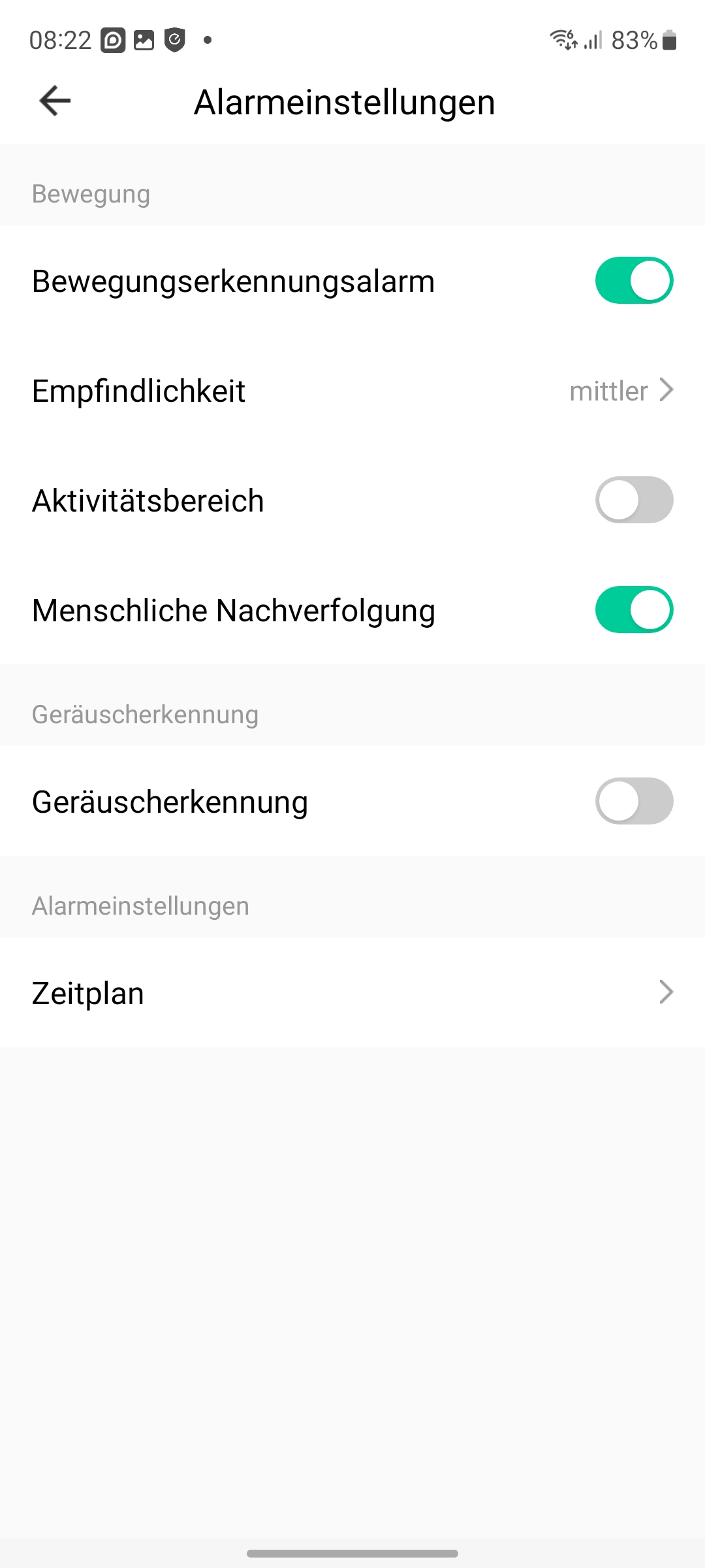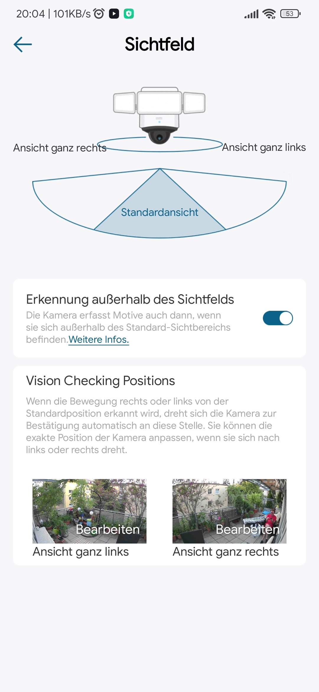 Das Erste, was man bei der Kamera aktivieren sollte, ist die Personenerkennung respektive Körpererkennung, wie die Funktion in der App genannt wird. Tut man das nicht, erhält man auch bei niedrigster Empfindlichkeit der Bewegungserkennung (Einstellung des Erkennungsalarm) häufig Fehlalarme. Das passiert beispielsweise bei vom Wind bewegten Ästen oder Pflanzen. Erst mit der Aktivierung der Körpererkennung werden diese erheblich reduziert. Doch auch dann kommt es noch vereinzelt zu Fehlalarmen. Im Test schlug die Kamera unter anderem Alarm, wenn sie frühmorgens bei Sonnenaufgang von schwarzweißer Infrarot-unterstützter Nachtsicht auf normale Ansicht umschaltet. Den Überwachungsbereich können Anwender mit der Option Aktivitätsbereich eingrenzen. Eine Option Datenschutzzone, bei der der vom Anwender festgelegte Bereich geschwärzt wird, bietet die Kamera allerdings nicht. Ist eine Bewegungsverfolgung gewünscht, aktiviert man in den Einstellungen des Erkennungsalarms die gleichnamige Option.