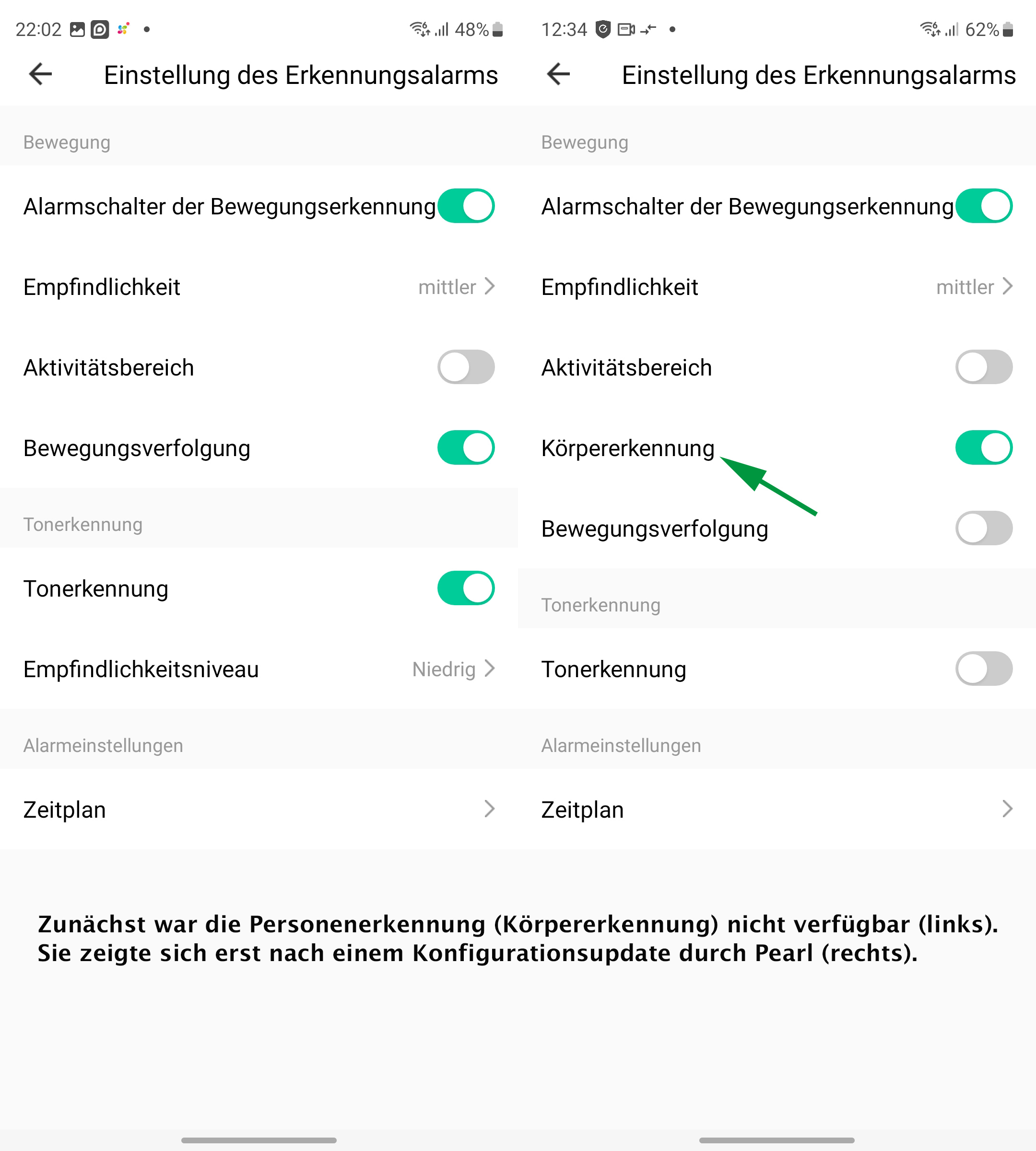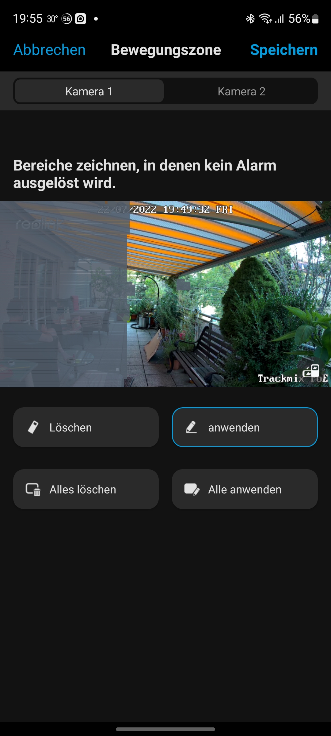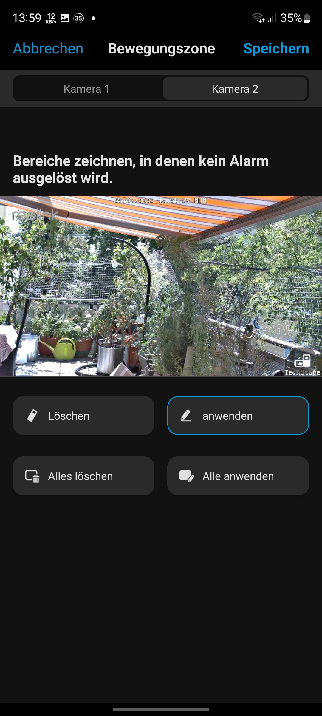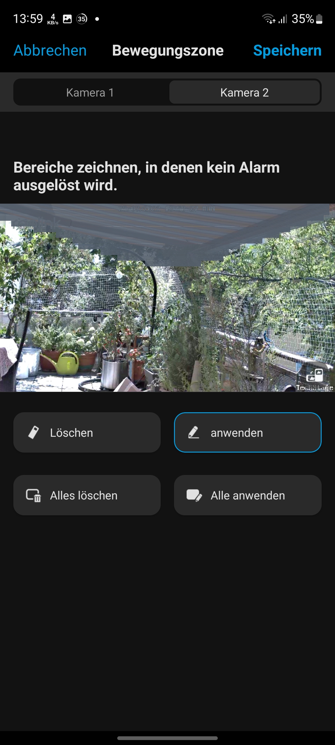 Das Erste, was man bei der Kamera aktivieren sollte, ist die Personenerkennung respektive Körpererkennung, wie die Funktion in der App genannt wird. Tut man das nicht, erhält man auch bei niedrigster Empfindlichkeit der Bewegungserkennung (Einstellung des Erkennungsalarm) häufig Fehlalarme. Das passiert beispielsweise bei vom Wind bewegten Ästen oder Pflanzen. Erst mit der Aktivierung der Körpererkennung werden diese erheblich reduziert. Doch auch dann kommt es noch vereinzelt zu Fehlalarmen. Im Test schlug die Kamera unter anderem Alarm, wenn sie frühmorgens bei Sonnenaufgang von schwarzweißer Infrarot-unterstützter Nachtsicht auf normale Ansicht umschaltet. Den Überwachungsbereich können Anwender mit der Option Aktivitätsbereich eingrenzen. Eine Option Datenschutzzone, bei der der vom Anwender festgelegte Bereich geschwärzt wird, bietet die Kamera allerdings nicht. Ist eine Bewegungsverfolgung gewünscht, aktiviert man in den Einstellungen des Erkennungsalarms die gleichnamige Option.