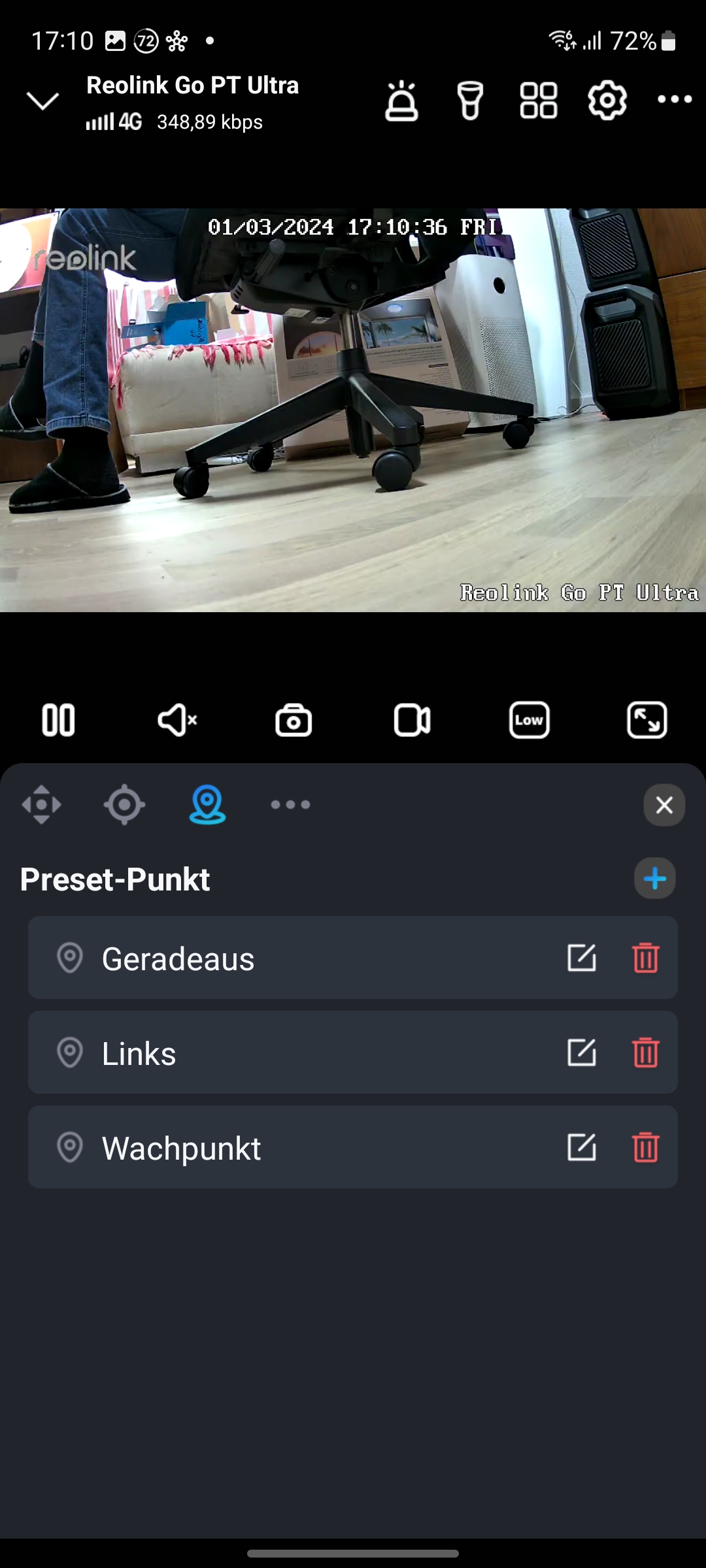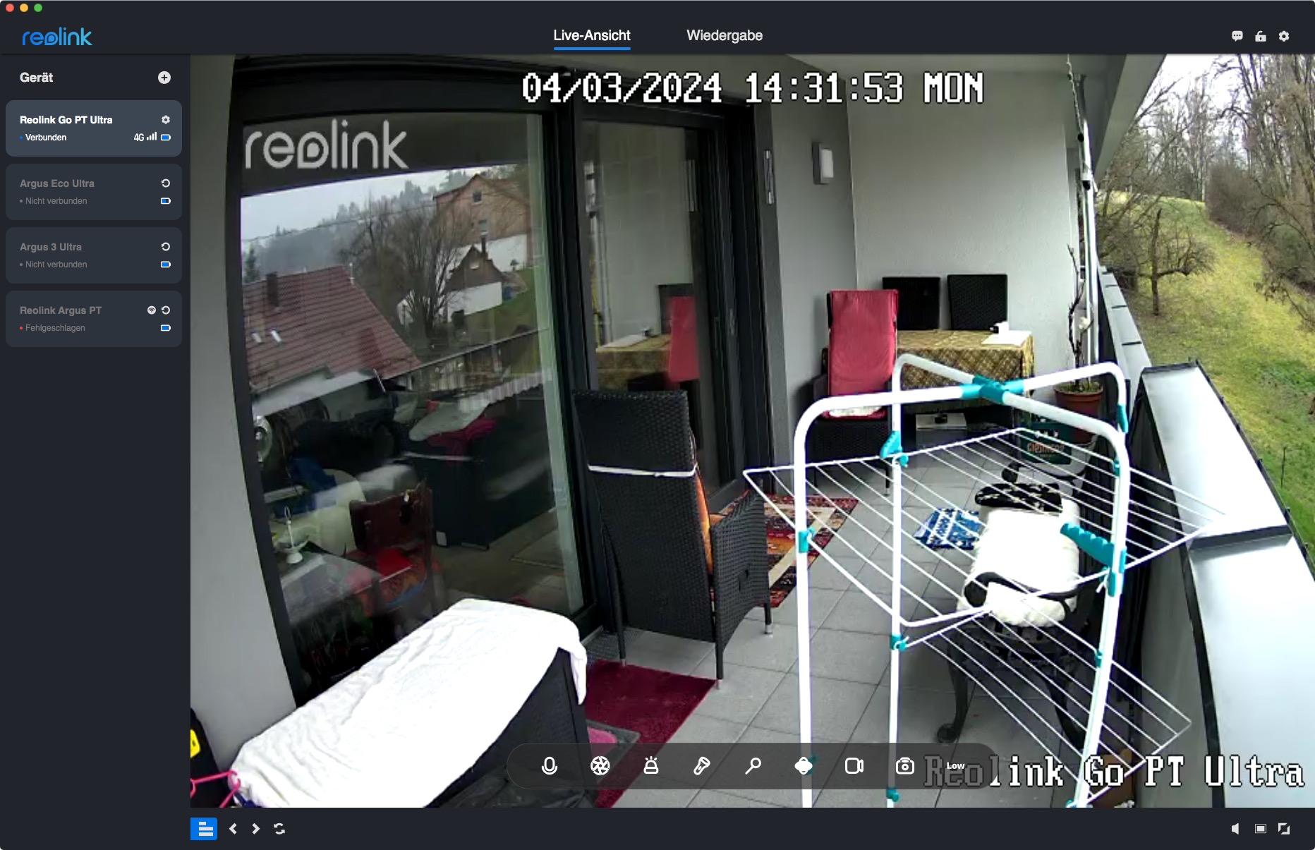 Keine andere LTE-Überwachungskamera bietet eine höhere Auflösung als die Reolink Go PT Ultra. Wer also an einer autarken Kamera mit 8-Megapixel interessiert ist, kann gerne zur Reolink Go PT Ultra greifen. Dank microSD-Karte wird kein kostenpflichtiges Cloud-Abo benötigt, das etwa bei Arlo oder Ring fällig wird, um alle Kamerafunktionen nutzen zu können. Die Go PT Ultra überzeugt im Test jederzeit mit einer stabilen Mobilfunkverbindung, auch in Innenräumen. Den Livestream stellt sie unverzüglich dar, die PTZ-Steuerung ist dank Preset-Punkten kinderleicht, was auch sonst für die Bedienung per App und Desktop-Anwendung gilt.