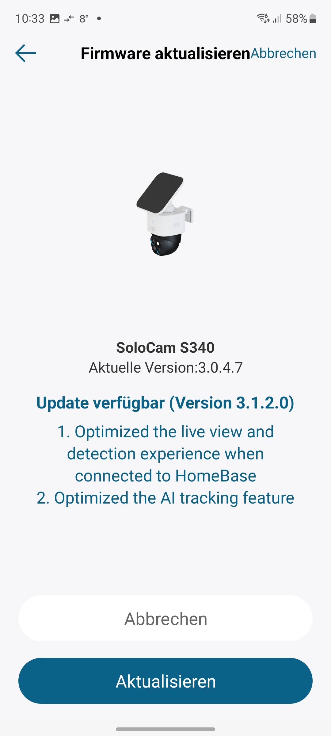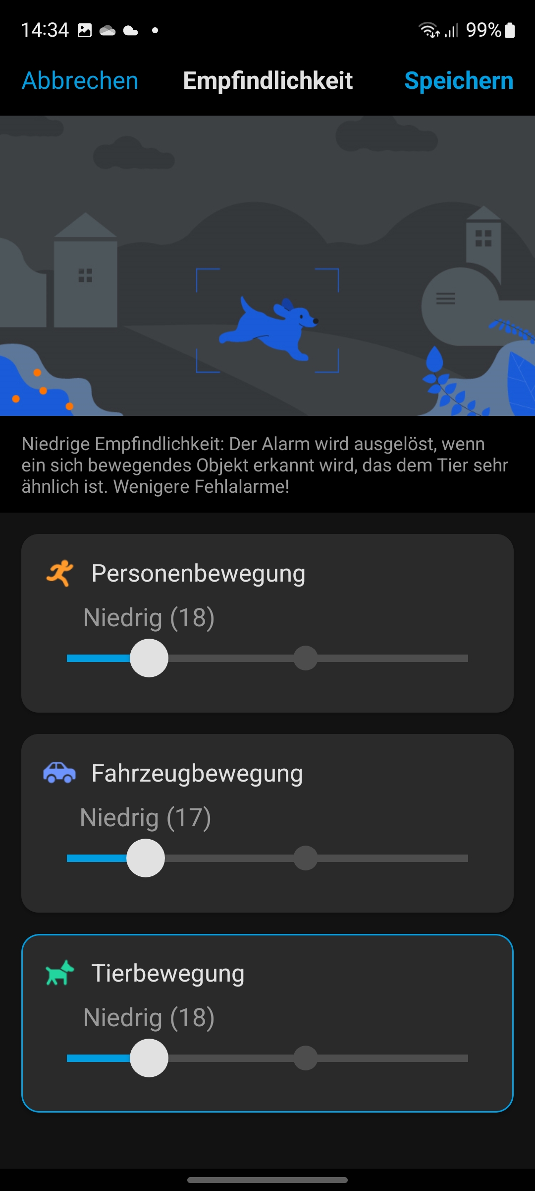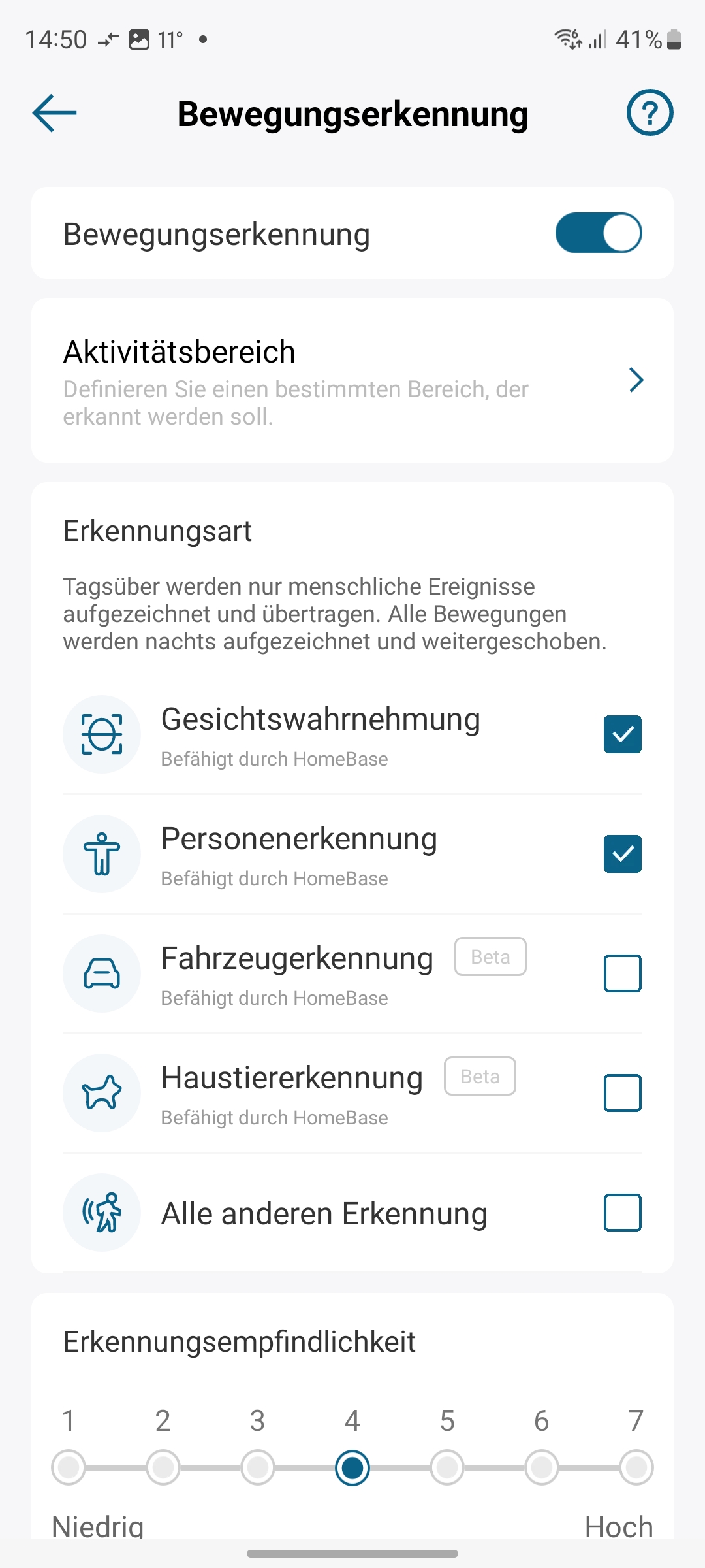 Um Fehlalarme zu vermeiden, können Anwender die Erkennungsart der Bewegungserkennung auf Menschen und/oder Fahrzeuge begrenzen. Im Test hat das die Kamera einwandfrei hinbekommen und bei Menschen alarmiert, bei Haustieren zum Beispiel aber nicht. Apropos Haustiere: Mit der optionalen Anbindung an die Homebase 3 kann die Solocam S340 auch Haustiere und Gesichter identifizieren.