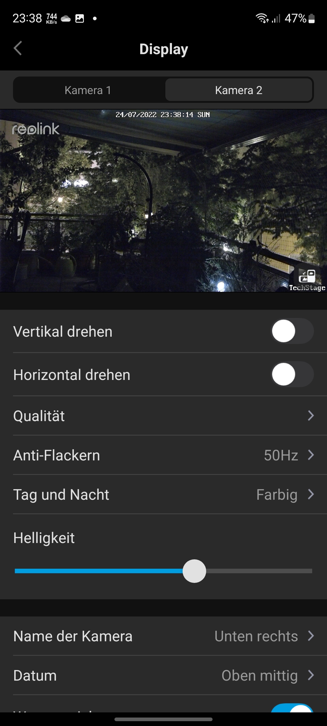 Über das Zahnrad-Symbol können Anwender mit der App oder der Desktop-Anwendung die Reolink Trackmix PoE umfangreich justieren. Im Abschnitt Display lässt sich etwa die Position von Kameraname sowie Datum und Zeit im Live-Bild verändern. Die Angaben kann man aber auch wie das Wasserzeichen vollständig ausblenden.