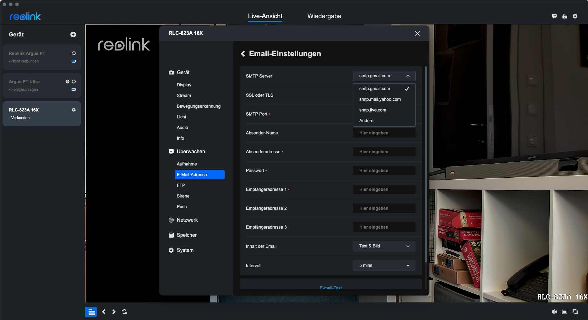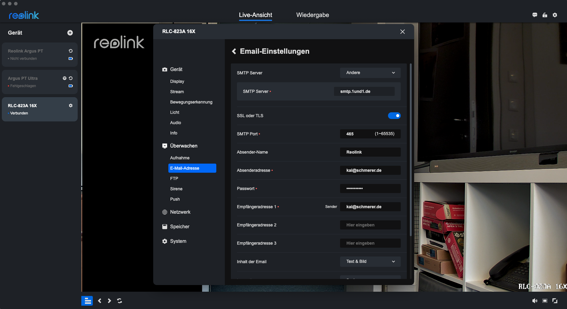 Benachrichtigungen zu Alarmen erfolgen wie bei anderen Reolink-Kameras wie der Argus 3 Pro (Testbericht) per Push in der App und optional über E-Mail. Für letzteren Übertragungsweg können Anwender bis zu drei E-Mail-Adressen konfigurieren, wobei die erste mit Angabe des SMTP-Servers und Ports konfiguriert sein muss. Im Test hat das mit einem Gmail-Konto mit aktivierter Zwei-Faktor-Überprüfung nicht funktioniert. Ohne Zwei-Faktor-Authentifizierung verläuft die E-Mail-Benachrichtigung problemlos. Zusätzlich ertönt bei einer Warnung optional auch eine Sirene. Allerdings ist die nicht so laut.