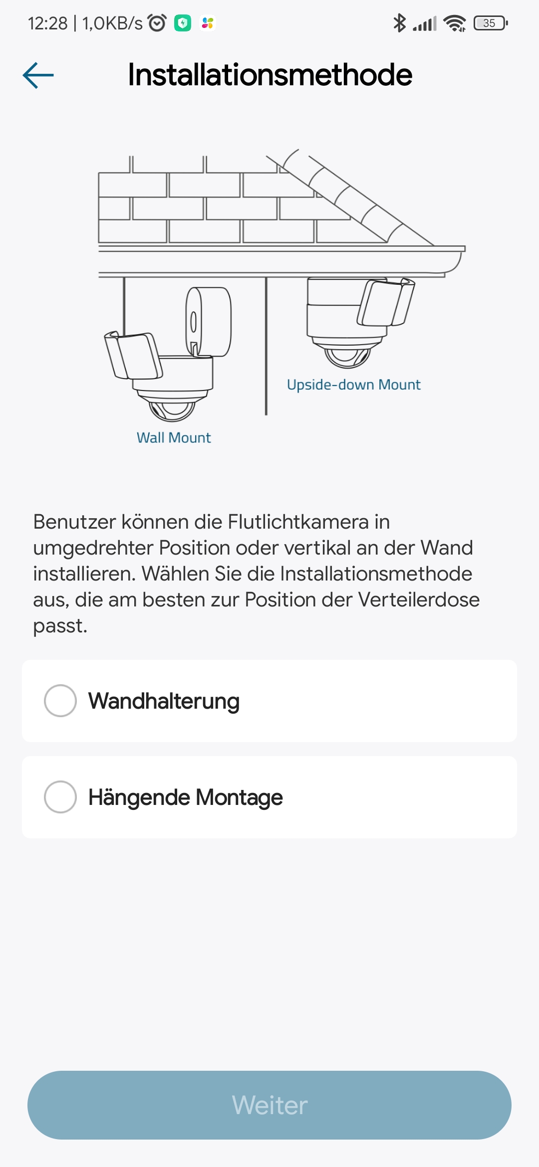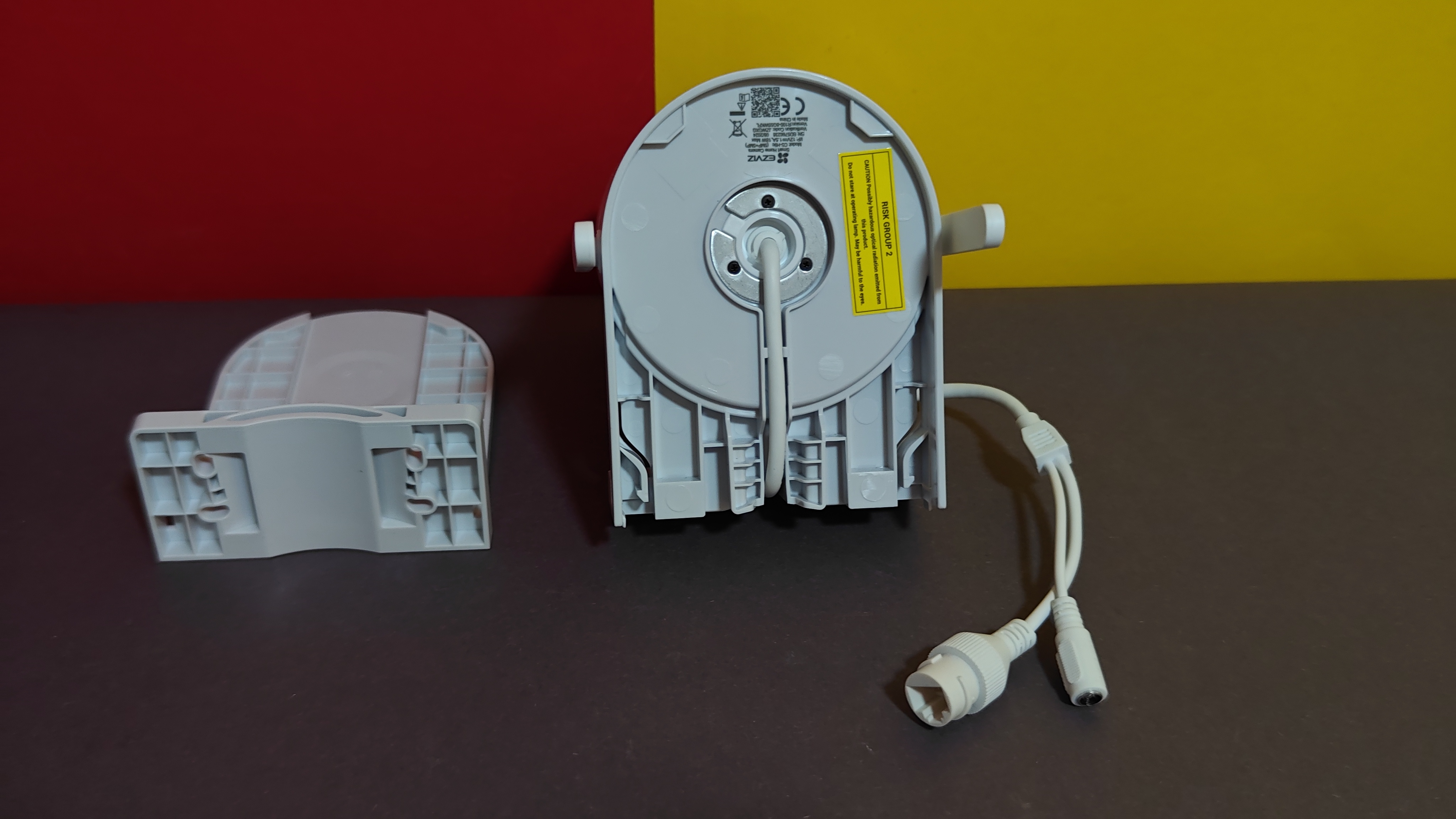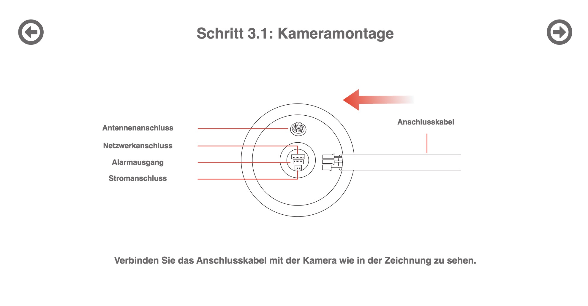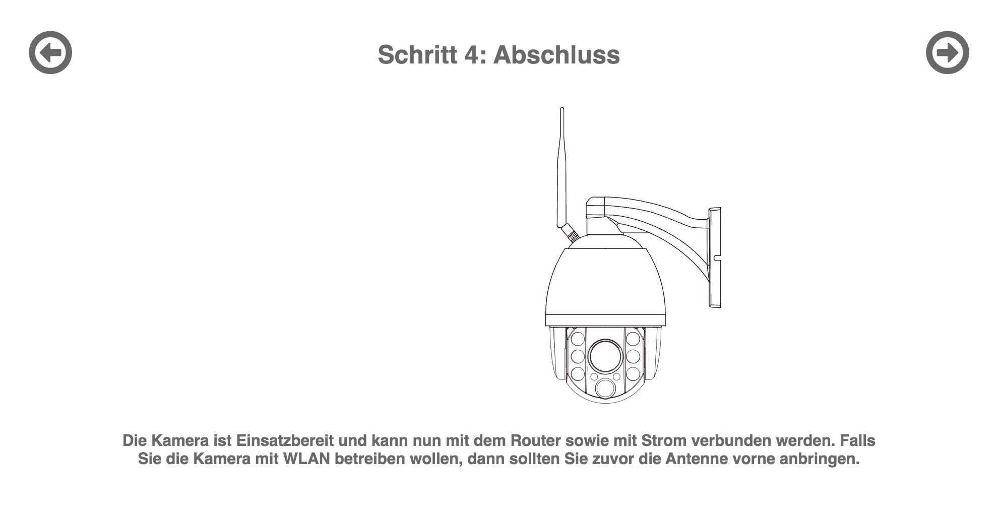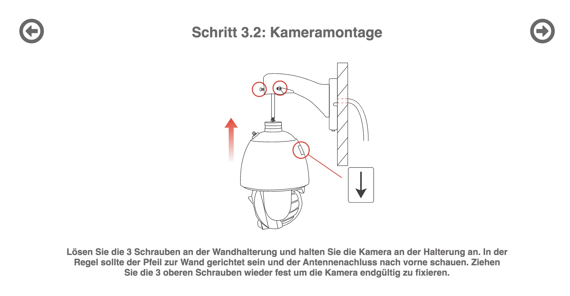 Zur Befestigung der 520 Gramm schweren Kamera an einer Wand sind im Lieferumfang eine Bohrschablone sowie Schrauben und Dübeln enthalten. Die Kamera sowie die damit verbundene Halterung besteht aus Plastik. Rein haptisch macht sie aber einen stabilen Eindruck und bietet einen Wetterschutz nach IP65.