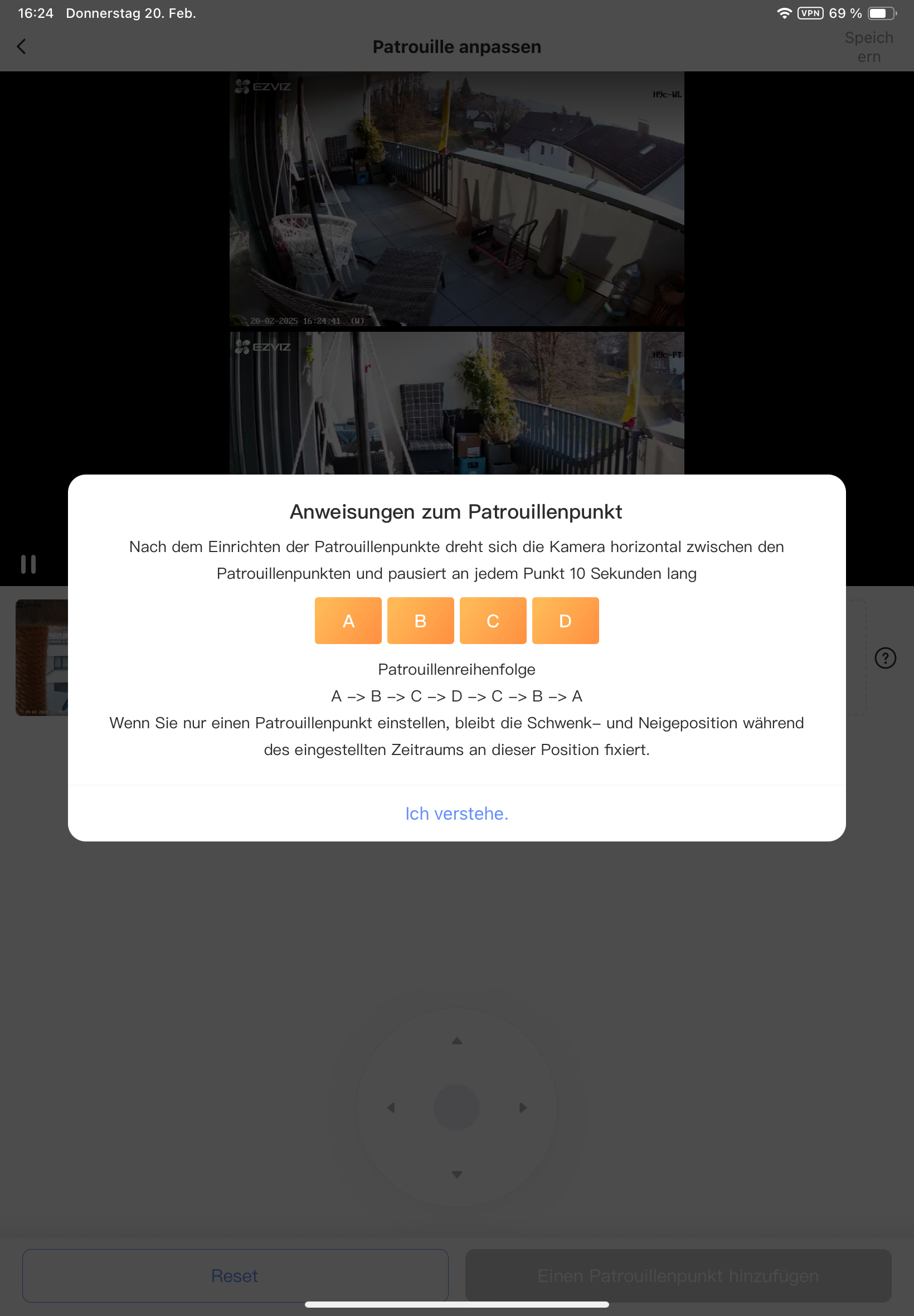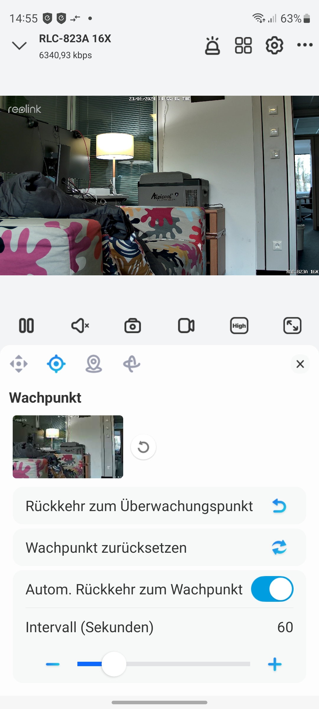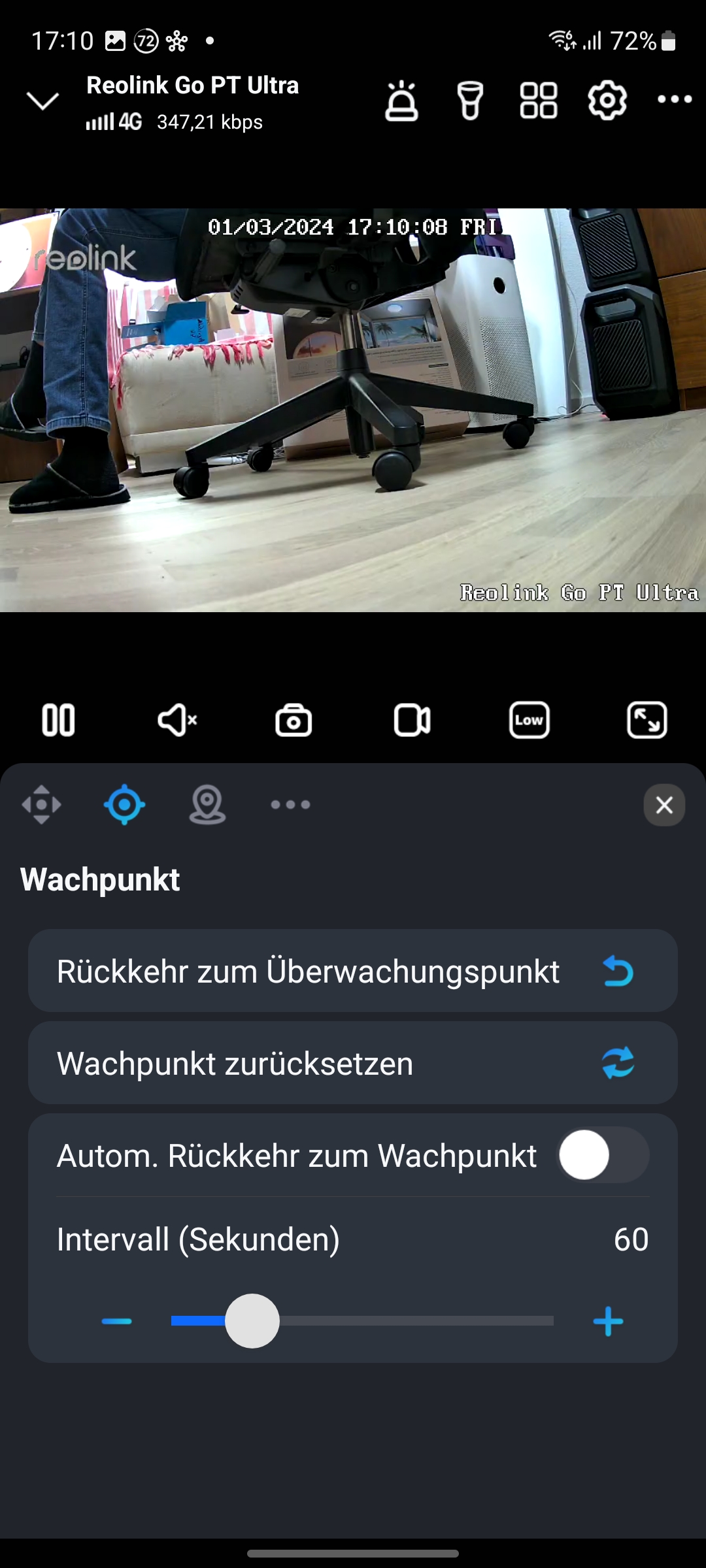 Die PTZ-Mechanik funktioniert im Test problemlos und zügig. Um bestimmte Blickwinkel schneller abrufen zu können, bietet die Go Ultra sogenannte Preset-Punkte. Bis zu 32 Kameraansichten können Anwender dafür definieren. Außerdem können sie noch einen Wach-Punkt festlegen, zu dem die Kamera nach einem einstellbaren Intervall zwischen 10 und 300 Sekunden automatisch zurückkehrt. Eine Patrouillenfahrt entlang der definierten Preset-Punkte bietet die Go Ultra anders als die Reolink Reolink RLC-823A 16x (Testbericht) hingegen nicht.
