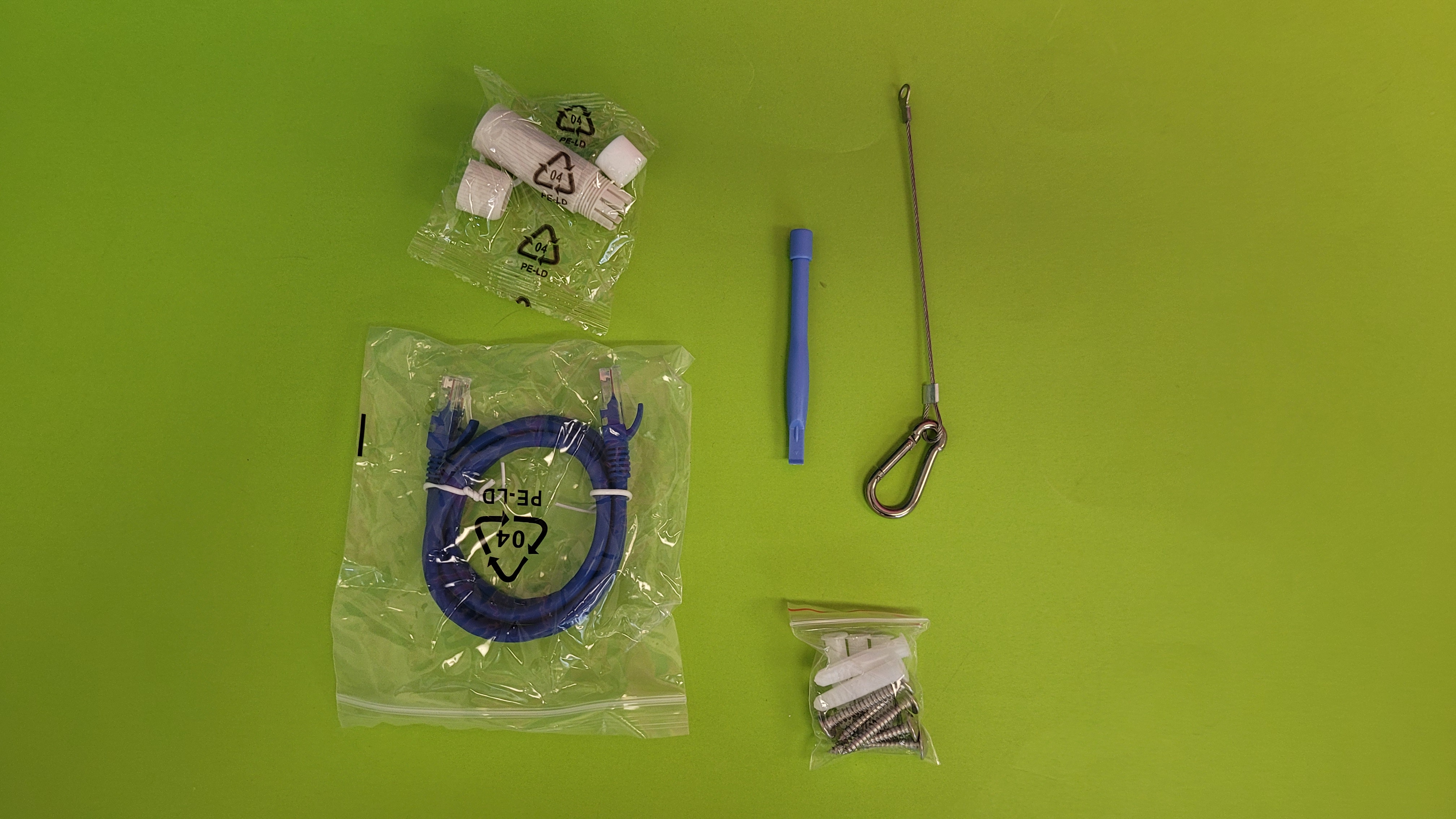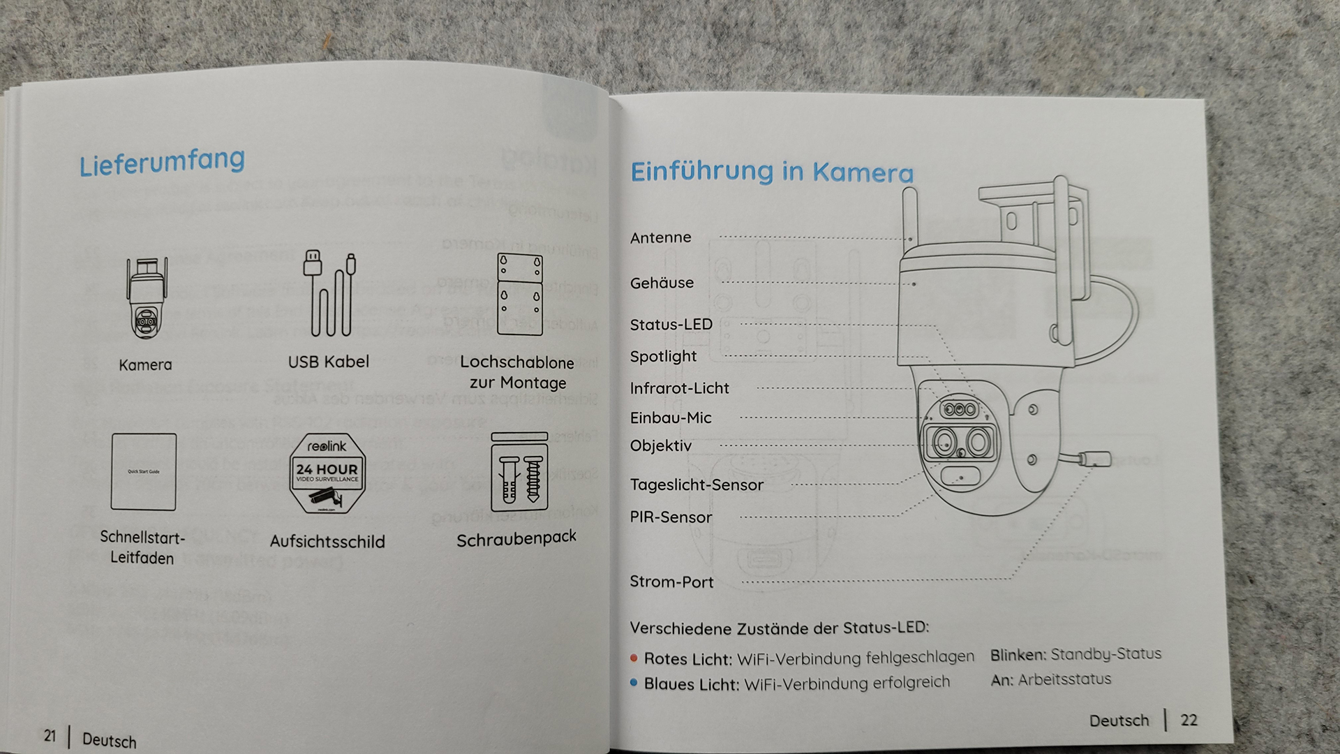 Der Lieferumfang umfasst eine Lochschablone zur Montage inklusive Schrauben und Dübel, einen Aufkleber mit Hinweis zur 24-Stunden-Überwachung sowie eine wasserdichte Abdeckung für den Anschluss des Netzwerkkabels am PoE-Port. Eine Kurzanleitung, die ausführliche und relevante Informationen zu Montage und Betrieb der Kamera auch auf Deutsch bietet, gibt es ebenfalls.