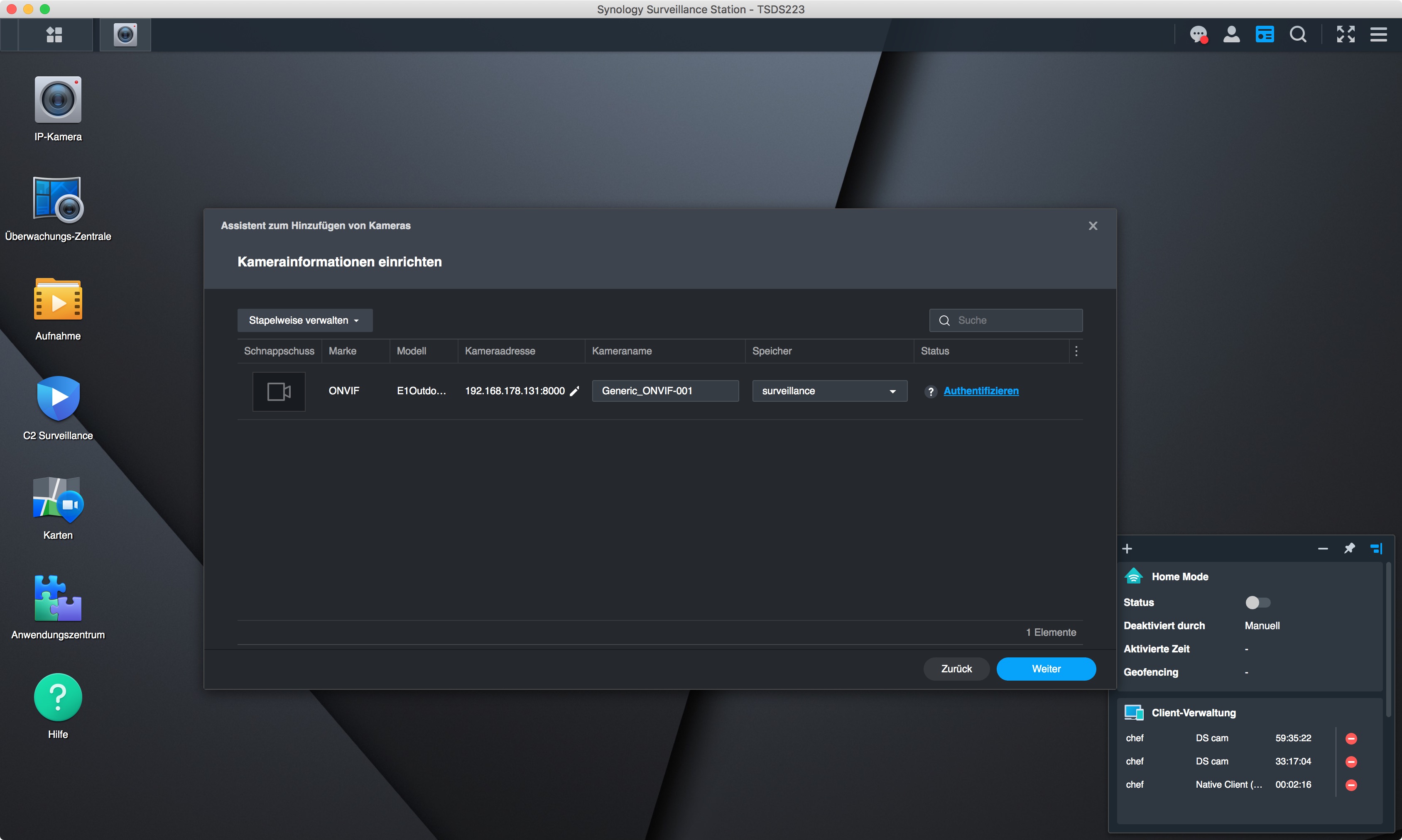 Dank Onvif-Support können Anwender die Kamera auch mit Dritthersteller-Apps wie Tiny Cam oder Synology Surveillance Station nutzen. Allerdings nennt das Handbuch dazu keine Zugangsdaten. Nach einer kurzen Recherche im Internet ist klar: Konto und Passwort lauten „admin“. Jetzt kann man in der App das Passwort ändern. Die IP-Adresse, über die man per Dritthersteller-Software auf die 7Links IPC-740 (ZX-5346) zugreifen kann, steht in der App im Abschnitt Onvif. Im Test konnten wir mit Tiny Cam und auch mit der Synology Surveillance Station die 7Links damit steuern (siehe Bildergalerie). In Verbindung mit der Surveillance Station konnten aufgenommene Videos direkt in der NAS speichern. Mehr Informationen dazu bietet unser Ratgeber Synology Surveillance Station: NAS als Zentrale für Überwachungskameras im Test.