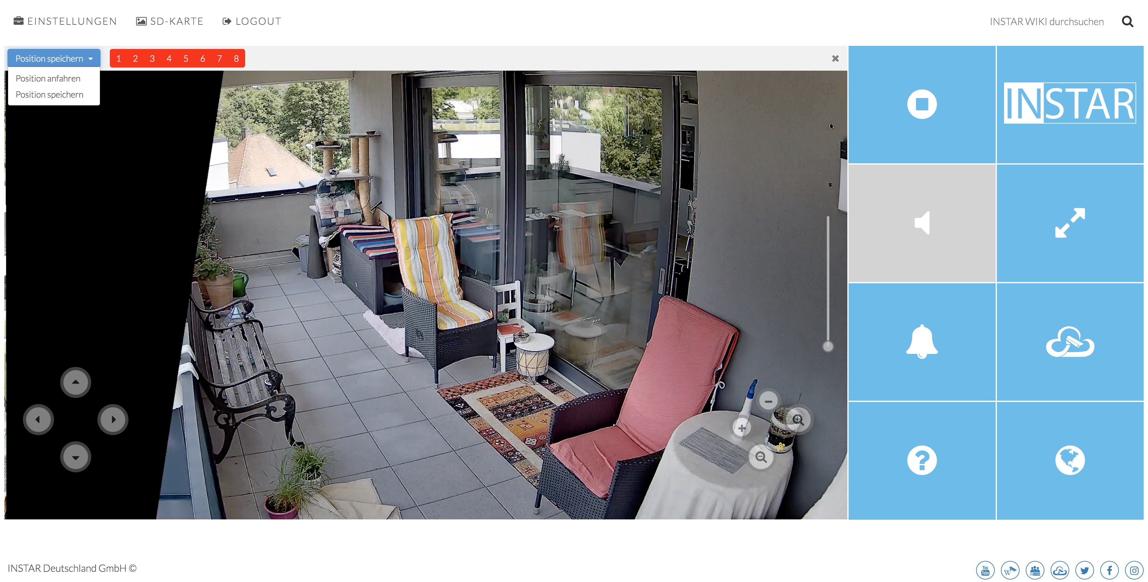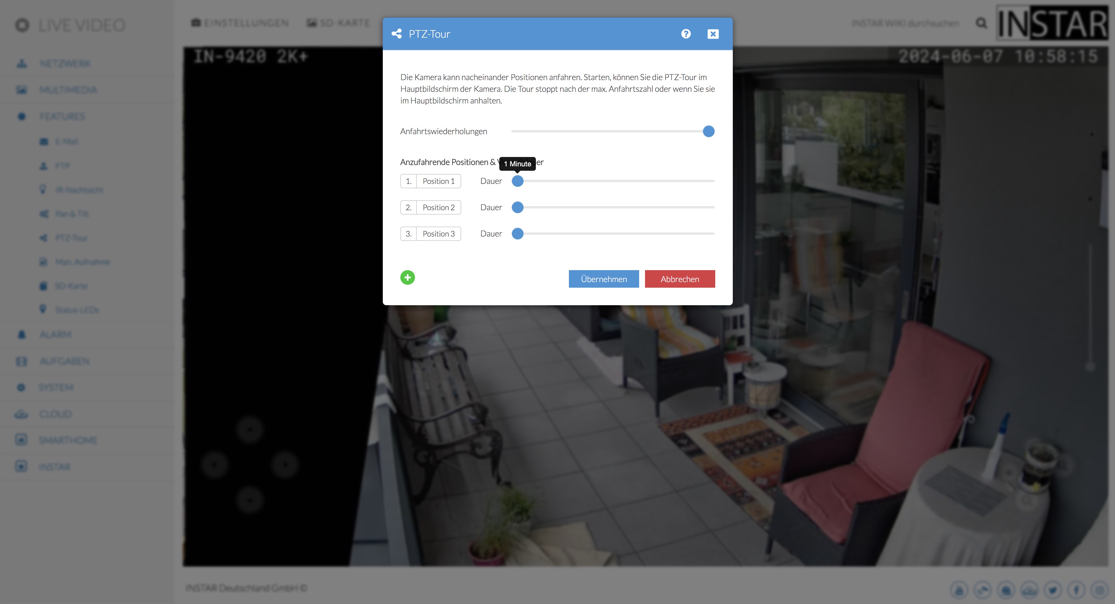 Die Steuerung der Schwenk- und Neigefunktion ist äußerst vielfältig. Instar informiert darüber ausführlich in seinem Online-Wiki. Insgesamt können Anwender bis zu acht Positionen speichern, die per Klick oder automatisch angefahren werden. Für ein automatisches Anfahren von Positionen müssen diese natürlich definiert sein. Dann kann man in der Web-UI eine Zeit für die jeweilige Position einstellen, wie lange die Kamera auf dieser verweilen soll, möglich sind Werte zwischen 1 Minute bis zu 12 Stunden. Anschließend stellt man noch die Anzahl der Wiederholungsfahrten ein, hier sind maximal bis zu 50 möglich. Nun fährt die Kamera automatisch die zuvor gespeicherten Positionen ab.