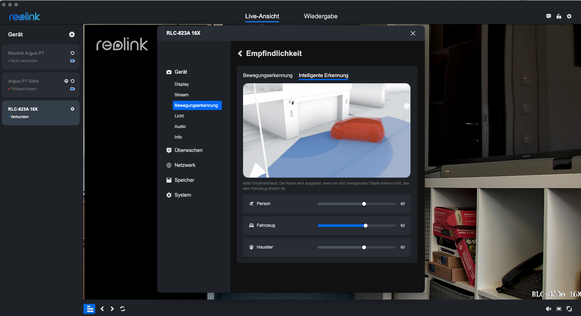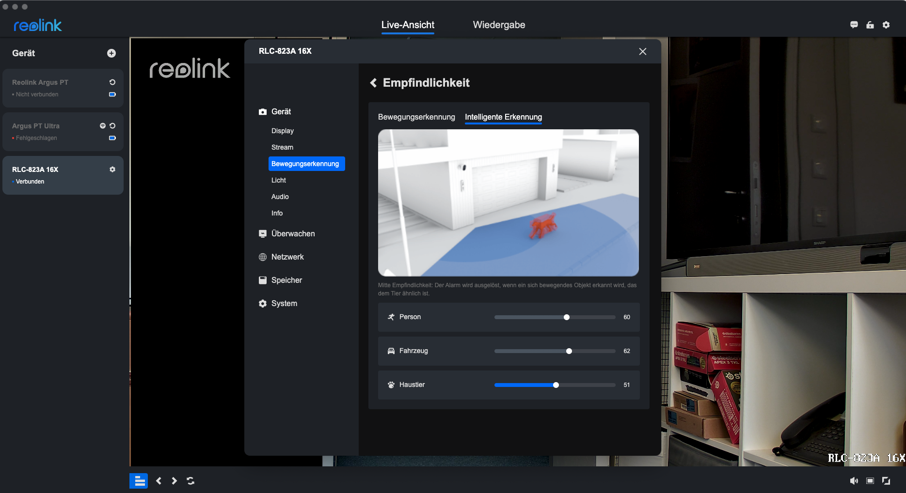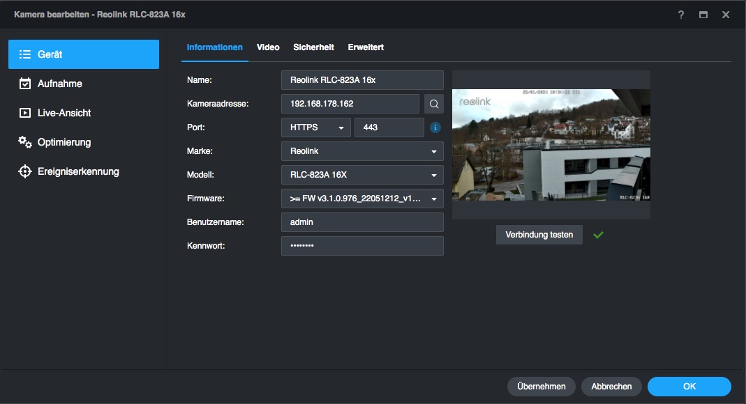 Dank Onvif-Support kann man die Reolink RLC-823A 16x in kompatible Smart-Home-Zentralen (Bestenliste) wie Homey Pro oder Home Assistant integrieren und für Automatisierungen nutzen. In Verbindung mit anderen smarten Sensoren (Bestenliste) ist so der Aufbau eines leistungsfähigen Alarmsystems möglich. Mit Home Assistant und dem Plug-in Frigate können Anwender sogar einen leistungsfähigen Netzwerk-Video-Rekorder realisieren. Alternativ kann man für letzteres aber auch Dritthersteller-Lösungen wie Synology Surveillance Station (Ratgeber) verwenden.