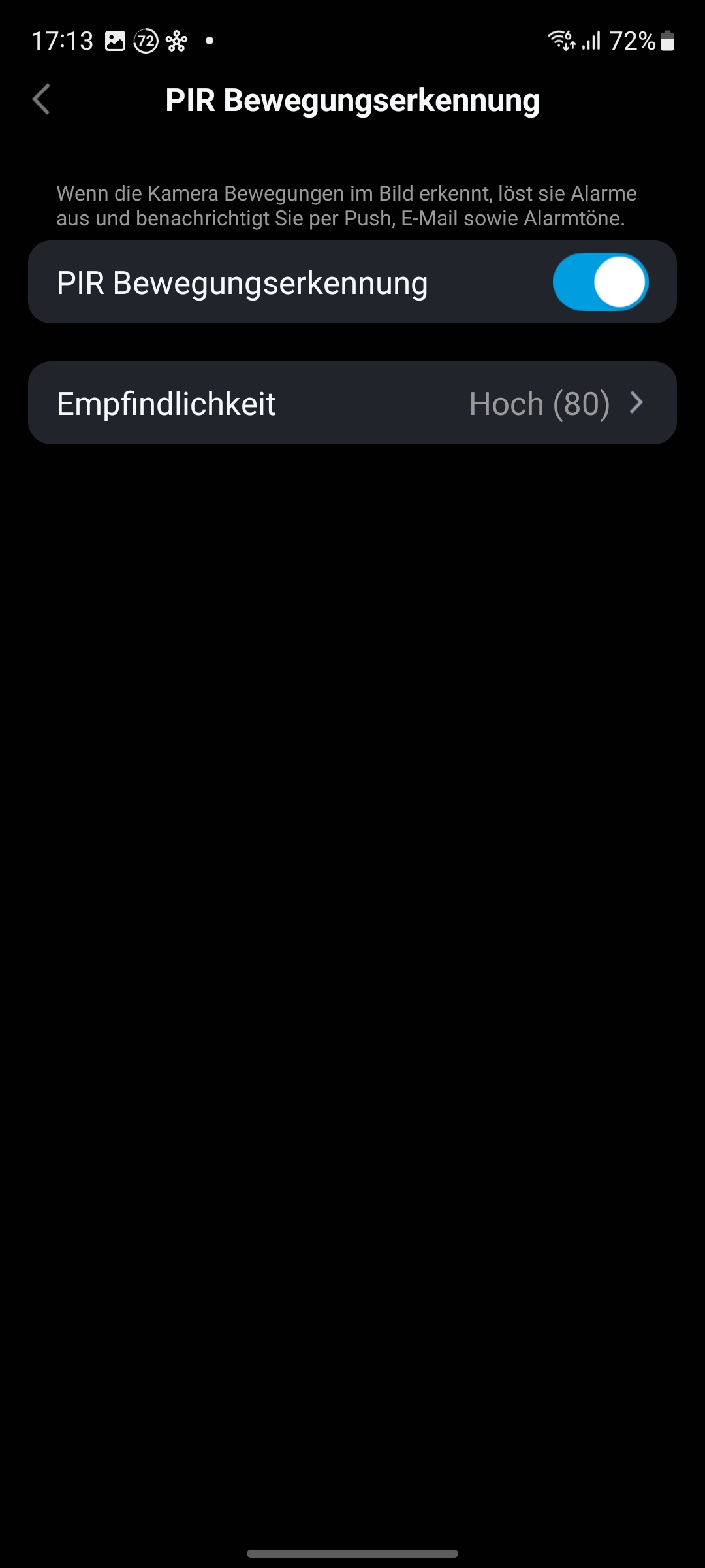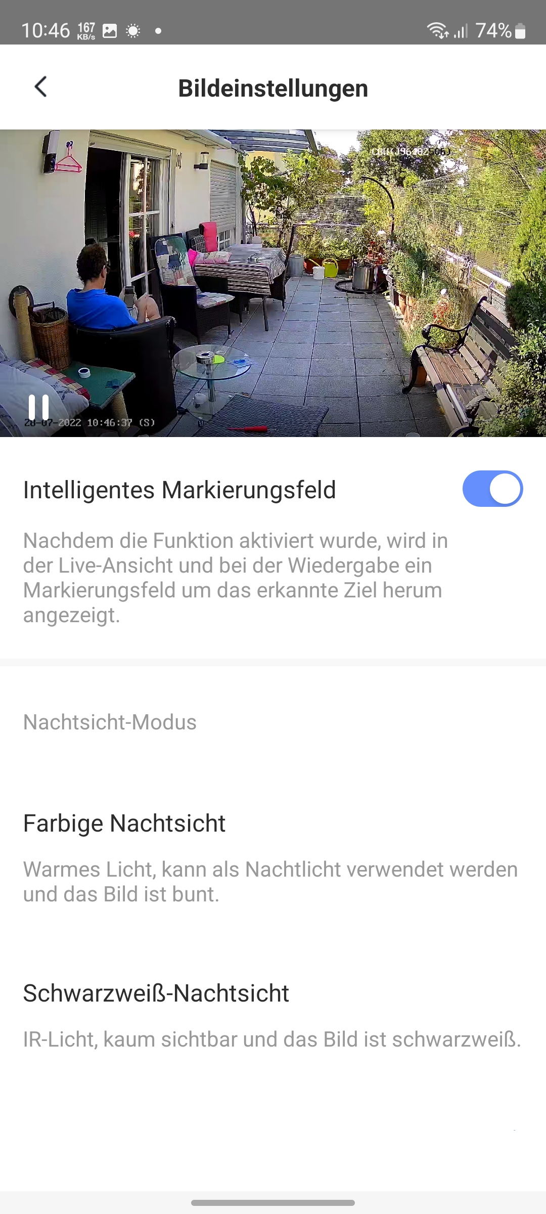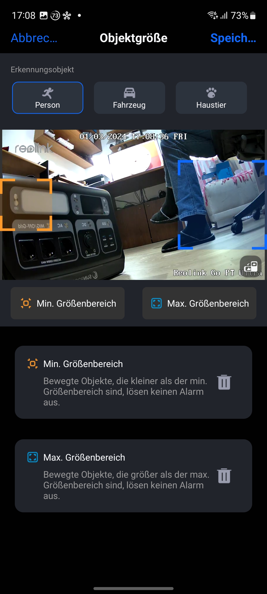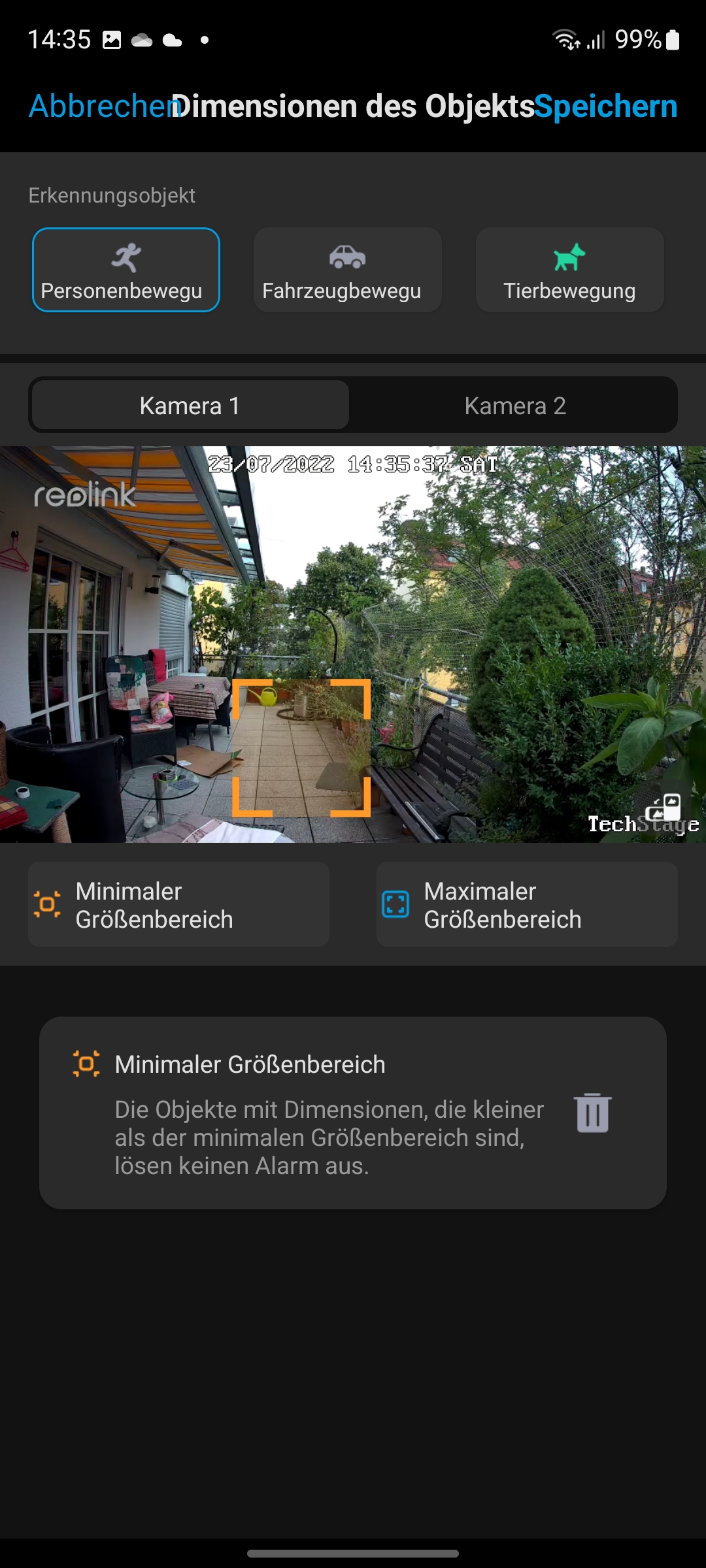 Der Livestream steht in der App oder Browser zügig parat, wenn die Kamera per Ethernet mit dem Router verbunden ist. Über WLAN muss man unter Android einige Sekunden warten, während die iOS-App ihn etwas zügiger anzeigt. Fehlalarme sind dank Personen-, Fahrzeug- und Tiererkennung praktisch ausgeschlossen. Im Test haben wir jedenfalls keine registriert.