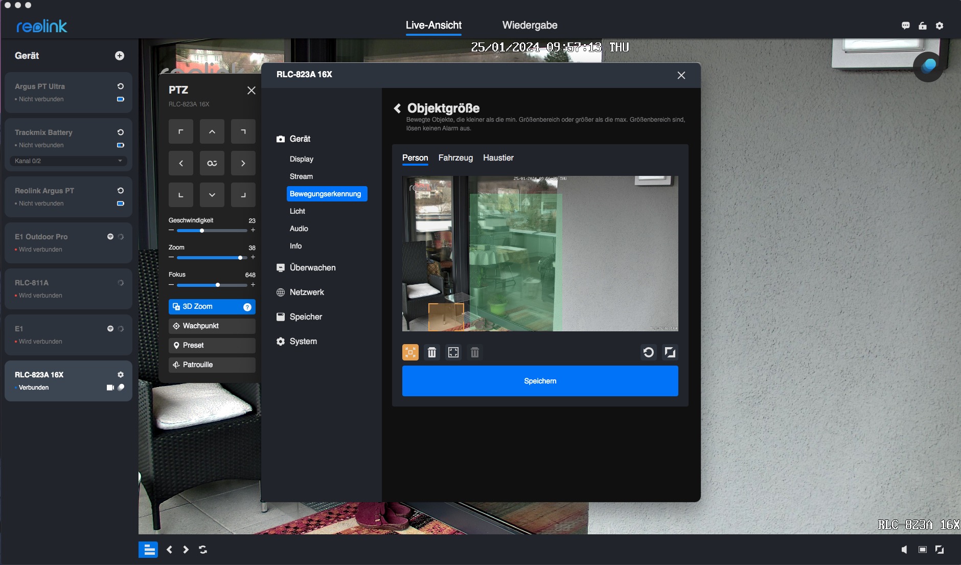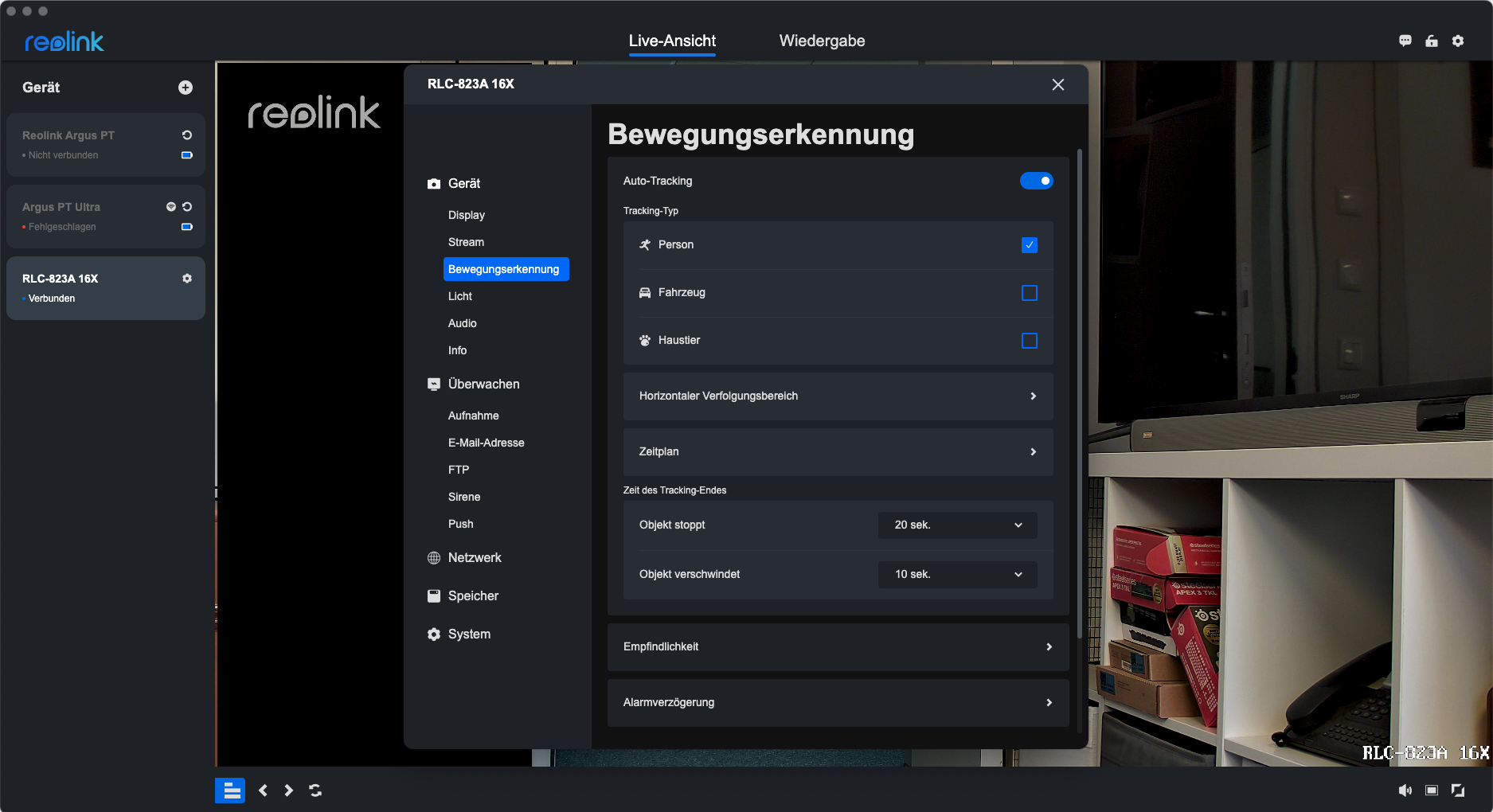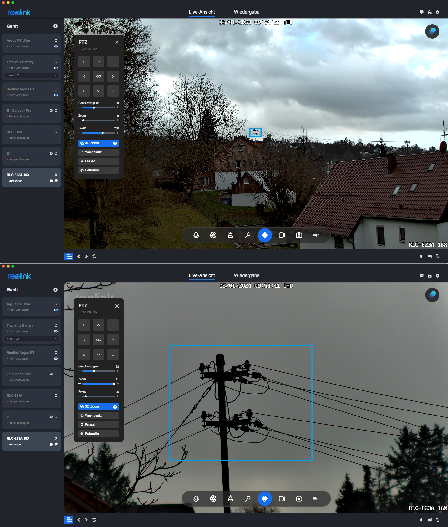 Fehlalarme sind dank der Differenzierung von Personen, Fahrzeugen und Haustieren und den zahlreichen Einstellmöglichkeiten wie Empfindlichkeit und Größe des Objekts praktisch ausgeschlossen. Nützlich ist die automatische Bewegungsverfolgung, mit der die Kamera einmal erfasste Objekte nicht mehr aus den „Augen“ verliert, sowie die Patrouillen-Funktion, mit der sie zuvor festgelegte Positionseinstellungen (Presets) für eine vom Anwender definierte Dauer automatisch überwacht. Wie von Reolink-Kameras gewohnt, bietet auch die RLC-823A 16x einwandfreie Leistungswerte in puncto Konfiguration, Bedienung und Alarm-Benachrichtigung (Push, E-Mail, FTP-Server). Die flexible Steuerung per Smartphone- und Desktop-App sowie Browser steht ebenfalls auf der Habenseite. Positiv ist auch, dass sich die Reolink RLC-823A 16x im Unterschied zu Lösungen von Ring oder Arlo vollständig ohne kostenpflichtige Cloud betreiben lässt.