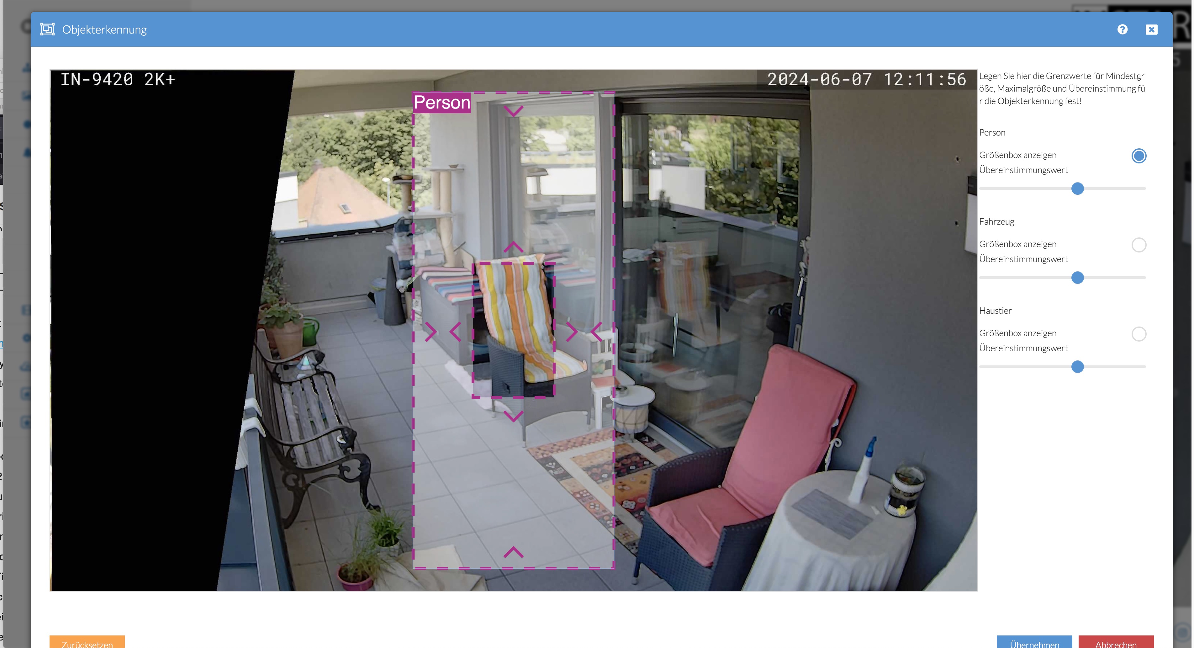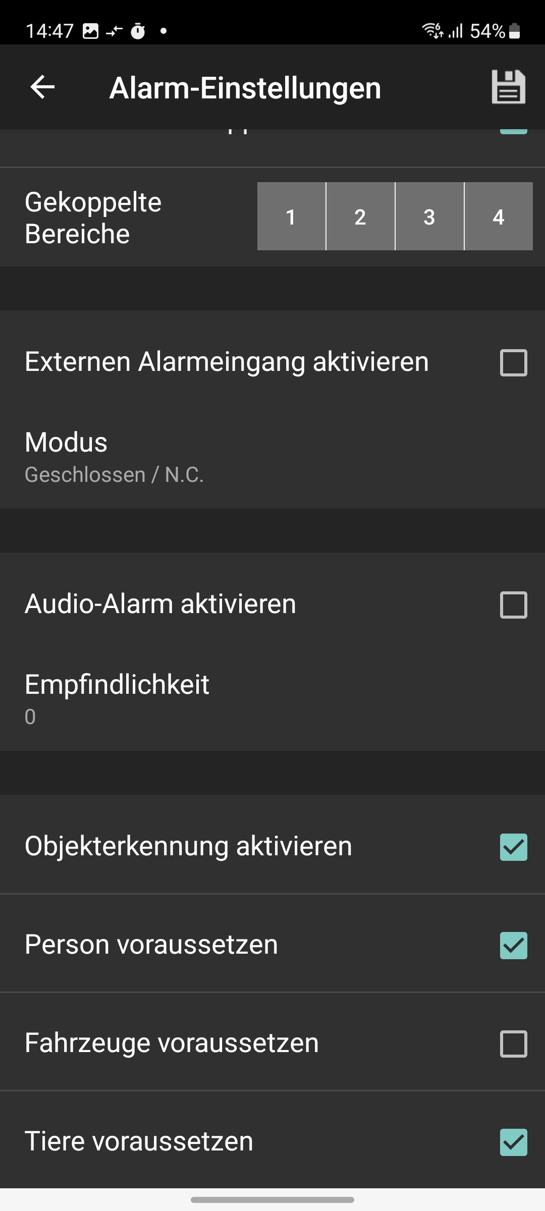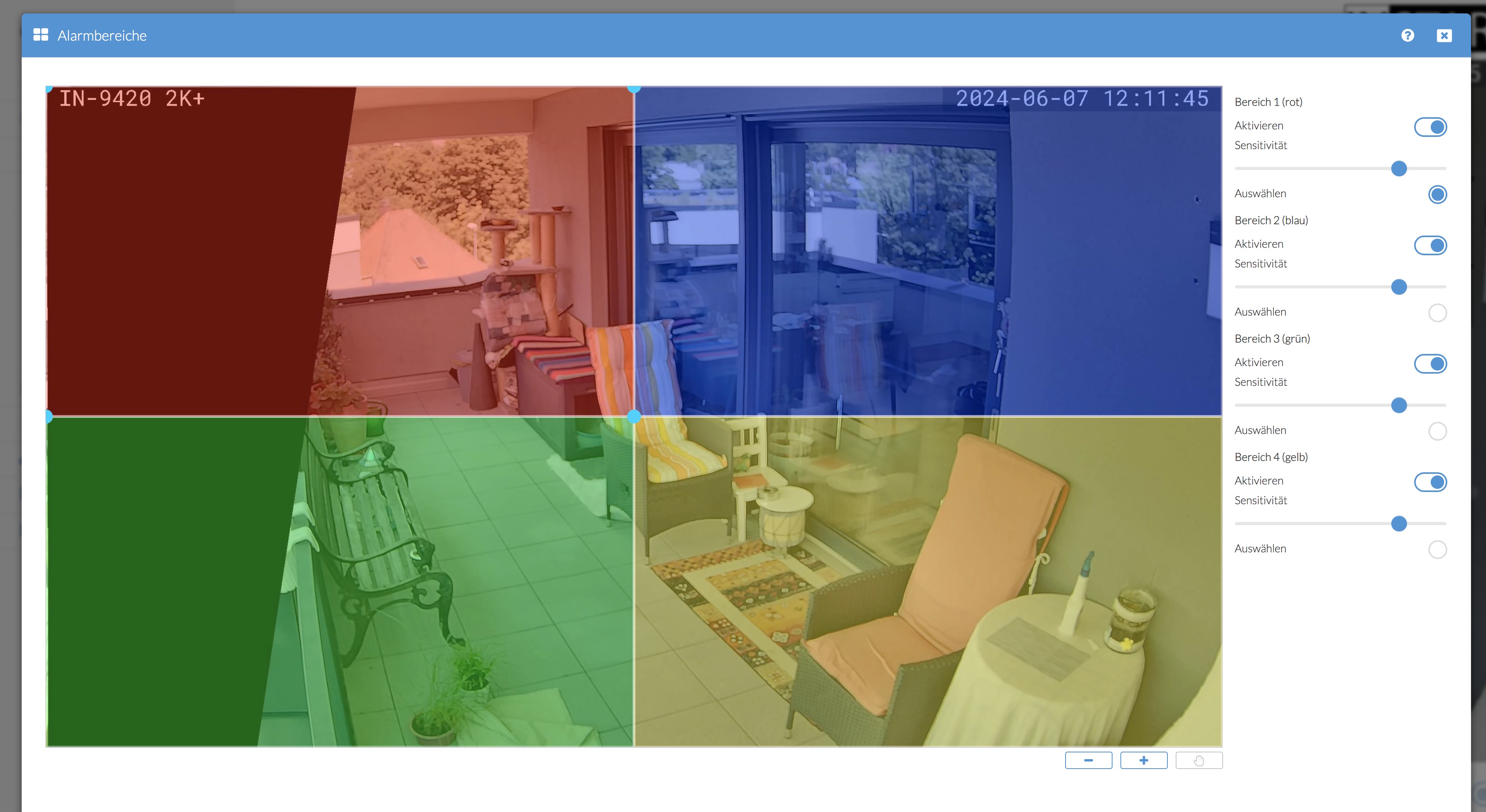 Die Bewegungserkennung kann zwischen Personen, Tieren und Fahrzeugen differenzieren. Dementsprechend lassen sich auch Alarme einstellen. Damit werden Fehlalarme durch andere, sich bewegende Objekte reduziert. Sollte es trotz aktivierter Personenerkennung zu Fehlalarmen kommen, können Anwender unter Alarmbereiche die Empfindlichkeit der Bewegungserkennung für vier Zonen justieren.