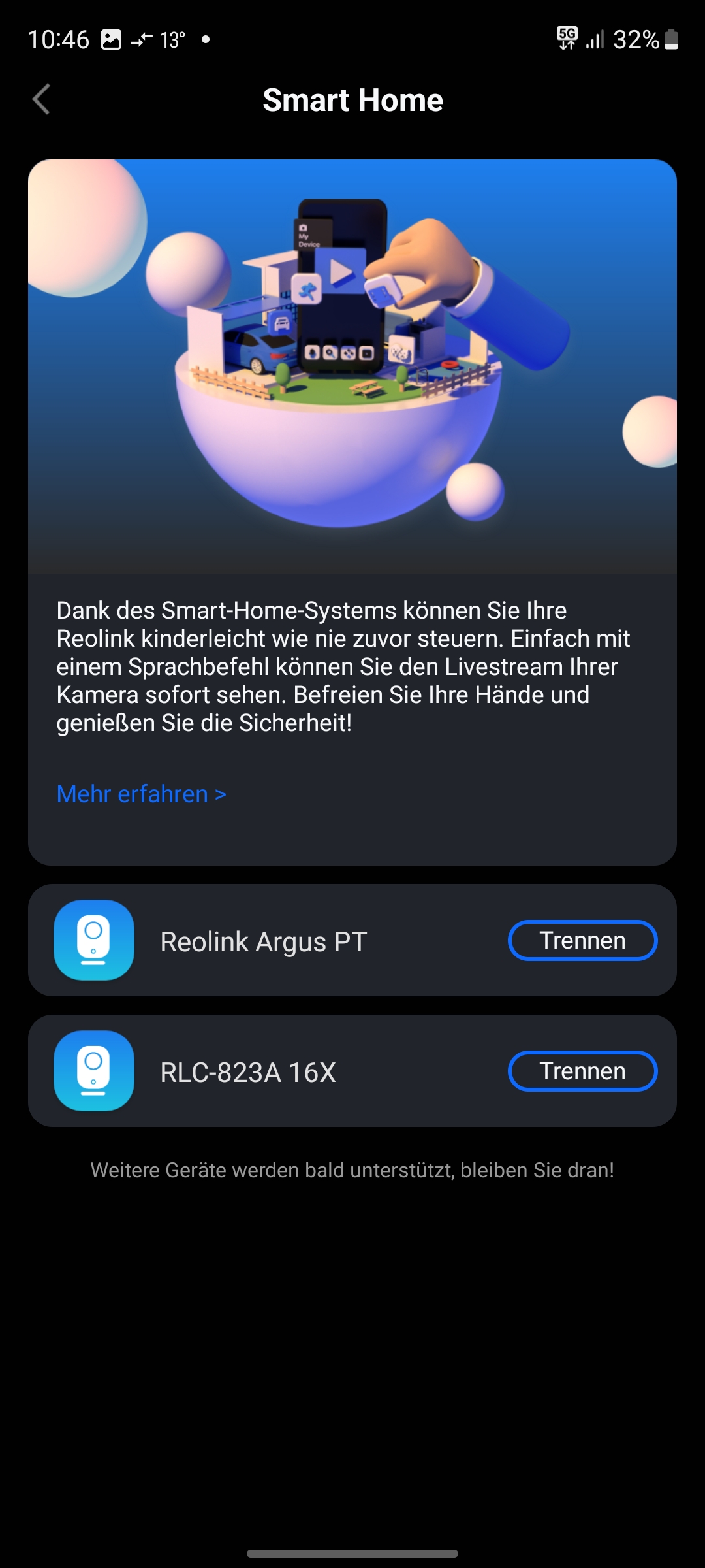 Die Reolink Go PT Ultra arbeitet auch in Verbindung mit den Sprachassistenten Google Assistant und Amazon Alexa. So können Anwender den Livestream auf einem smarten Display (Ratgeber) wie Nest Hub oder Echo Show betrachten. Ansonsten bietet Reolink keine weiteren Möglichkeiten, die Go PT Ultra in Smart-Home-Systeme wie Aqara (Ratgeber), Bosch (Testbericht), Elesion (Ratgeber), Home Assistant (Testbericht), Homekit (Ratgeber), Homey Pro (Test) oder Smartthings (Testbericht) einzubinden. Auch zu Smart-Home-Diensten wie IFTTT ist die Reolink nicht kompatibel. Das Gleiche gilt für den Standard Open Network Video Interface (ONVIF), den Reolink mit seinen Akku-betriebenen Modellen wie der Go PT Ultra nicht unterstützt. Der Grund dafür liegt im fehlenden Support durch Dritthersteller-Software für den Batteriebetrieb, teilt Reolink in seinem Support-Forum mit. Auch andere Hersteller von akkubetriebenen Überwachungskameras unterstützen den Onvif-Standard nicht.