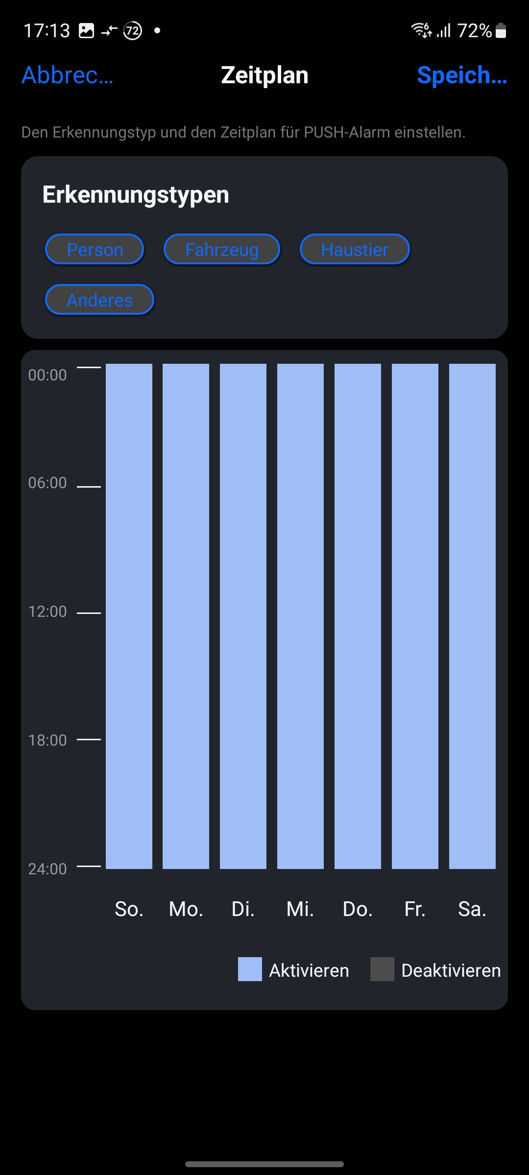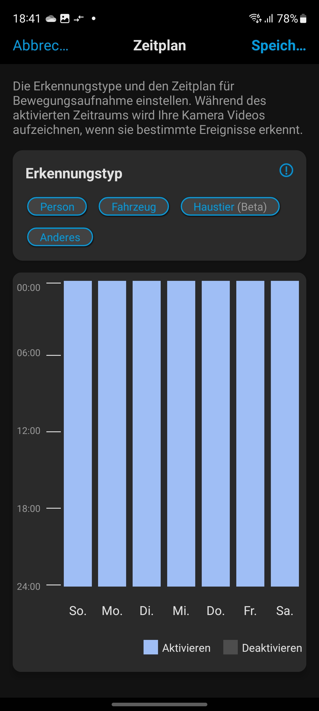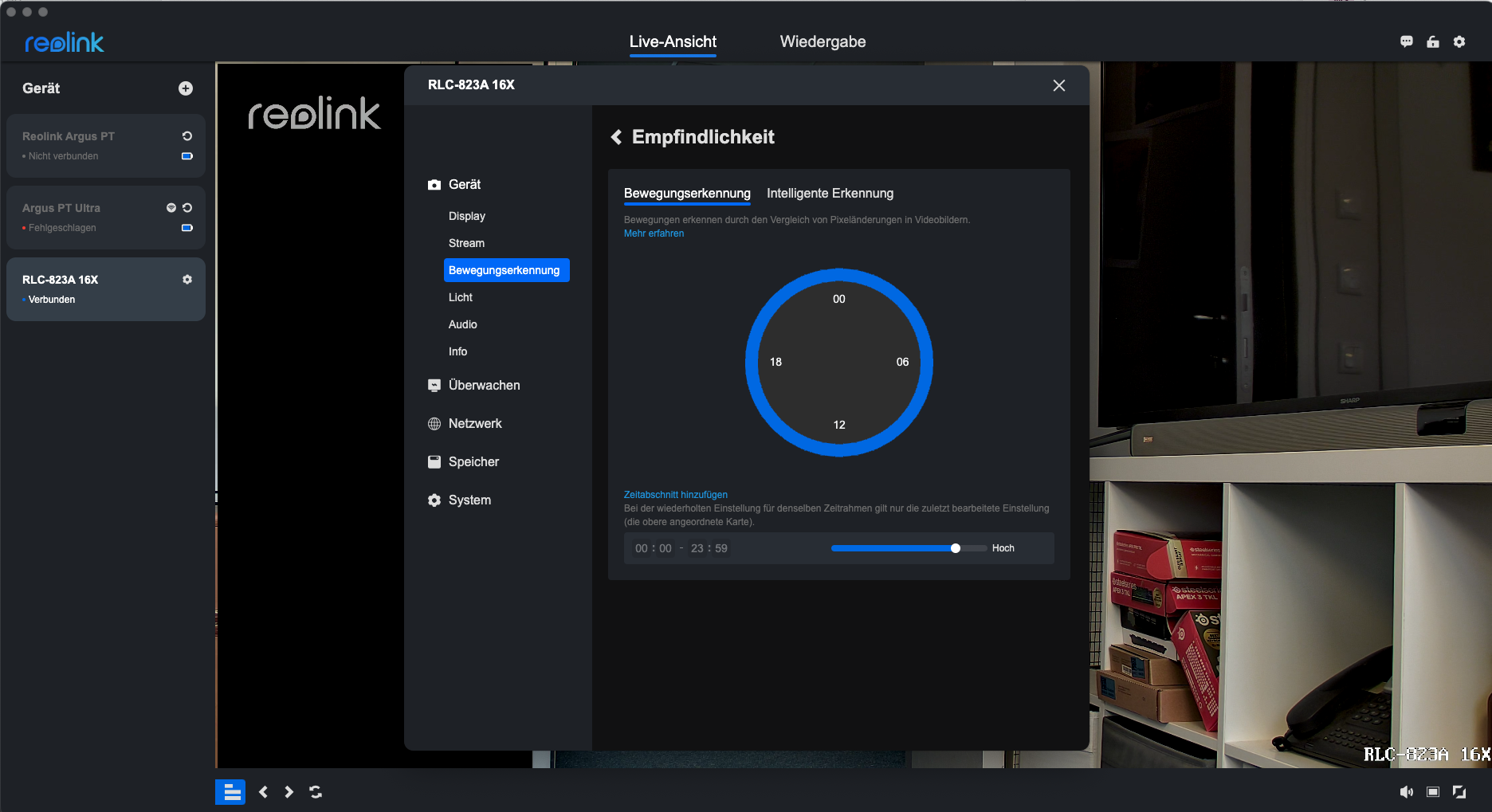 Die KI der Kamera differenziert bei der Bewegungserkennung zwischen Personen, Fahrzeugen, Haustieren und anderer sich bewegender Objekte. Letztere deaktivieren Anwender unter Einstellungen – Push – Zeitplan, um Fehlalarme durch zum Beispiel vorbeifliegende Blätter zu minimieren. Sollen auch Aufnahmen von diesem Objekttyp verhindert werden, deaktiviert man unter Einstellungen – Filmaufnahme – Zeitplan – Alarm unter Erkennungstyp die Option Bewegungserkennung. Dann startet die RLC-823A 16x Aufnahmen nur, wenn sie eine Person, Haustier oder Fahrzeug erkannt hat. Standardmäßig startet die RLC-823A 16x bei einer erkannten Bewegung eine Aufnahme. Wer statt der ereignisbasierten lieber eine kontinuierliche Aufnahme wünscht, aktiviert unter Alarm-Einstellung – Filmaufnahme – Zeitplan – Timer einen entsprechenden Zeitraum.
